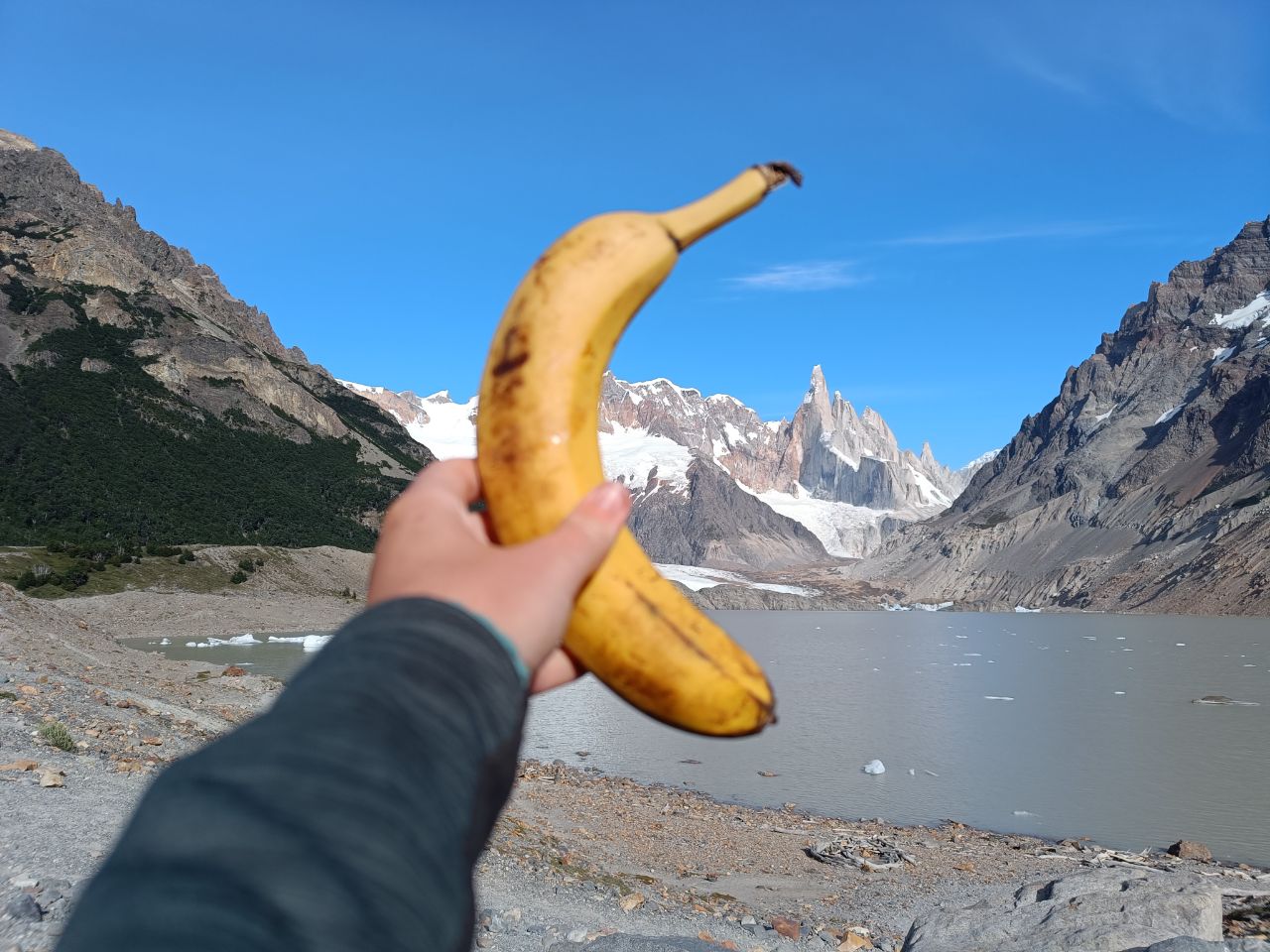 Day #1 we hiked the "long" path of 3.5 hours to Cerro Torre🦵. We pitched our tent in the sheltered forest next to the impressive three-peaked mountain (banana for scale: 2 kms higher than our position). For the rest of the day we had enough time to stare at the peaks and let the last clouds encircling the peaks disappear🌫️. Guess what; it did not happen.