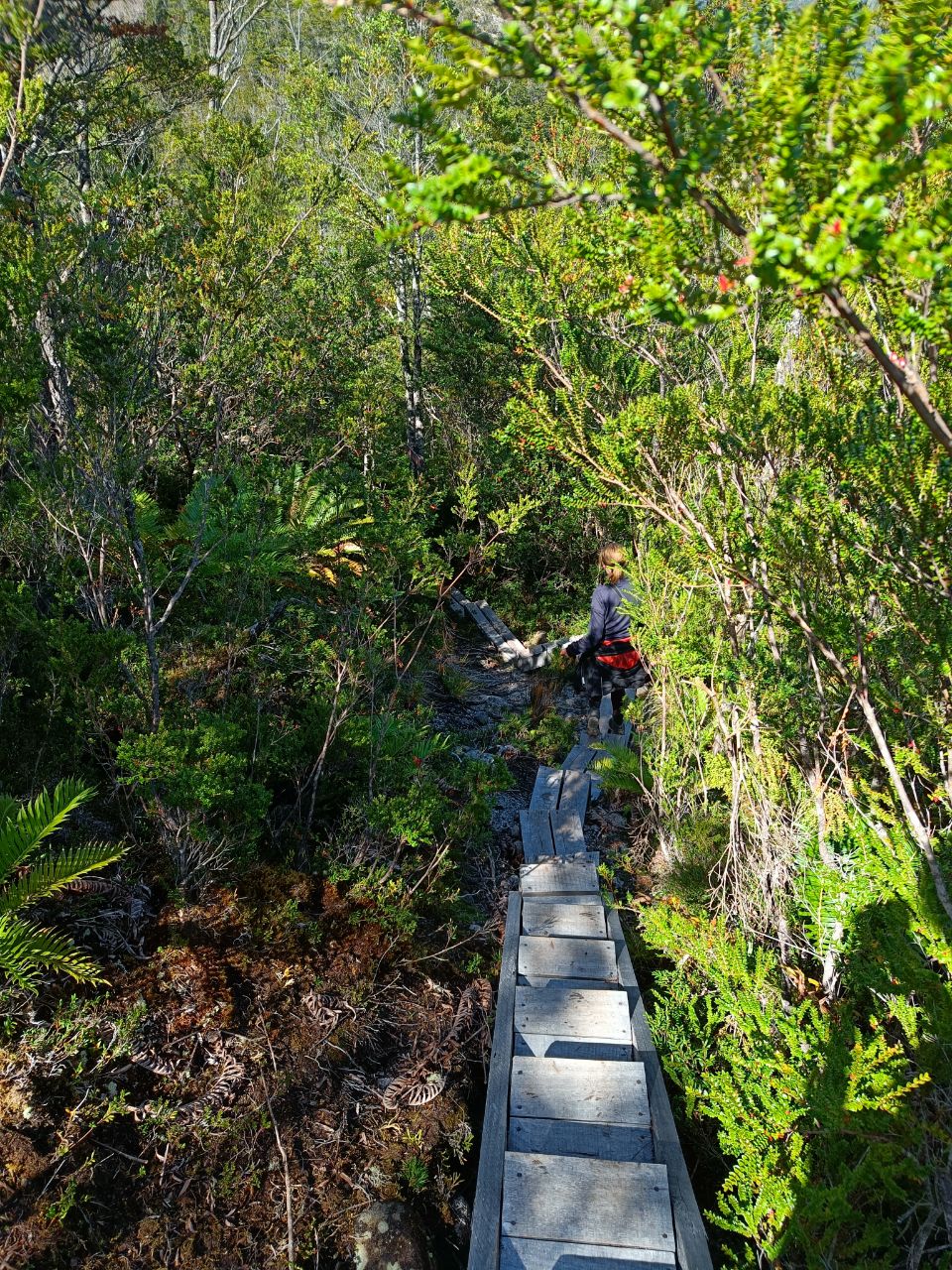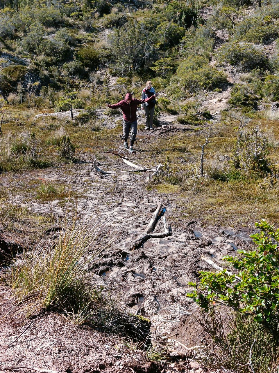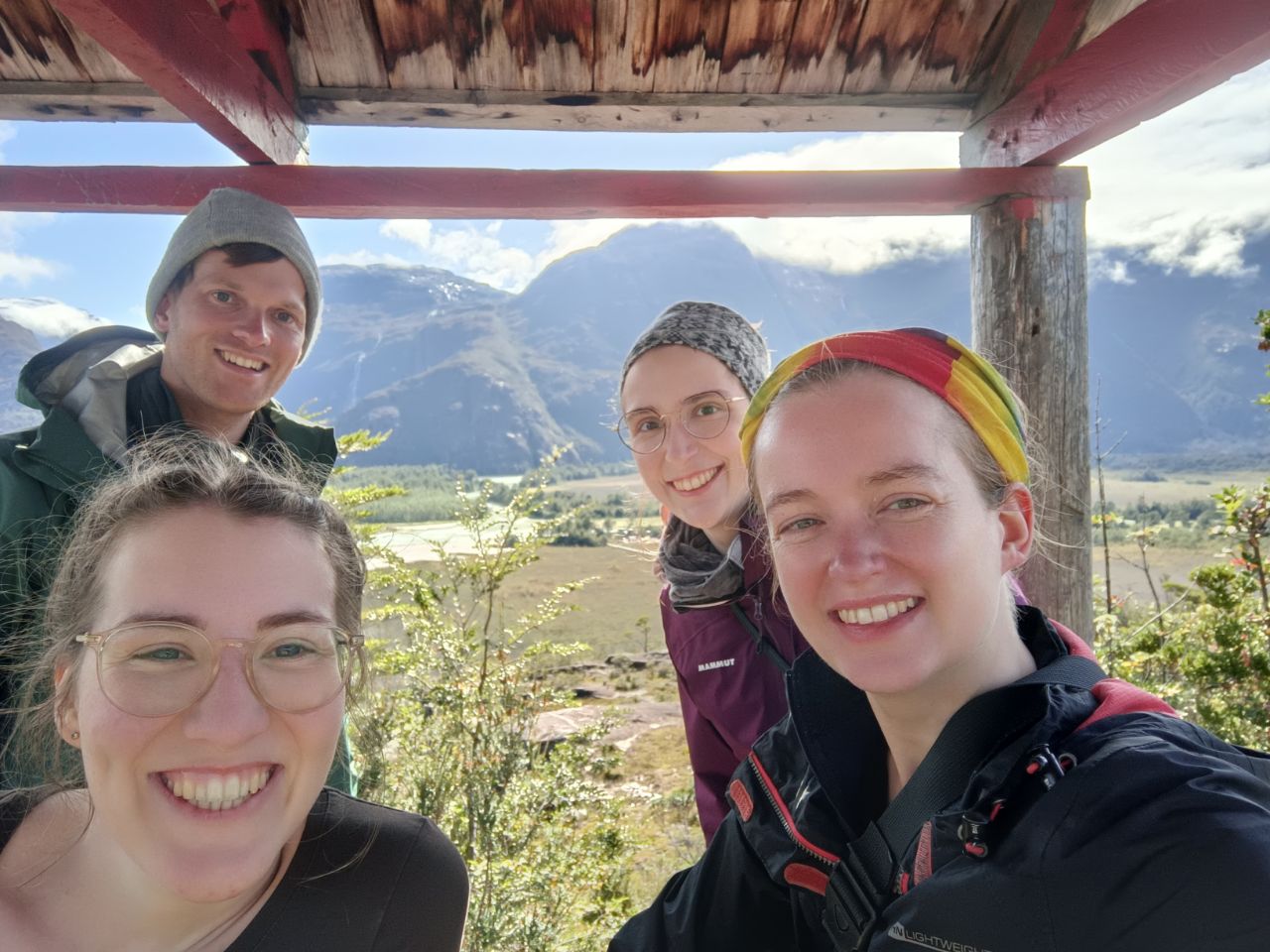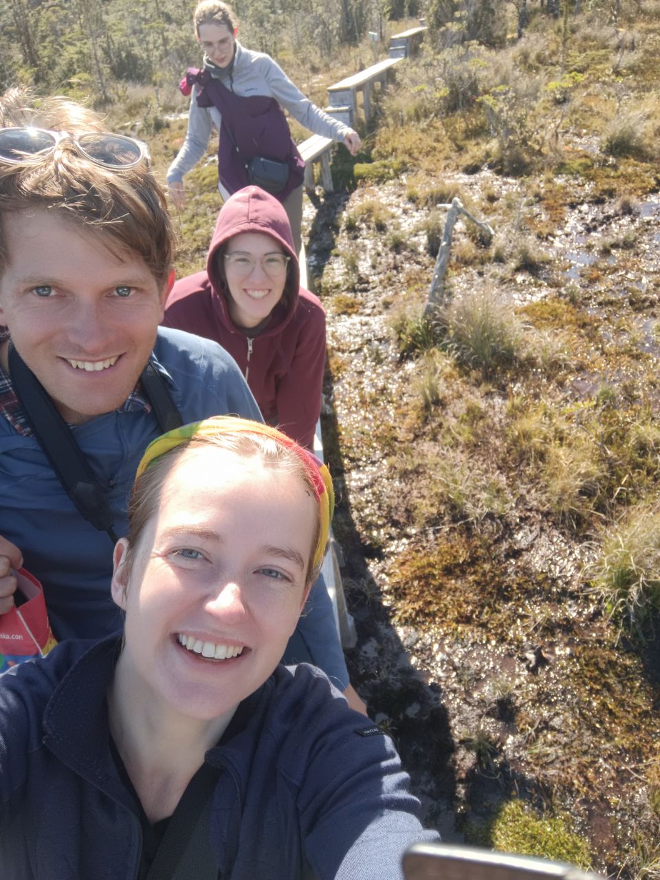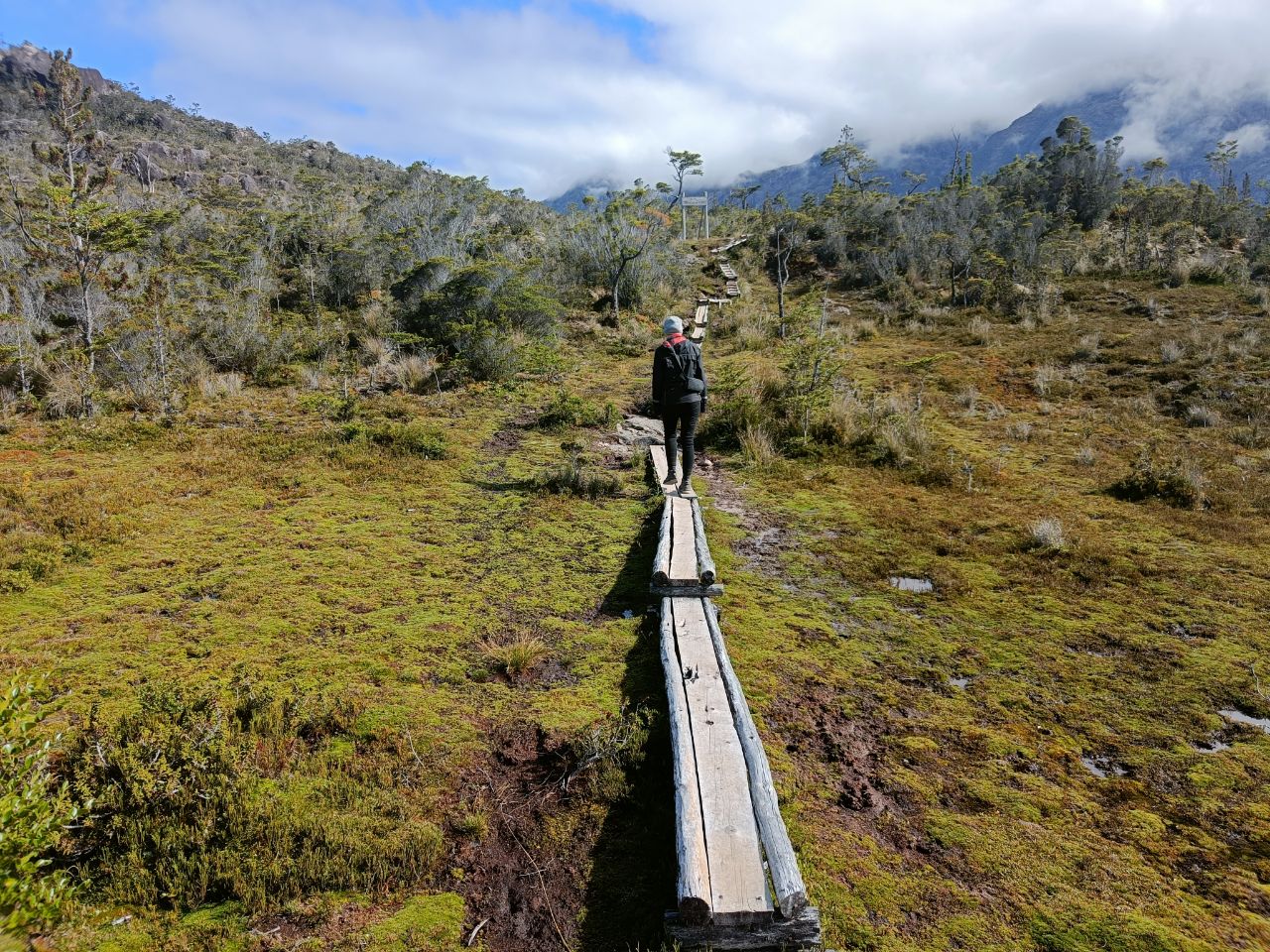 We discovered that the bus onward to Cochrane only left at 16:00, which gave us plenty of time to explore the village and it's surroundings. We headed off to the mountains behind the village, to see the boardwalks from above. The first part of the path was well maintained, with wooden gazebos and beautiful trails. Afterwards, it quickly turned into a fun swampy mess (on a mountain?!), which forced us to jump from rock to rock, grass to moss and fallen tree to fallen tree. It was great fun!