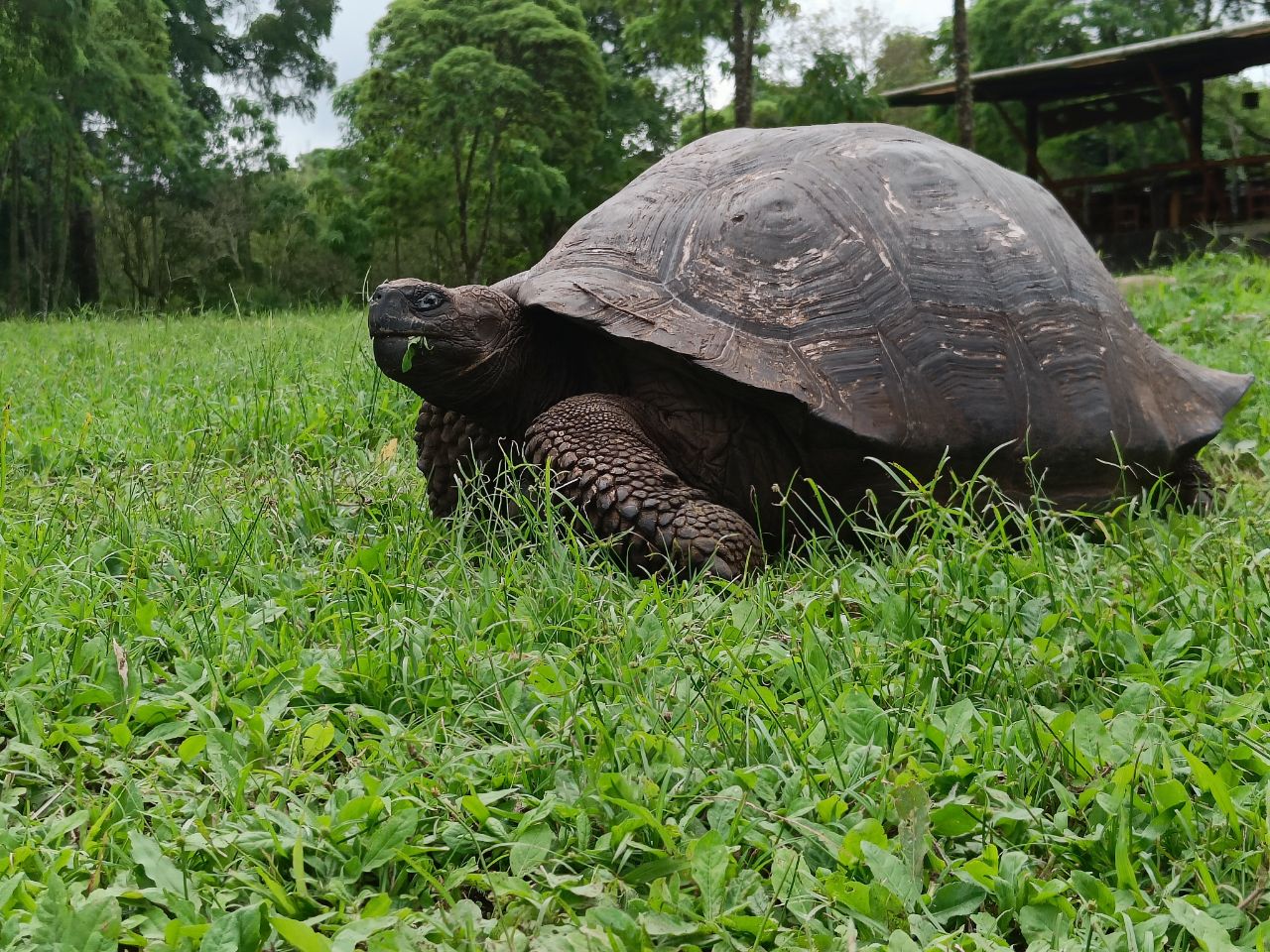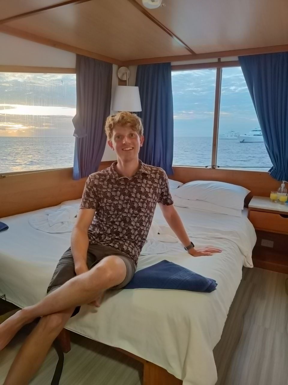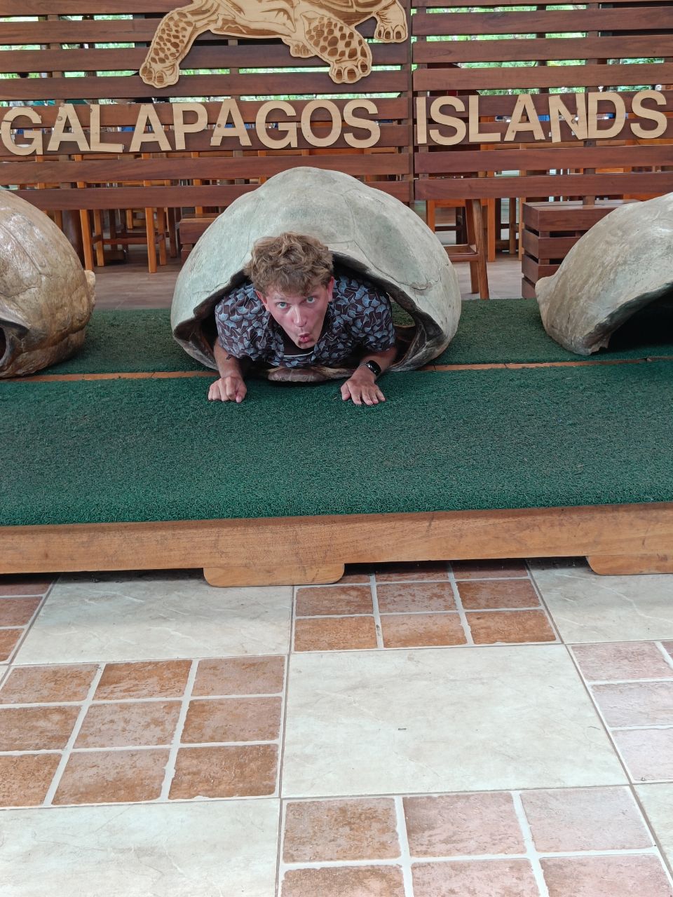 You remembered that we like boat trips? 🛥️ Here we are again! (With a bit more luxury, better food and enough sources of entertainment!) There is no better way to explore the Galapagos than by boat, so we boarded the Beluga today! 🐳 -the upcoming steps will each highlight a day of the cruise, especially for ourselves to remember ☺️- For the start of the cruise we go high into the highlands. This is where we stand eye to eye for the first time with the famous animal of the islands: it's the giant tortoise 🐢! They used to be almost killed to extinction -💡back in the days they restocked the ships with these reptiles alive lying on their back, as they can survive without food for months - but ever since consumption has been forbidden, the conservation centres have succeeded in repopulating the islands. 💡All areas inhabit different tortoise species, the rocky lava flows or water inbetween the islands made it impossible for the shielded animals to travel these distances. This made them evolve into different species. 🤠 After a visit to the tortoise range, we also brought a visit to the Charles Darwin research centre🧐. We met the mummified remains of lonesome Jorge, the last one of its species. Sadly, no mate was ever found and in 2012 he took his last breath. Thereafter, it was finally time to meet our new home for the upcoming days!🛥️ We have the best cabin on board, windows covering all the outer walls (instead of the portholes on the deck below us). The day ended with beautiful sightings of a Galapagos shark encircling our boat! 🦈