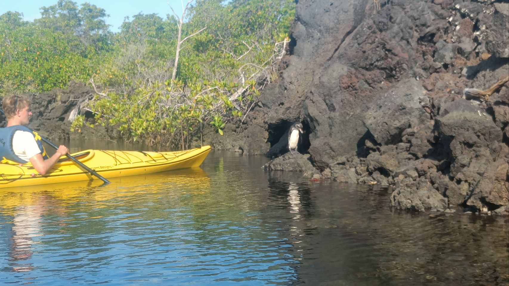 After another rocky night navigating all the way around the south corner of the island, we woke up to the beautiful lava landscape of western Isabella this morning 🌅. During the landing, we encountered several types of lava (all of course with Hawaiian names); the more ropy pahoehoe lava and aoao lava, which as the name suggests, is rather sharp and painful. We again saw beautiful fish, playful sea lions and majestic sea turtles during our snorkeling. However, the visibility wasn't that good today (we get spoiled) so no nice pictures of this session. This was also our first encounter with the super cute Galapagos Penguins! 💡The northern-most pinguïn species! 🐧 In the afternoon we went kayaking in a mangrove🛶. It was a magical place, where we could explore all kinds of coves and secret hideouts. We found a penguin on the rocks and could almost get into touching distance. It is incredible how relaxed the animals are around humans! After another delicious dinner, it was time for an early night. More exploring awaits us tomorrow! 🤠