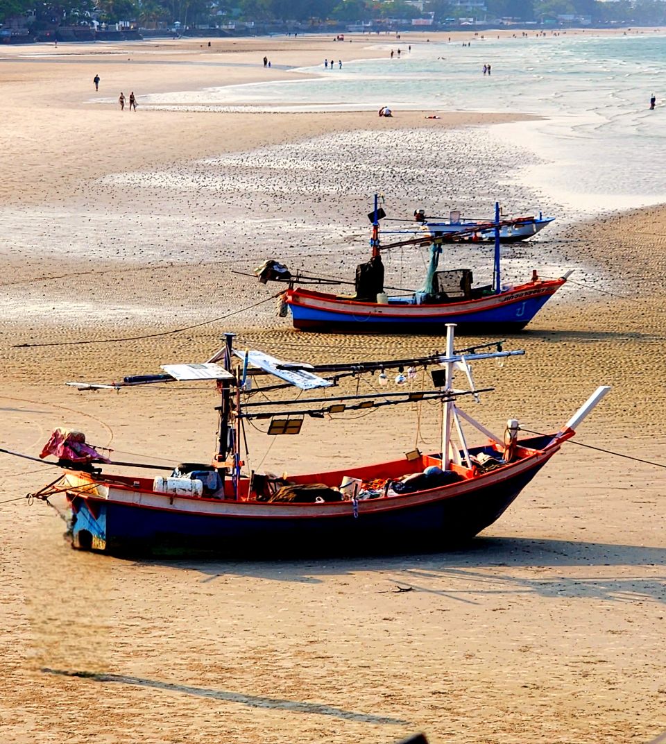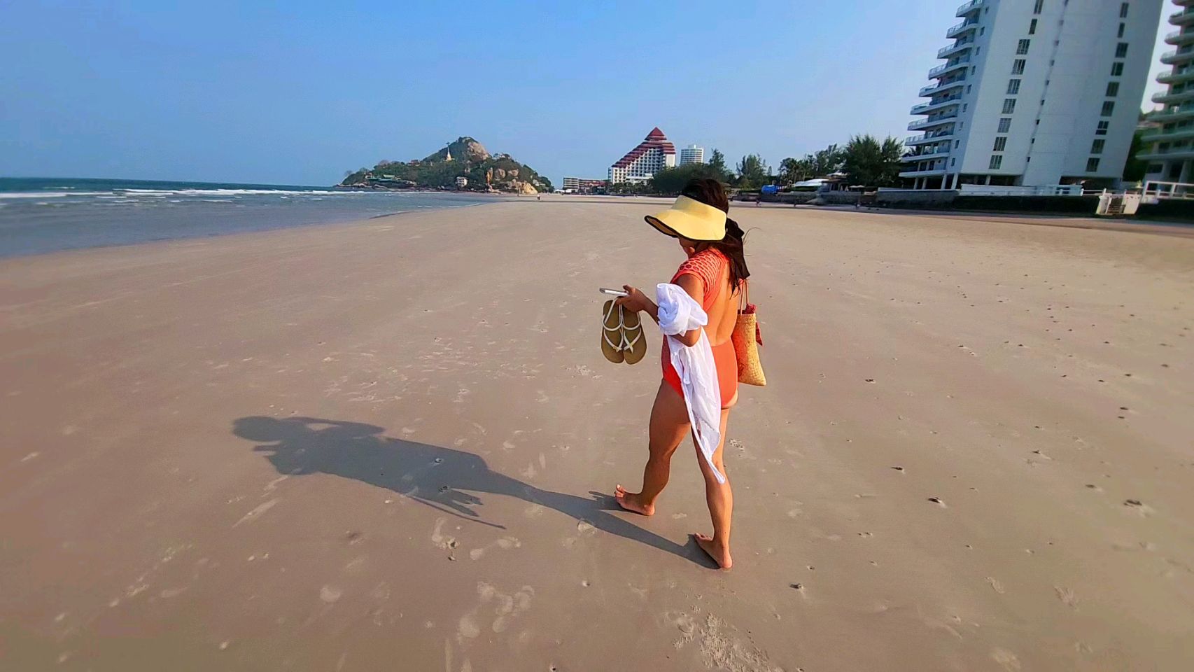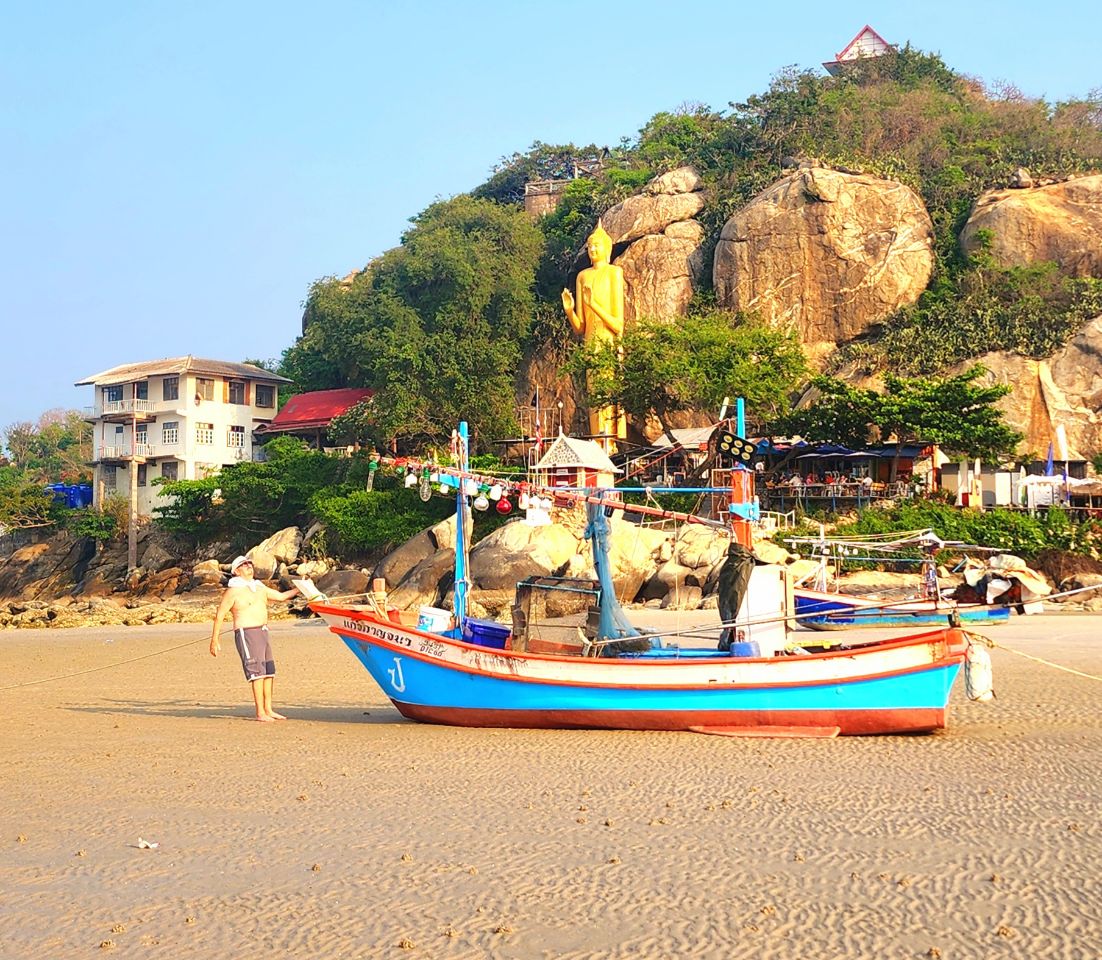 Flat and lond it is easy to walk. The water is warm and shallow. We walk towards a golden Buddha on a hill in the distance after a swim.