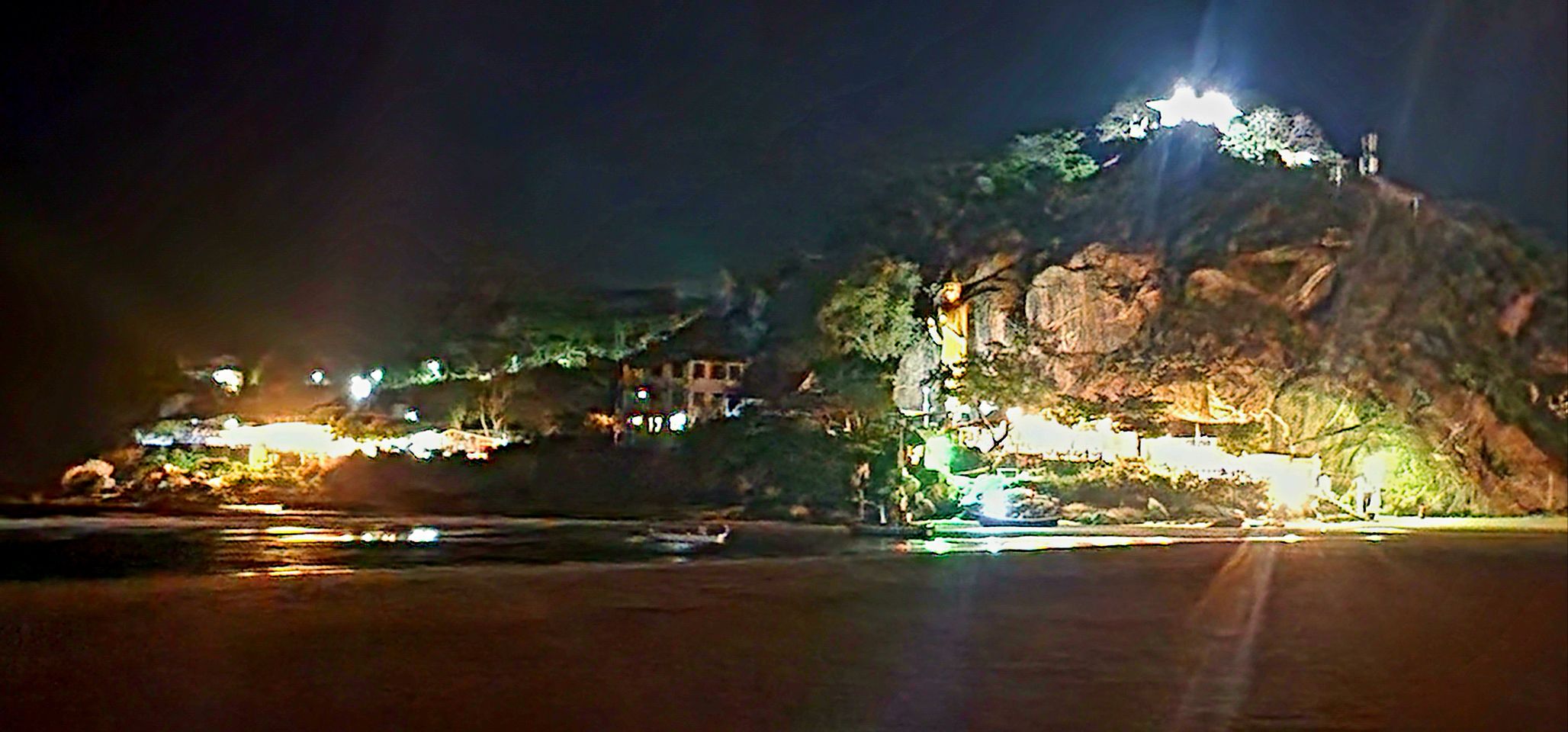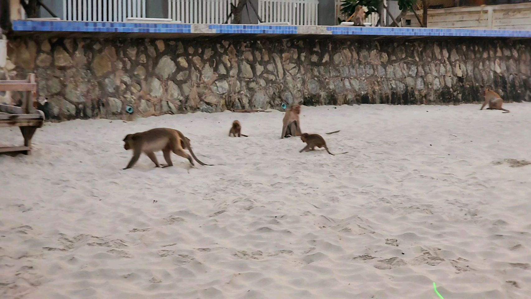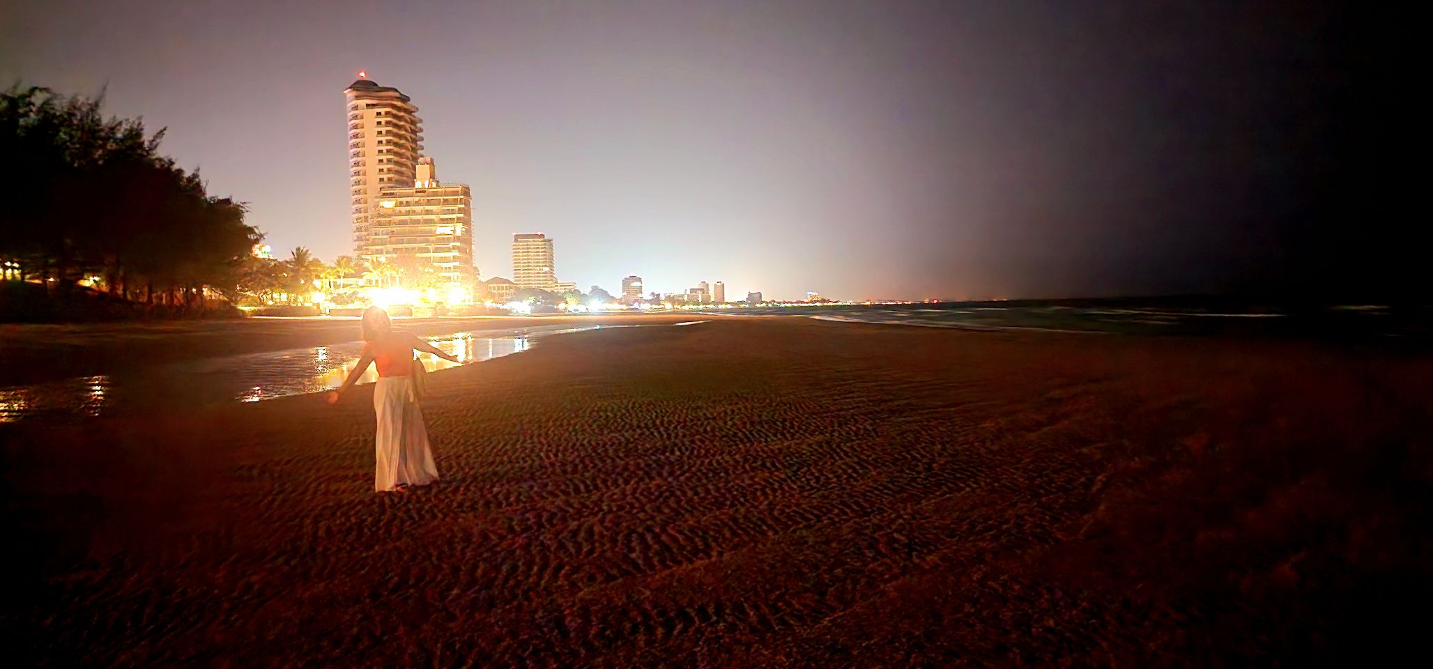 Flat and lond it is easy to walk. The water is warm and shallow. We walk towards a golden Buddha on a hill in the distance after a swim.