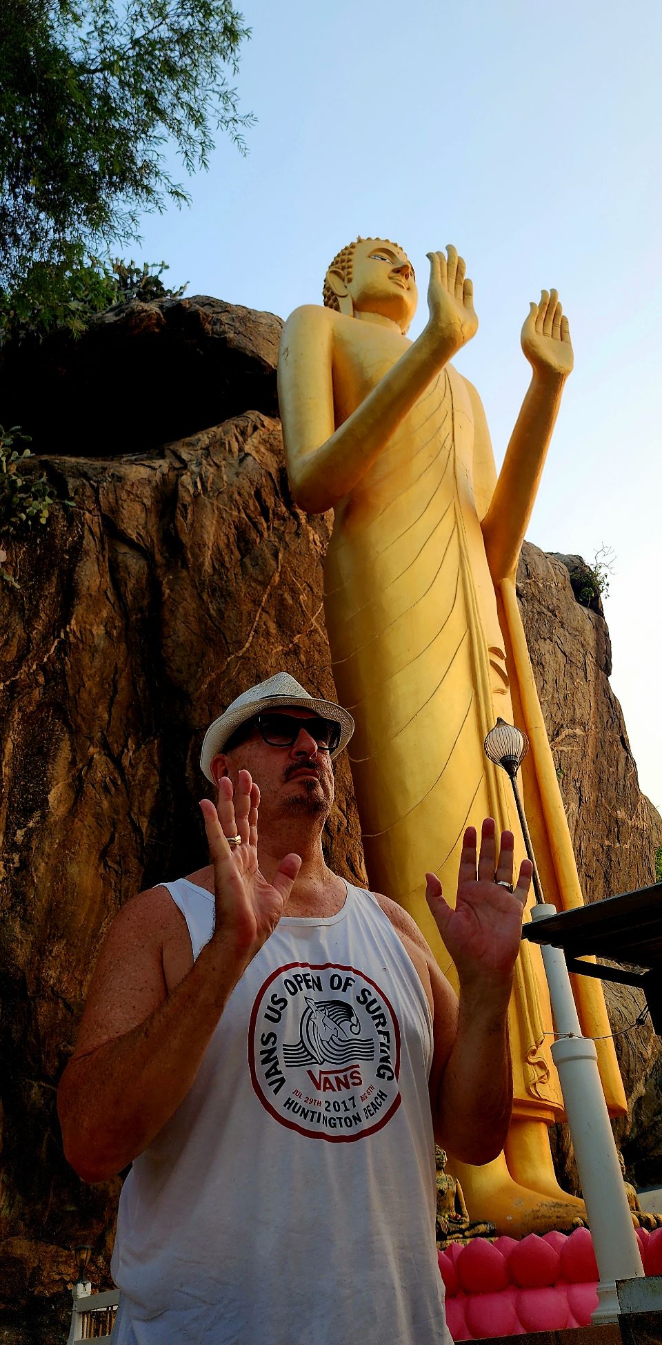 Down the beach we find a golden beach bum. We hang out, share coffee, and give him a tip.