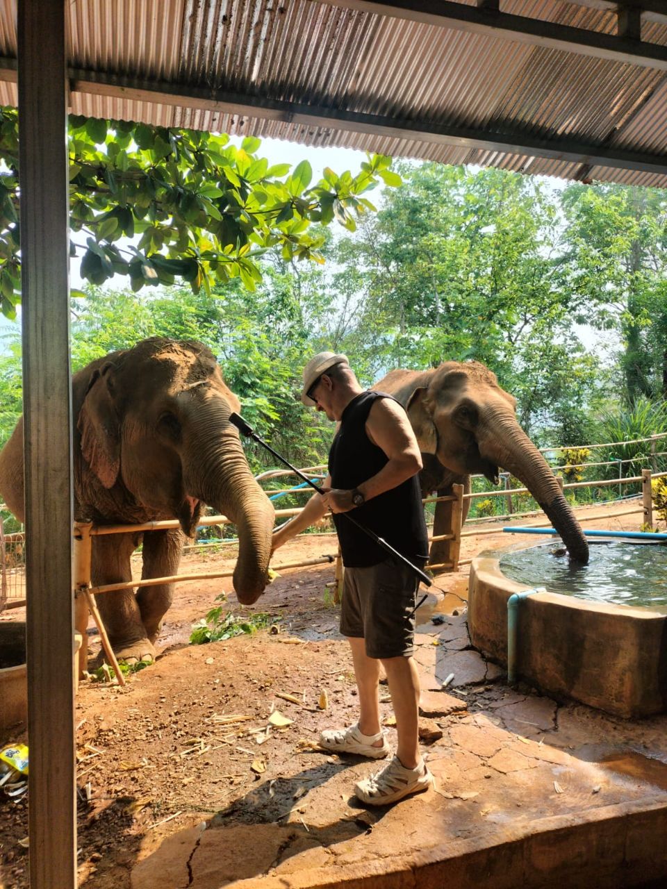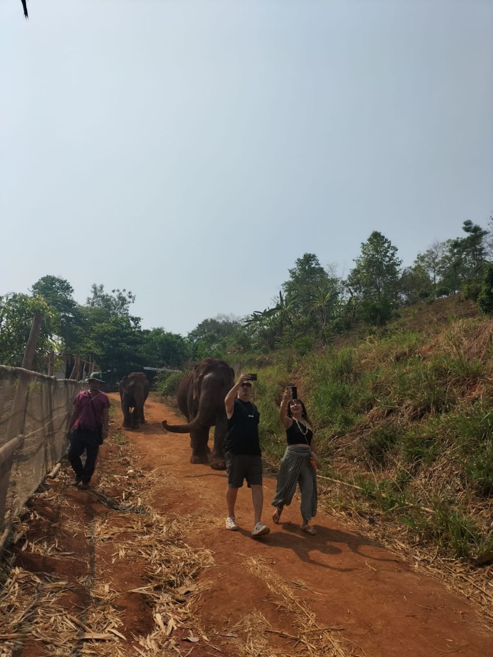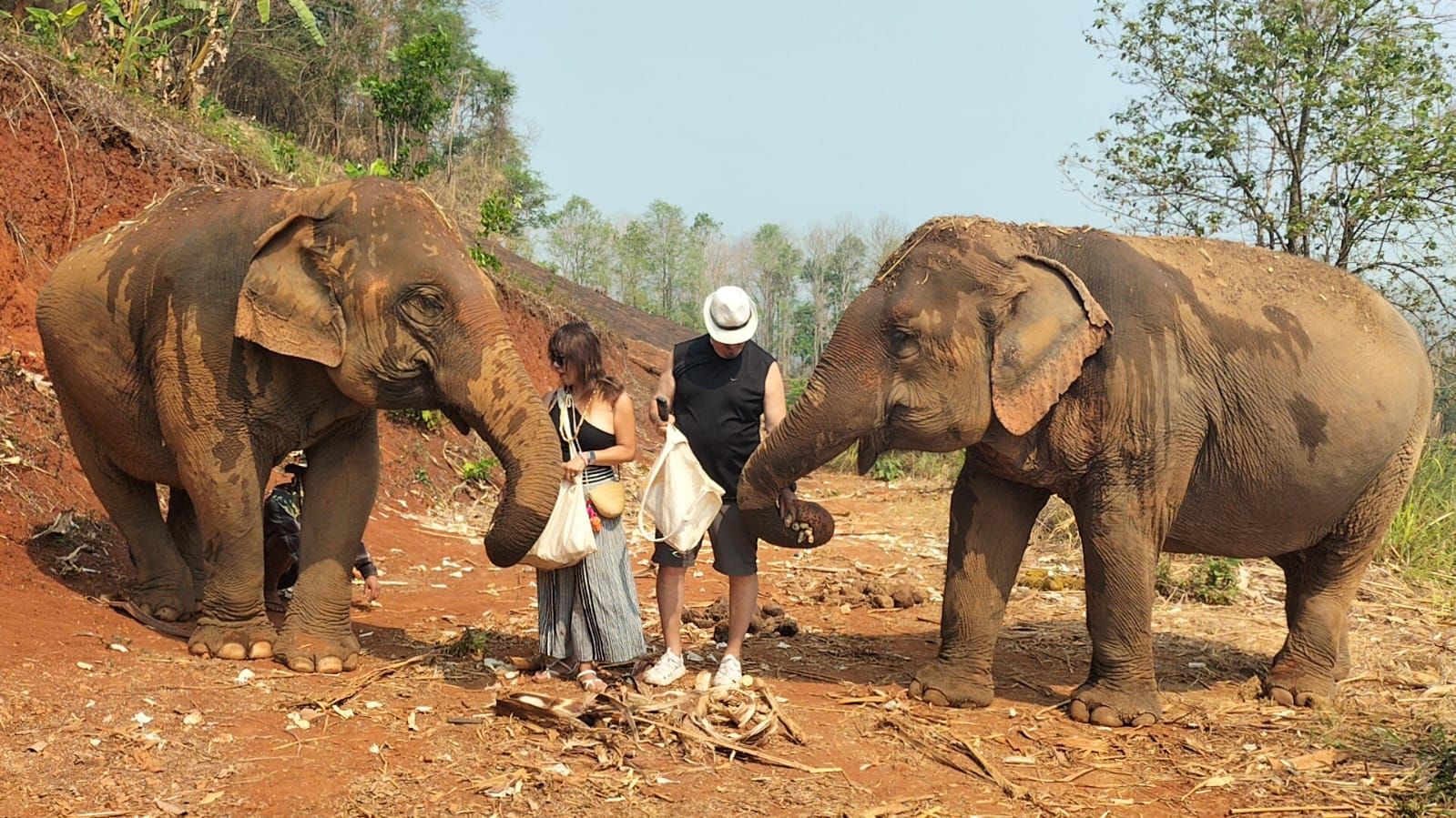 Hannah and I are floored by a morning of just the two of us and two elephant friends, Papaya and Tomato. Gentle eyes watch us behind rough skin. We feed Papaya and Tomato "sandwiches" of papaya, corn, sugar cane, and watermelon. They gently take the food from us with their hand-like trunks. Their full, deep breaths reverberate.