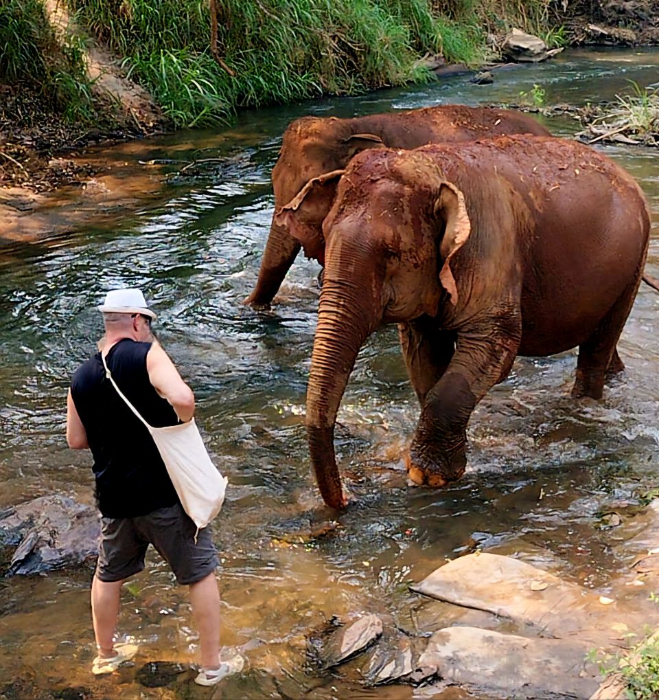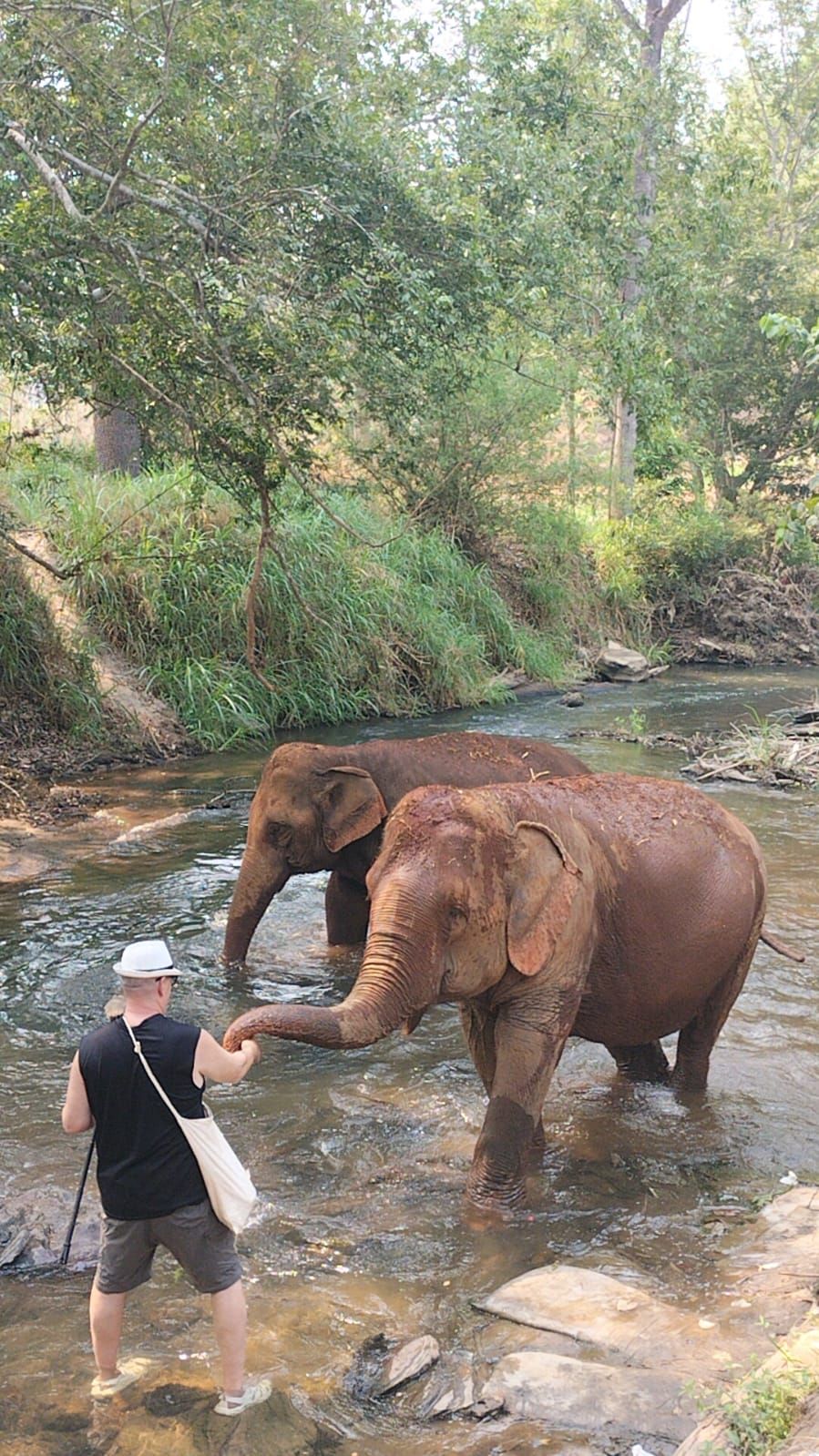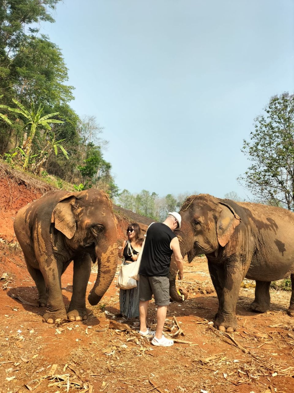 Hannah and I are floored by a morning of just the two of us and two elephant friends, Papaya and Tomato. Gentle eyes watch us behind rough skin. We feed Papaya and Tomato "sandwiches" of papaya, corn, sugar cane, and watermelon. They gently take the food from us with their hand-like trunks. Their full, deep breaths reverberate.