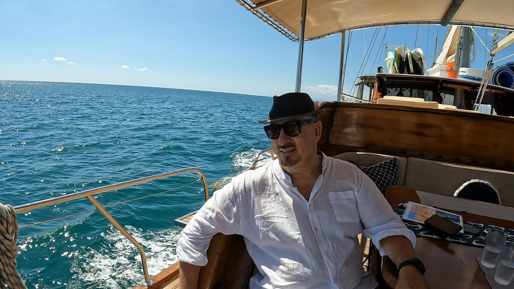We take a three-masted sailboat into the Pacific on Frank's special day, 69. His first mate takes the pirate into the most beautiful sunset of his life.