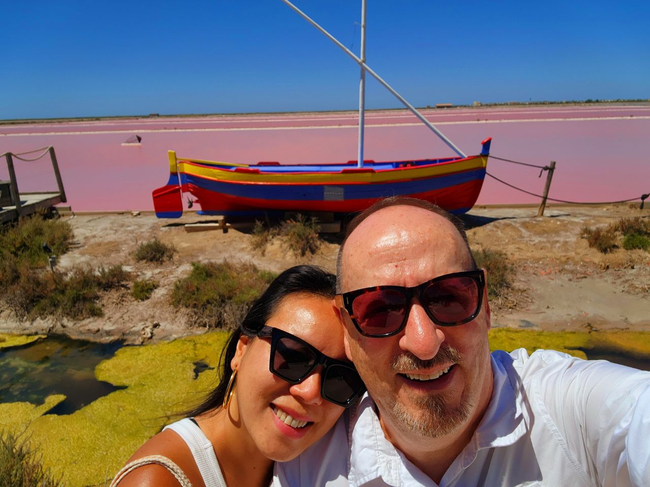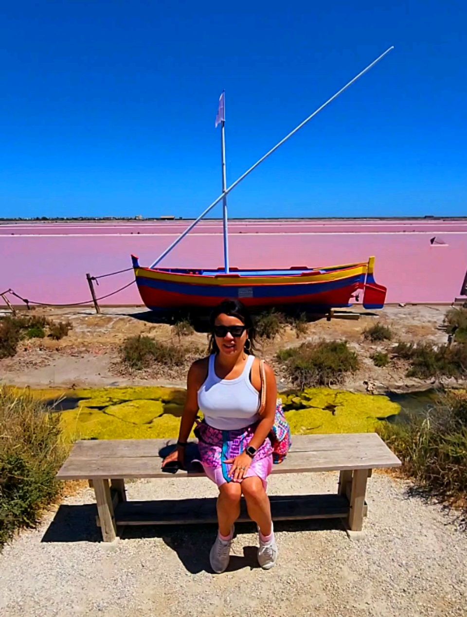 We try a French Mediterranean beach. Hannah and Frank find a windy wide swath of sand near the old fishing village of Gruissan then bright pink salt flats with a surreal tint.