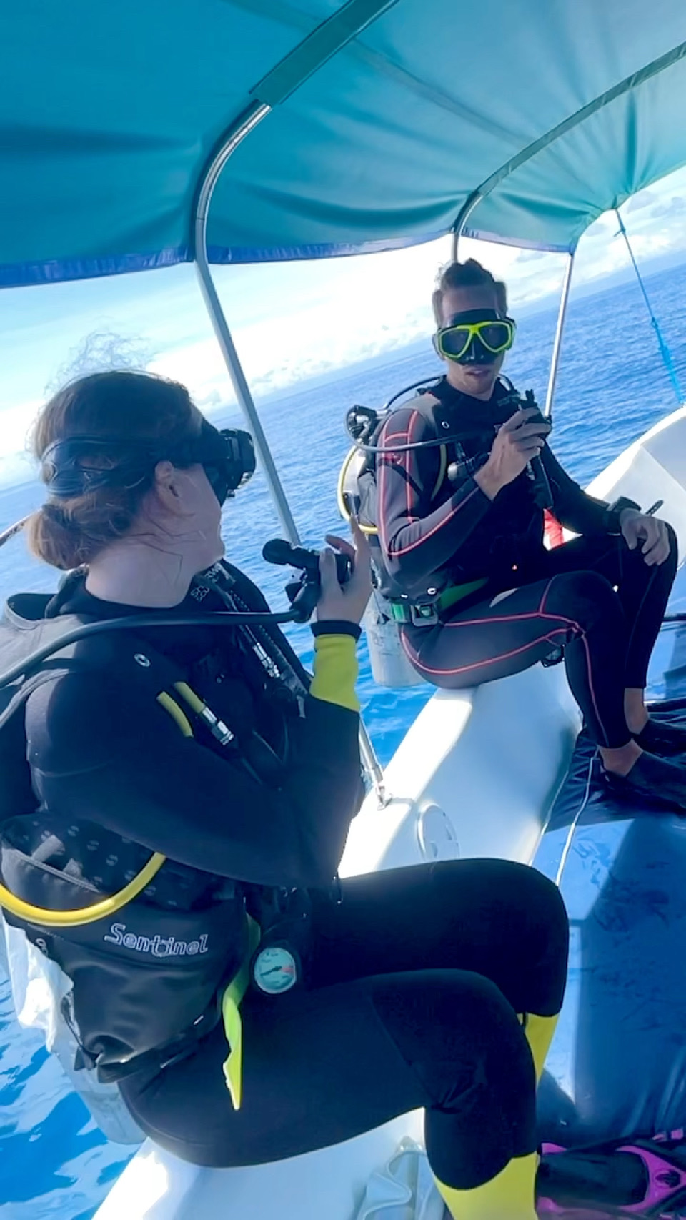Equipment gecheckt, alles angezogen und Zack hieß es rückwärts ins Wasser purzeln. Von kleinen Booten geht das nämlich nicht anders. Angekommen unter Wasser war die Sicht gigantisch weit - das ist unter Wasser überhaupt nicht üblich. Nach anfänglicher Eingewöhnungsphase konnten wir den Tauchgang mehr als genießen, denn wir kamen aus dem Staunen nicht raus. Ein Highlight folgte dem anderen. Hier die erste Schildkröte, dort die Zweite, dann zahlreiche Fischverbände, Zwischendurch Muränen und Hummer, dann der erste Weißspitzenriffhai!!, dann der Zweite, und immer wieder ne neue Schildkröte und so weiter 🐢🐠🦈🐡🪸