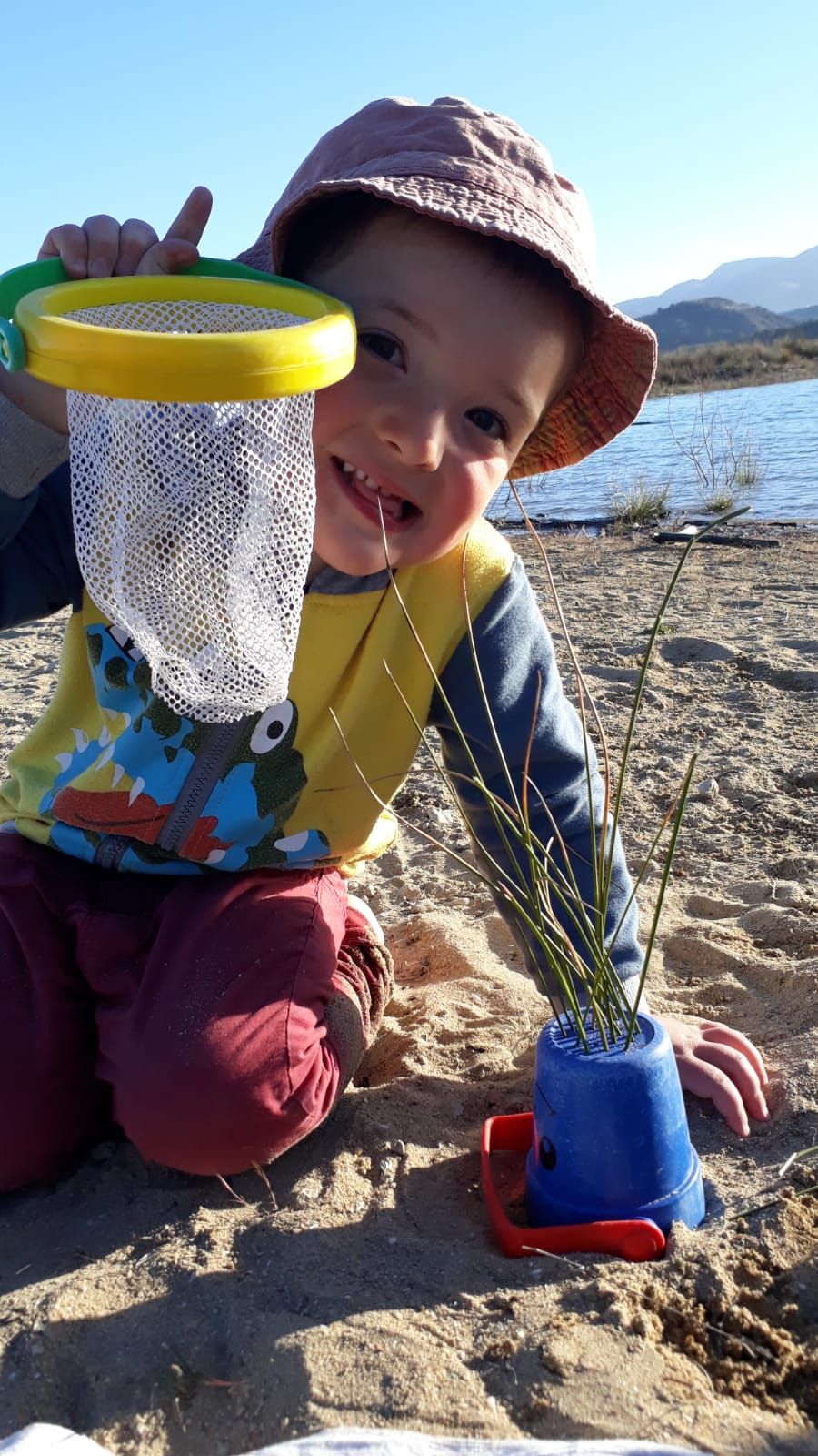 Journée très ensoleillée, sieste et balade. Louen dessine et écrit dans le sable, Yuna s'amuse avec le seau. Nous profitons du bon air!