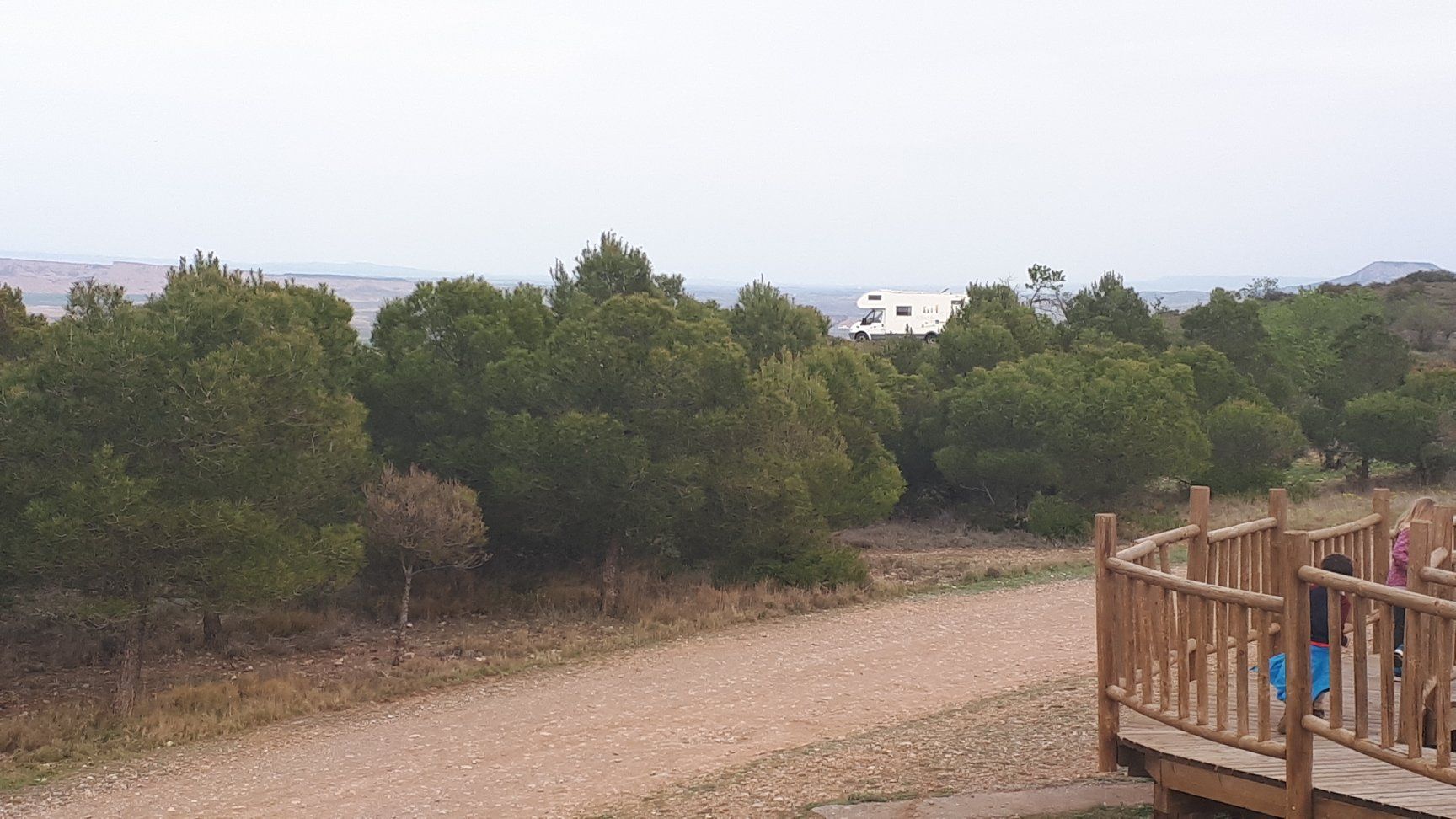 Ce soir, spot tranquille sur les hauteurs, avec un beau point de vue au Mirador de la Ribera. Au loin, on aperçoit les Pyrénées enneigées!