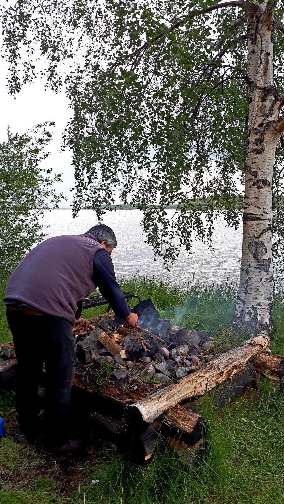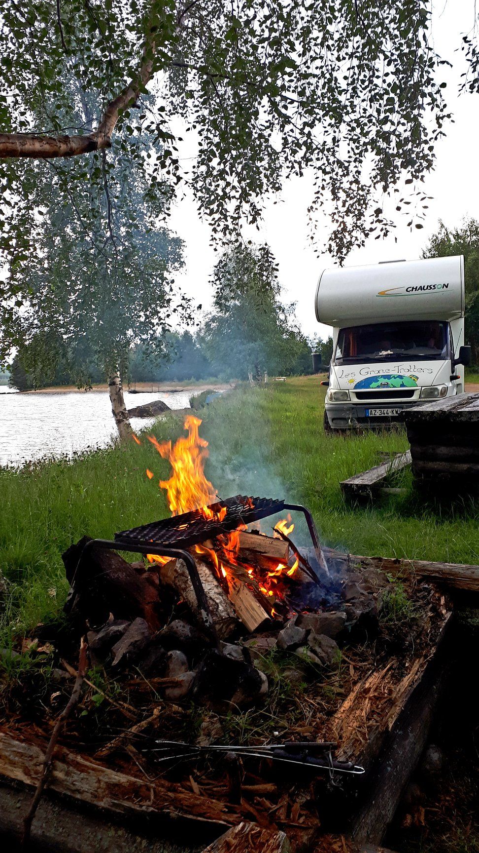 Après une longue après-midi à chercher le spot idéal pour l'anniversaire de Yuna demain, nous sommes au bord d'un lac avec la possibilité de faire du feu. Il y a une sorte de plage à côté. Le temps est maussade ce soir. Espérons que demain, le soleil sera revenu, que le poisson mordra et que les moustiques ne nous dérangerons pas!!! Ça fait beaucoup de conditions!!!😏 On devient exigeants🤣! En attendant, pour se réchauffer et griller les saucisses, Fred prépare le feu!😁