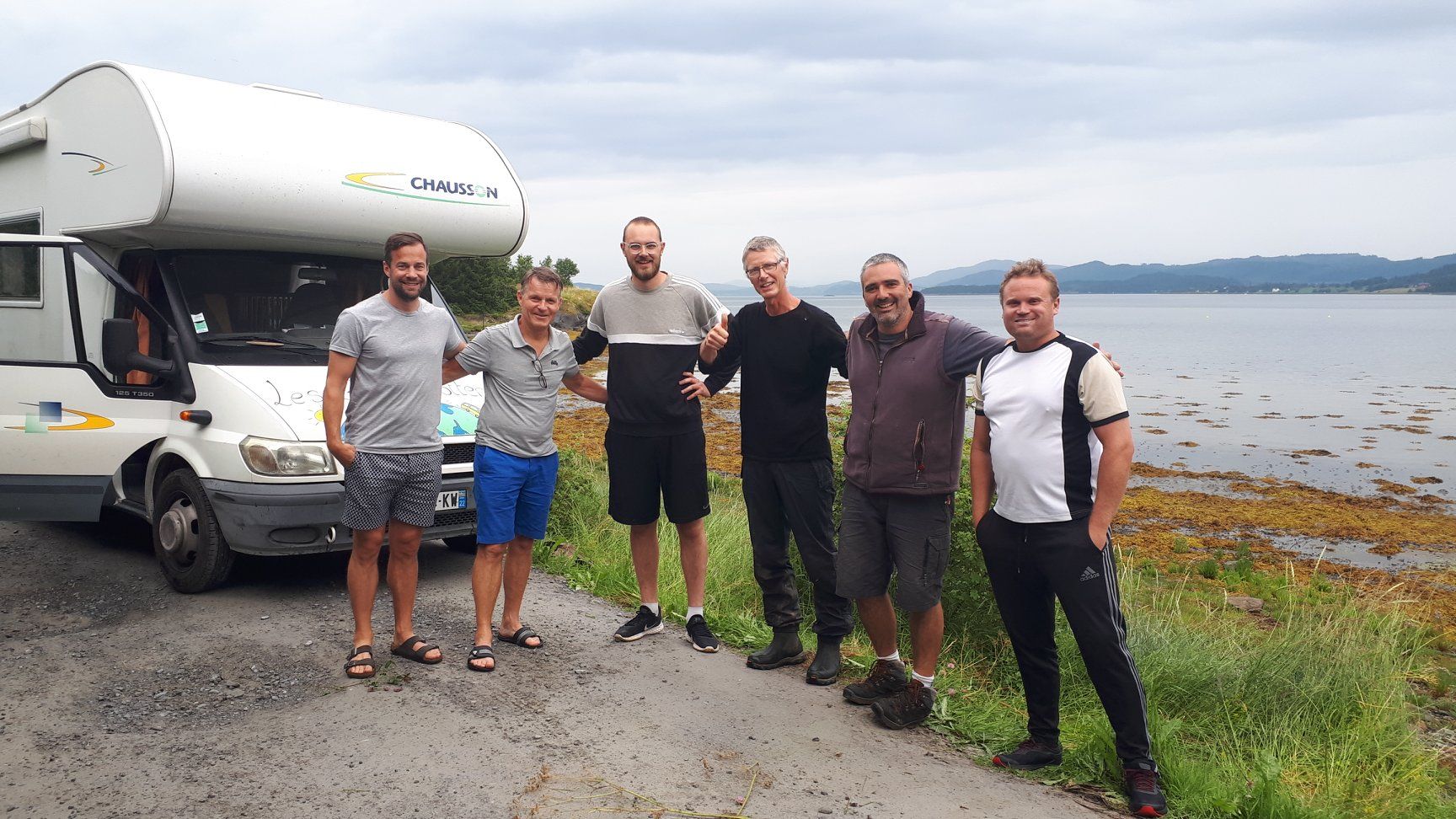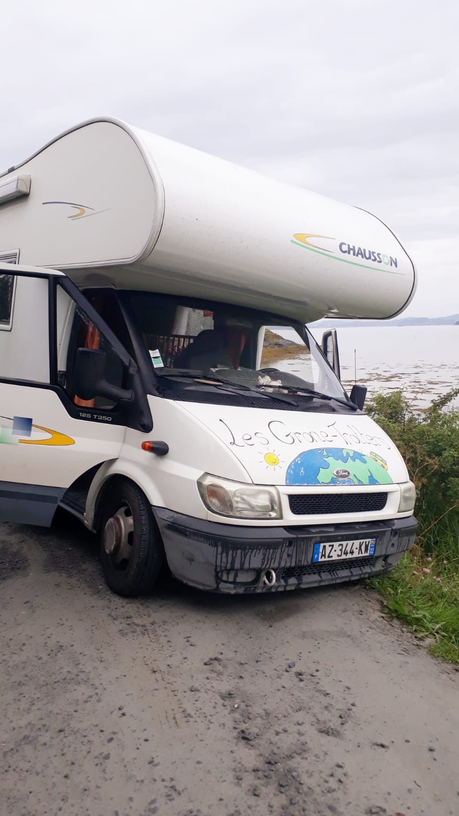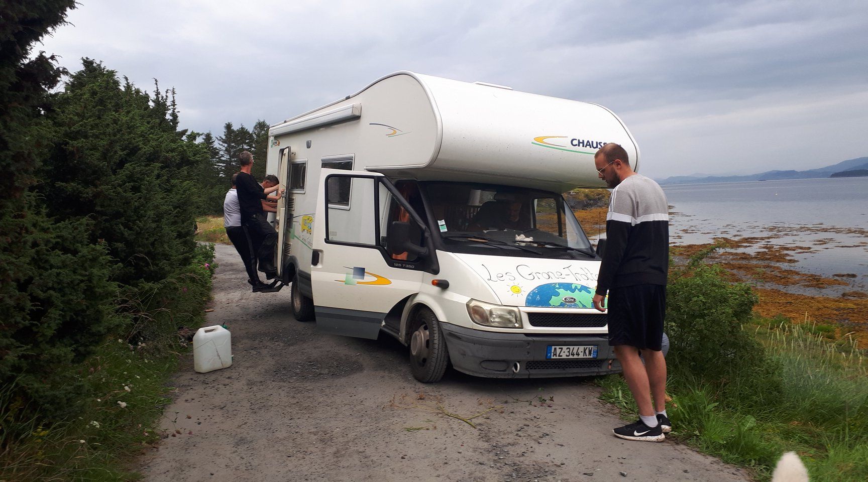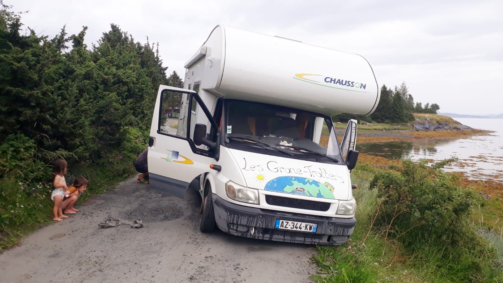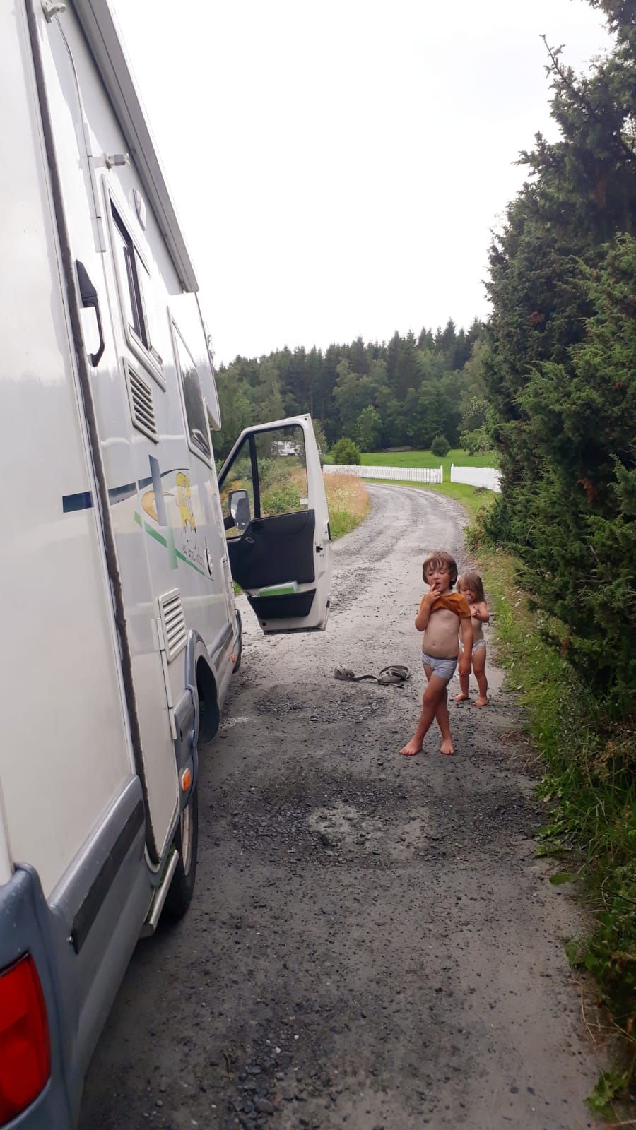 Ce spot nous plaisait bien avec une petite aire de jeux, des sentiers de balade, au bord d'une plage et même des wc et point d'eau. Finalement, la pluie et les odeurs nauséabondes à marée basse nous ont fait changer d'endroit, direction sous un pont non loin de là, recommandé par un norvégien pêcheur. On repart par le petit chemin étroit, en regardant aux alentours sans grande concentration... et là... petite sortie de route pour Pumbaa!!!! La roue est dans le vide, Pumbaa menace de tomber... grosse frayeur! Très vite, plusieurs norvégiens viennent prêter main forte et grâce à eux, nous réussissons à le remettre sur la route! Ouf, plus de peur que de mal! Merci pour cette belle solidarité les norvégiens😊👍