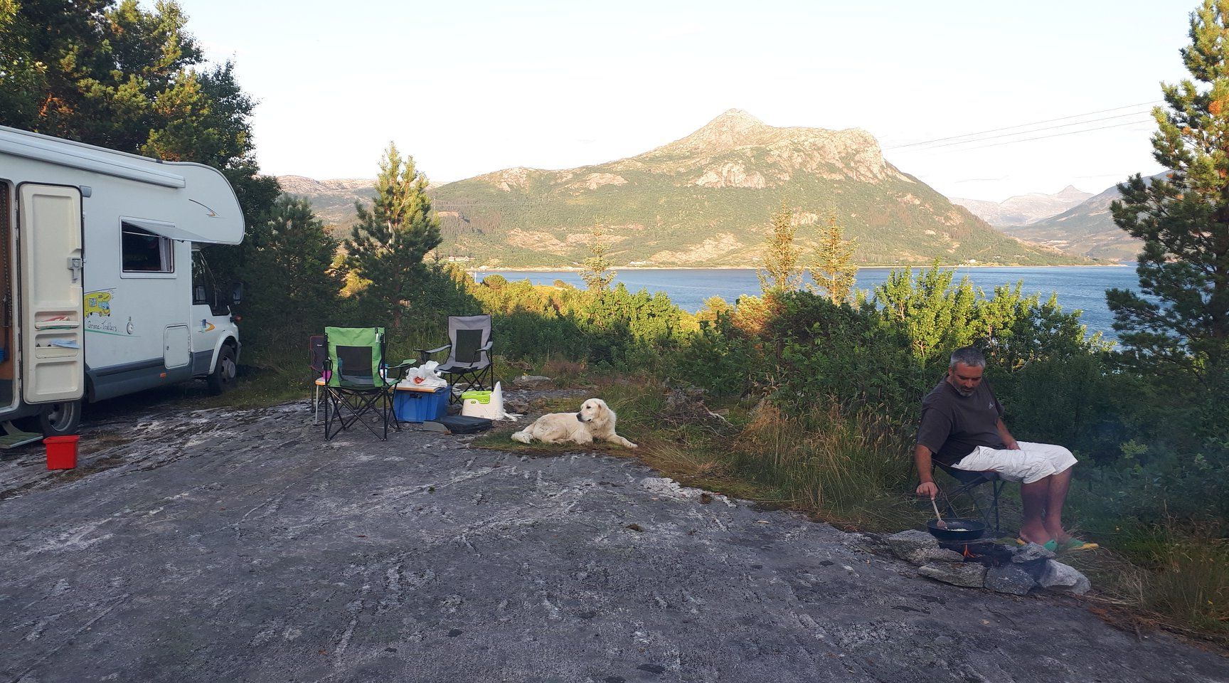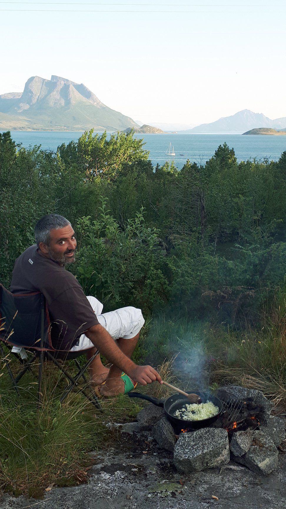 Ce soir, le spot nous offre une vue splendide sur le fjord. Nous partons Ć la recherche de bois pour notre feu et nous trouvons pleins de myrtilles sauvages pour notre dessert! Miam, encore un bon repas que nous permet dame nature! Maquereaux et myrtilles!!!!