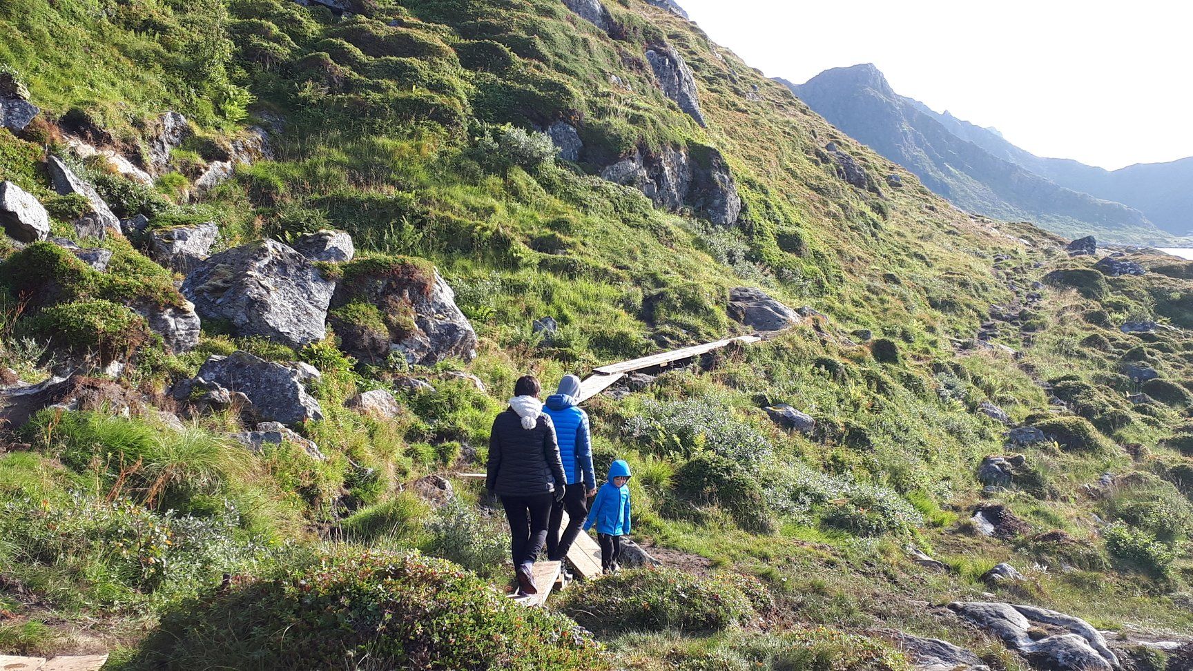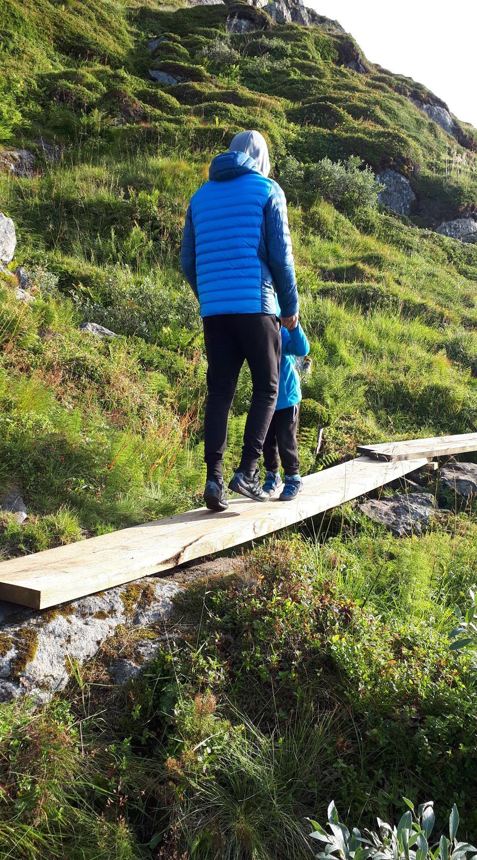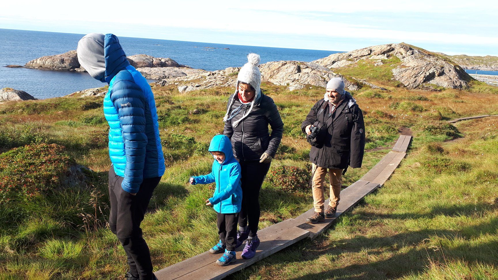 Belle balade avec Vero et Simon sur une partie du sentier de la reine reliant Stø à Nyksund. De parties de cache-cache en trampoline sur les lattes de bois suspendues, le temps passe vite, on s'amuse!!!