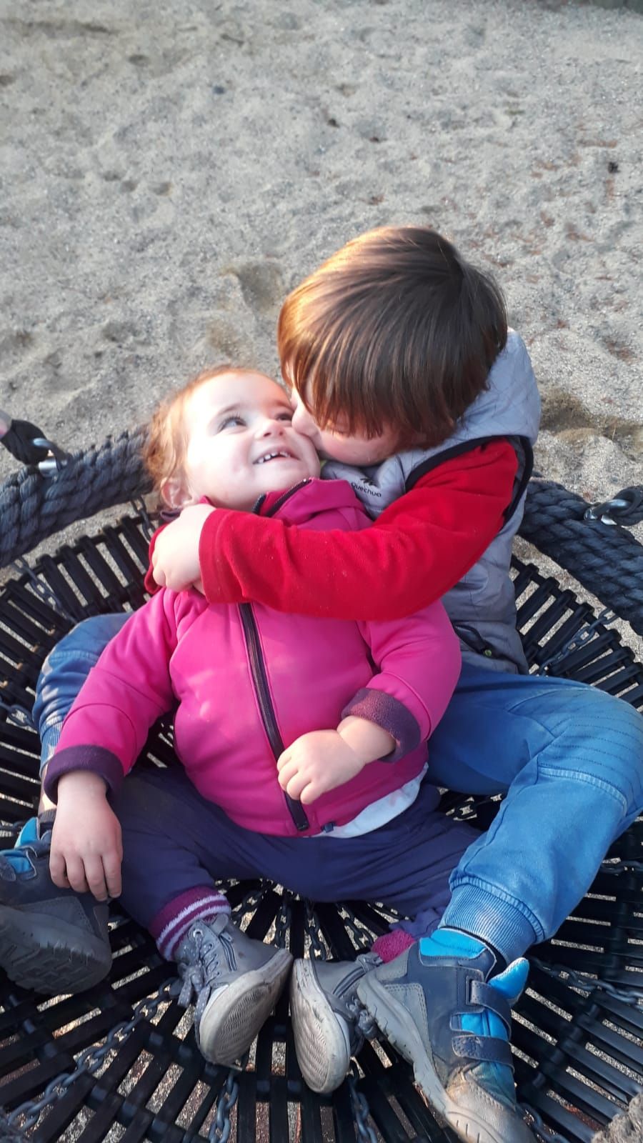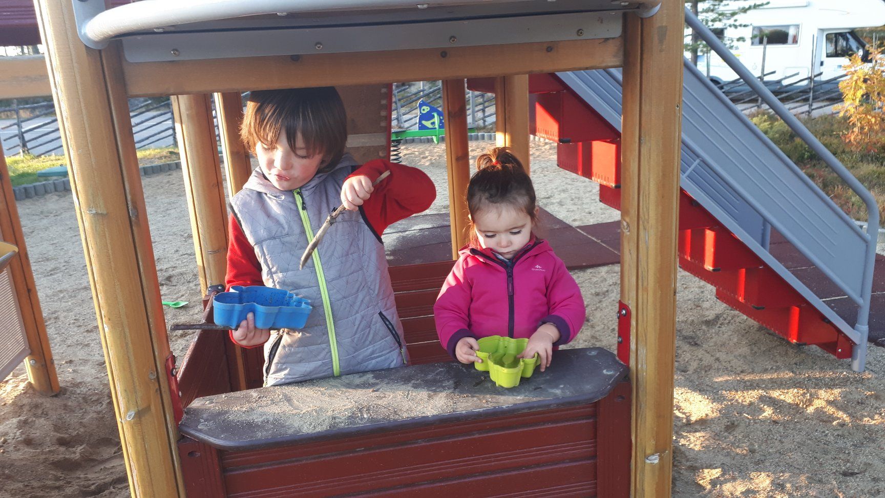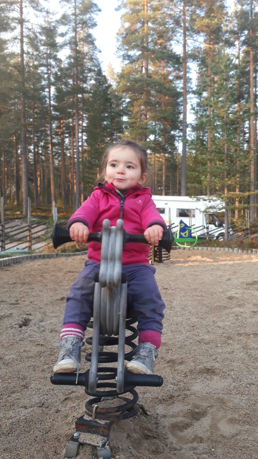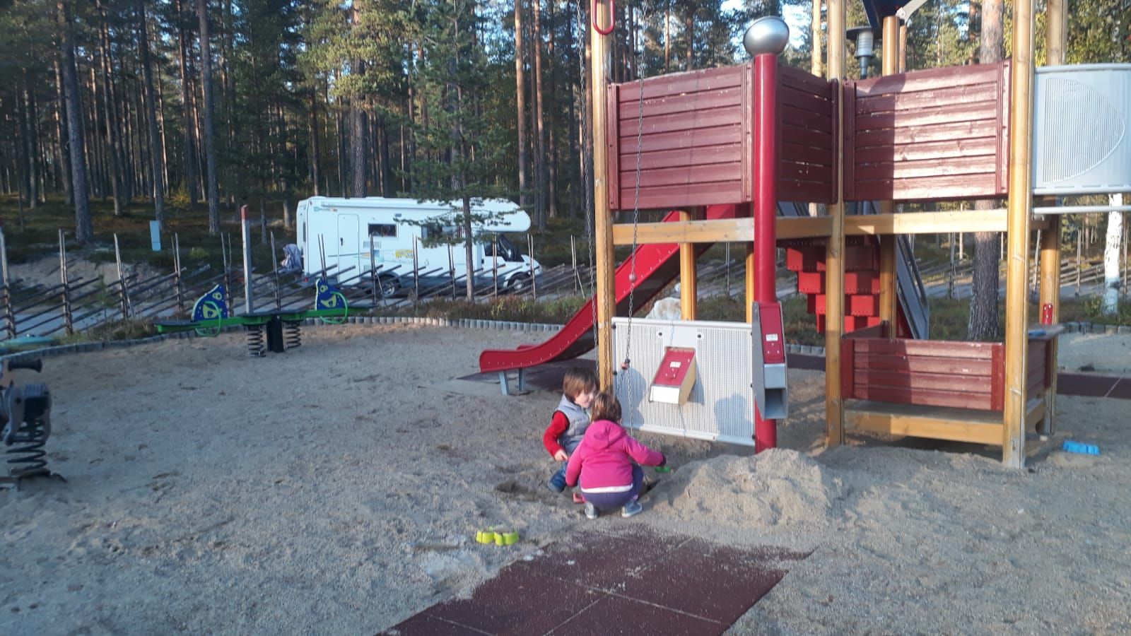 Ce soir, on s'arrête sur un parking tranquille le long de la route, avec une aire de jeux; les enfants ont grand besoin de se défouler après 4 bonnes heures de route!