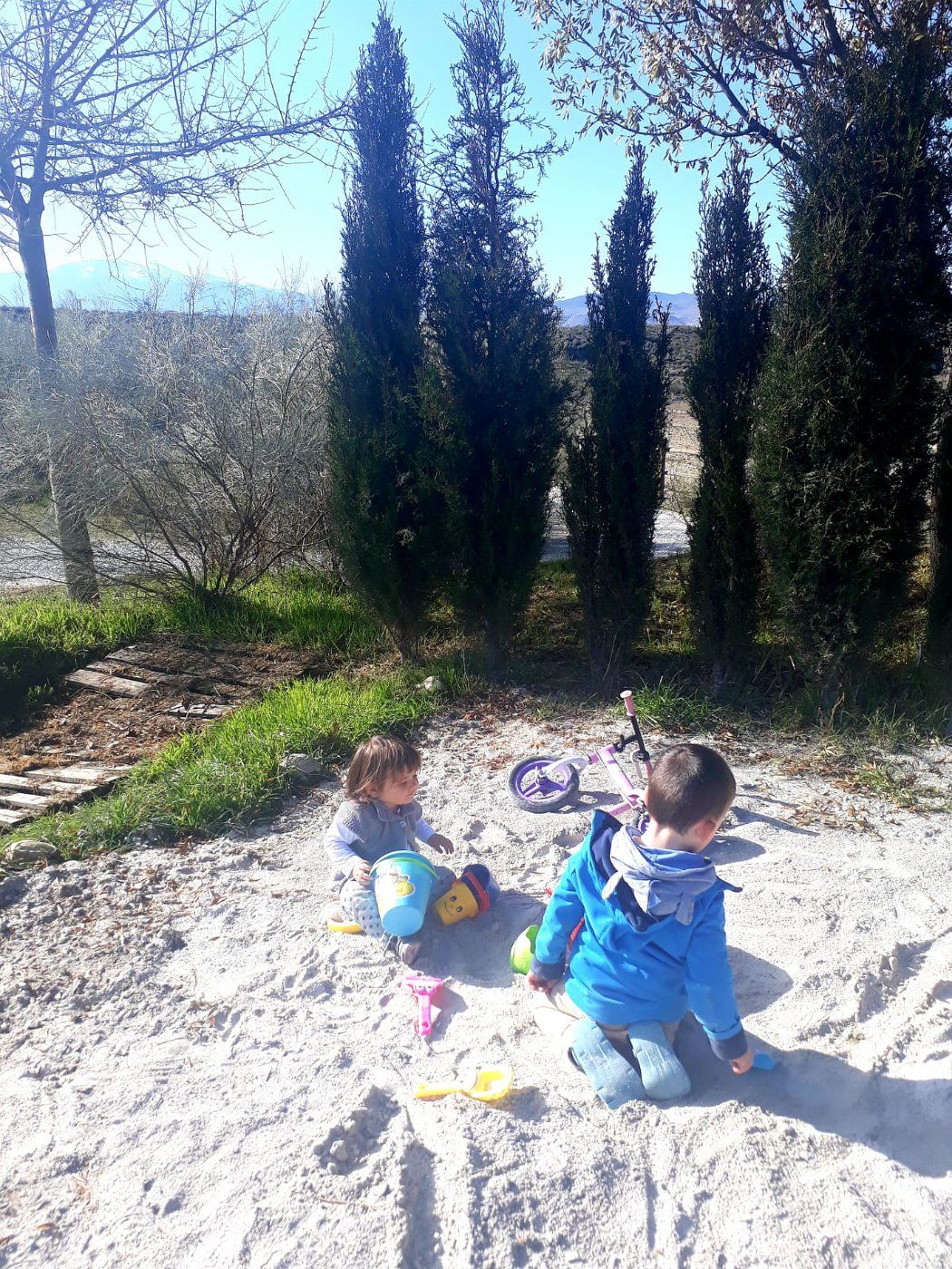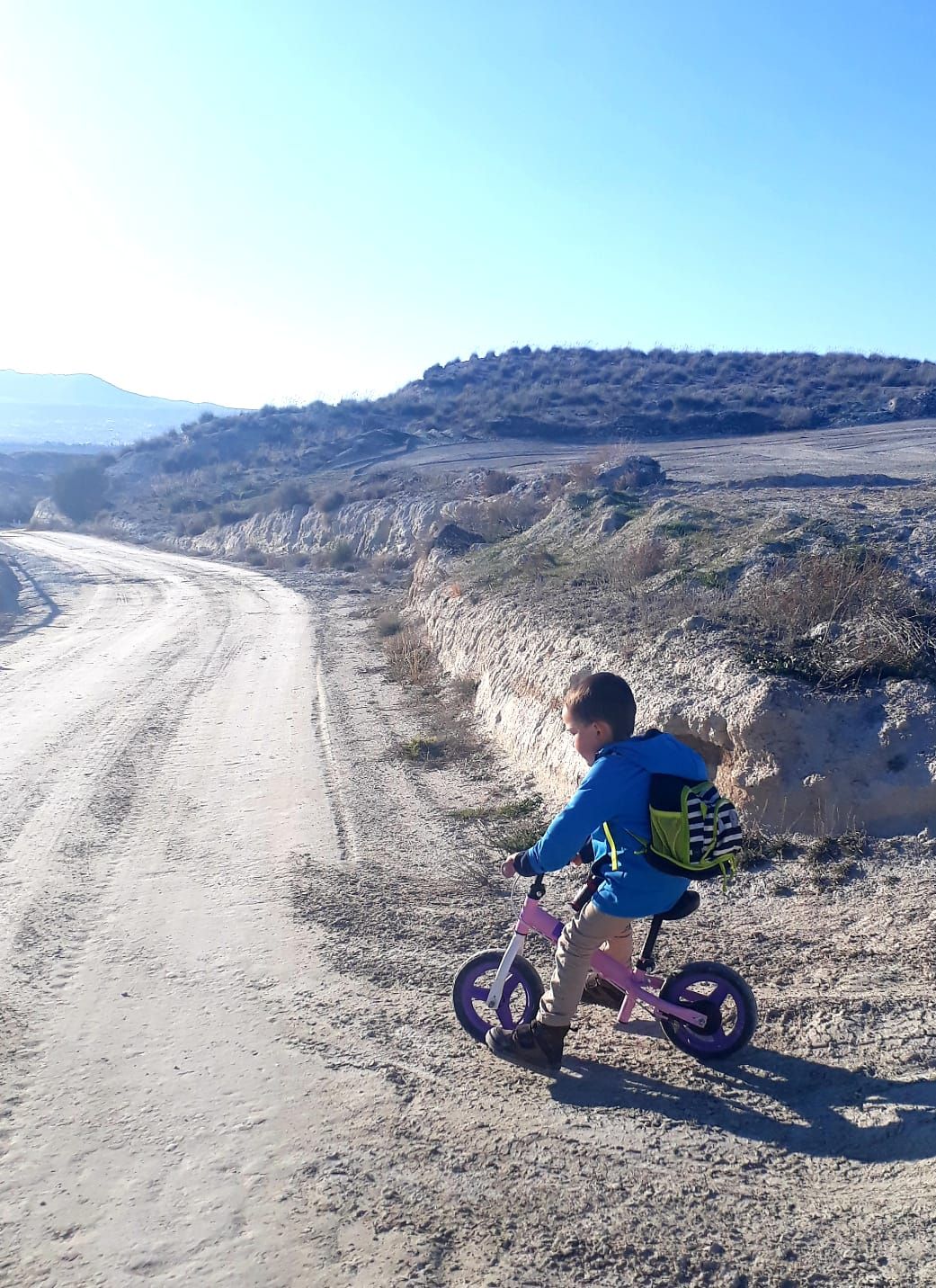 Louen s'éclate avec la draisienne que Louka lui a prêtée. Le vélo sans petites roues ne devrait pas tarder!
