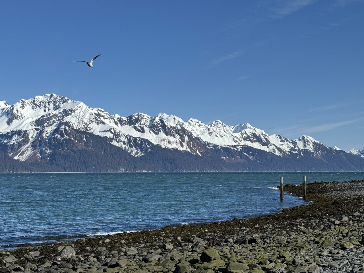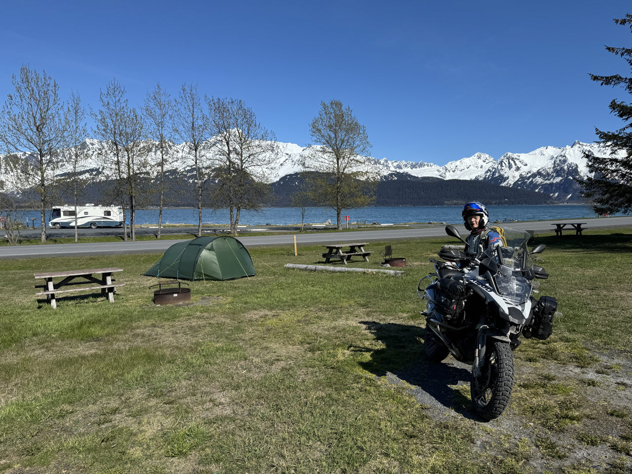 Heute haben wir unser Motorrad beim Zoll ausgelöst. Nach dem Papierkram konnten wir es wieder aus der Kiste auspacken. Hat alles wunderbar funktioniert. Nach einem kurzen Tankstopp geht es sofort 200 km gen Süden nach Seward. Vor grandiosen schneebedeckten Bergen schlagen wir unser Zelt auf. Heute Nacht soll es mit nur 1‘C sehr kalt werden.