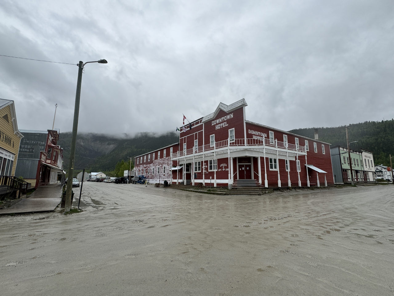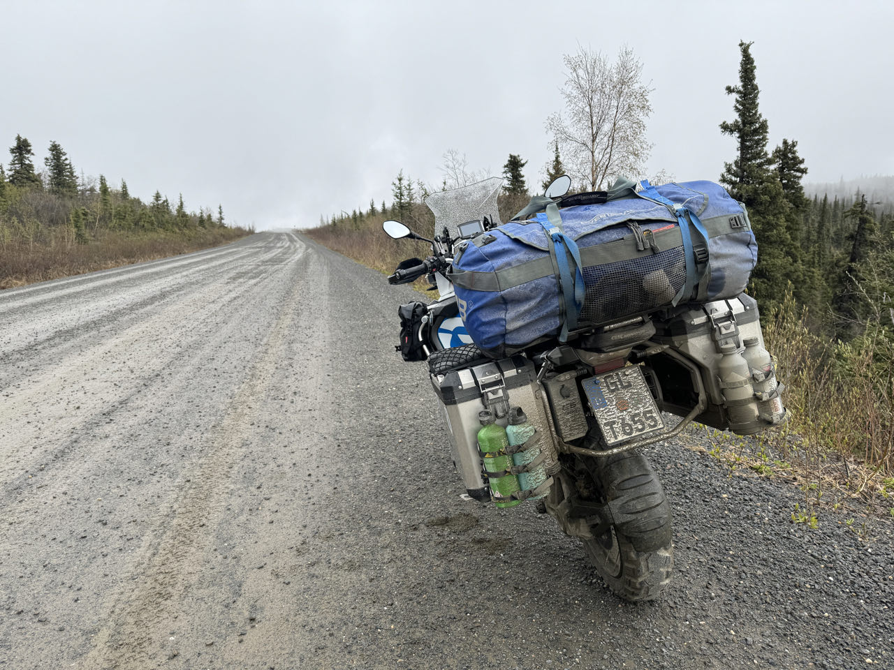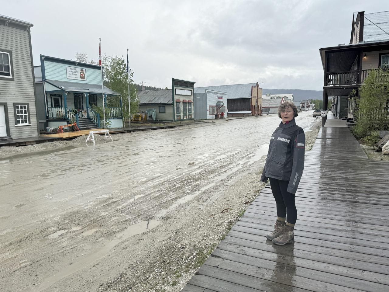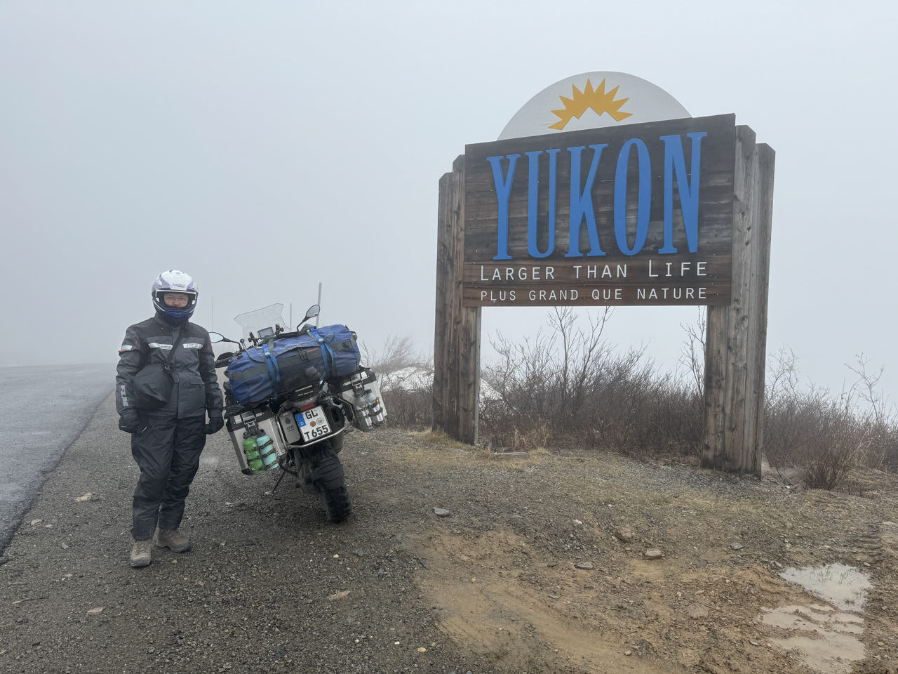 Regen. Regen. Regen. Kein optimales Wetter für den 174km langen unbefestigten „Top of the World Highway“. Aber wir müssen heute von Tok über das Golgräbercamp „Chicken“ bis nach Dawson in Kanada. Der nette Grenzbeante heißt uns Willkommen in Kanada 🇨🇦. Wir sollten vorsichtig fahren - die Schotterstraße sei ein wenig glitschig (slippery). Was für eine Untertreibung! Bis zu 10 cm loser Matsch über zig Kilometer hinweg bringt uns an unsere Grenzen (und ein wenig darüber hinaus). Trotz Regen, Matsch, Schnee und Eiseskälte überqueren wir mit der Fähre den Yukon und kommen abends in Dawson an. Wir gönnen uns ein Zimmer in dem historischen Downtown-Hotel und genießen eine heiße Dusche. Nach dem Essen wird Frank noch Mitglied im „Sourtoe Cocktail Club“, indem er die mumifizierte Zehe im Whiskey zischen die Lippen nimmt 😂