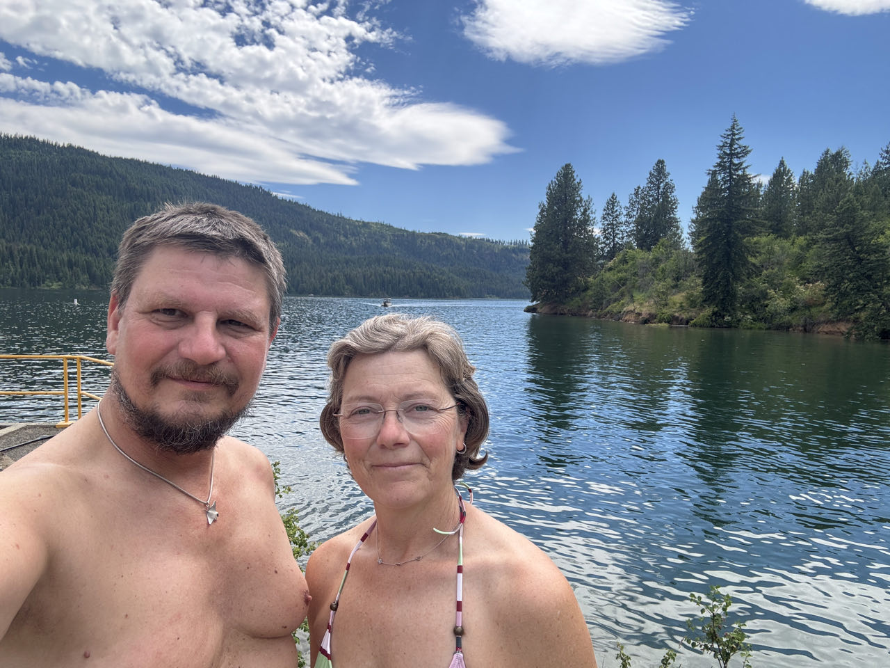 In Walla Walla übernachten wir erstmals in einem Motel - etwas teuer, aber ganz gut. Wir müssen heute Strecke nach Osten machen, da wir einen Campground in Yellowstone ab dem 25.06. reserviert haben. Bis dahin sind es aber noch etwas mehr als 1.100 km. Wir fahren durch die Staaten Washington und Oregon an endlosen Getreidefeldern entlang (bei 34‘C). In Idaho geht es in die Berge zu einem entlegenen See. Hier ist es in 500m Höhe „nur“ noch 29‘C. Gelegenheit unser Sommer-Schuhwerk auszupacken und eine Runde im See (20‘C) schwimmen zu gehen.
