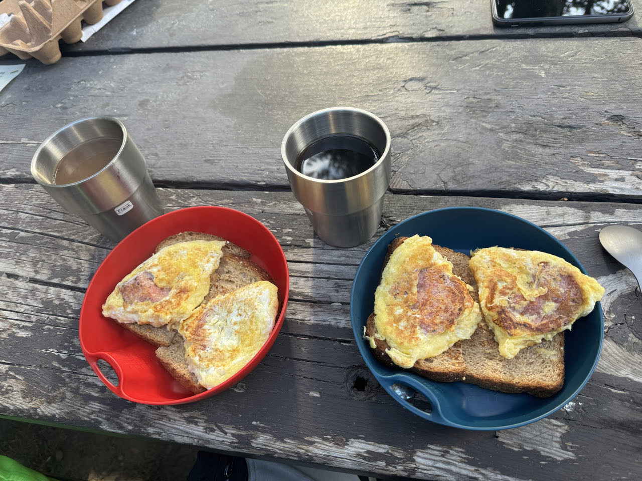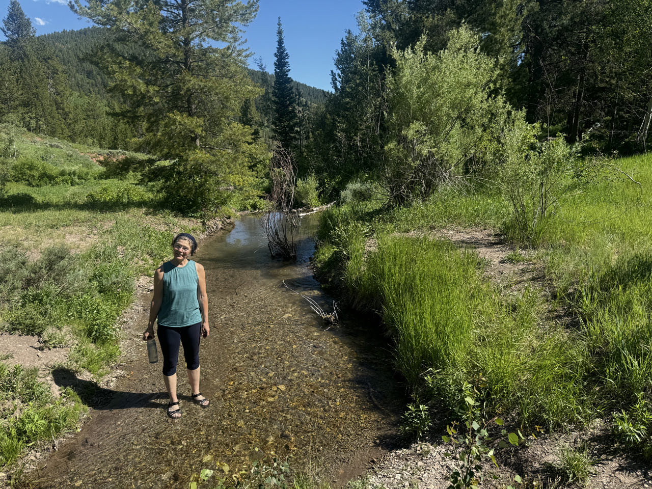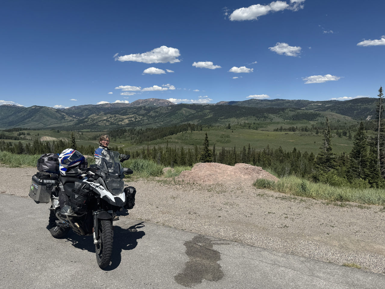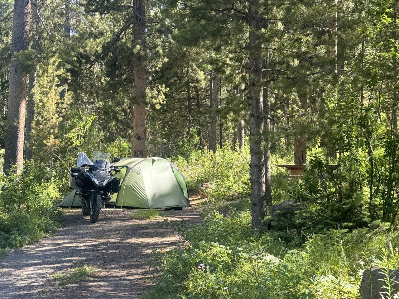 Nach einem festlichen Frühstück fahren wir durch das südliche Wyoming. Große Ranches mit grünen Wiesen und viel Wald prägen diese ländliche Gegend. Etwas abseits des Hwy 89 schlagen wir unser Zelt im National Forrest (Staatsforst) mitten im Wald an einem kühlen Bach auf (es ist mittlerweile wieder 30‘C).