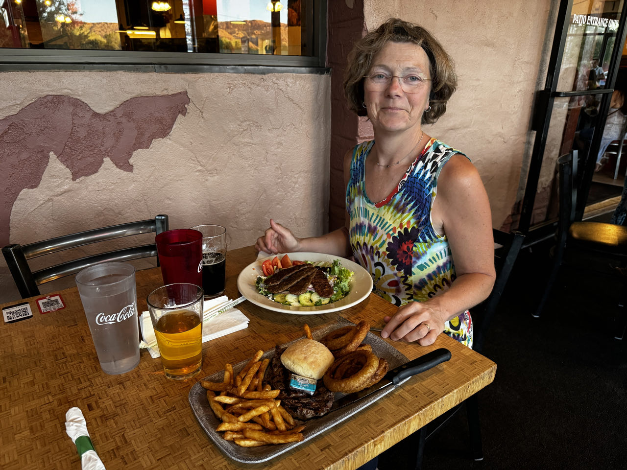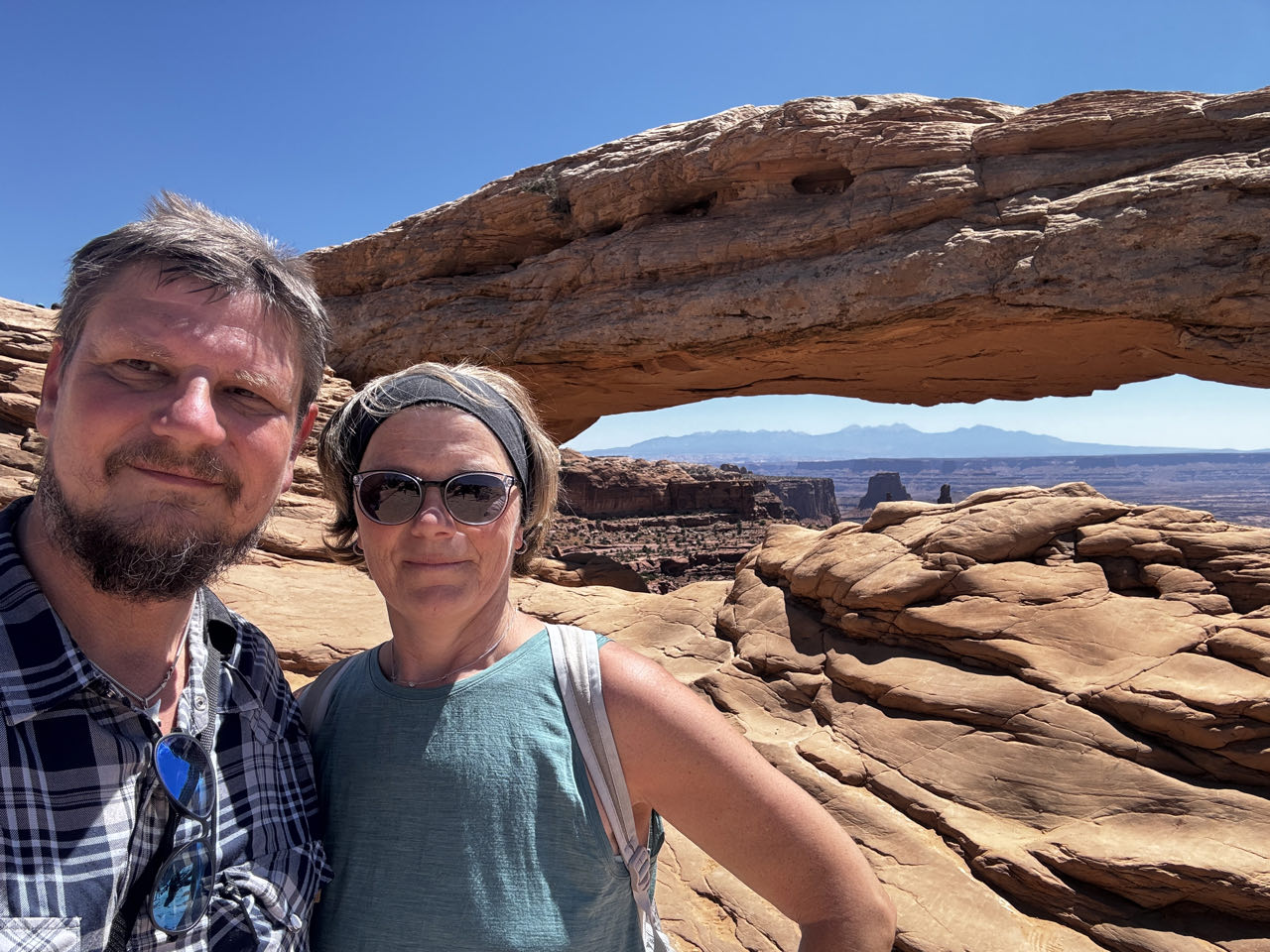 Ohne einen Kaffee fahren wir um 6 Uhr in den Canyonlands Nationalpark. Hier haben sich der Greenriver und der Coloradoriver in Millionen von Jahren in den roten Sandstein gegraben. Es entstand eine surreale Canyonlandschaft. Der Mesa-Arch ist eines der Highlights. Bereits um 11:30 Uhr ist es wieder 38‘C - Zeit für den Pool am Campingplatz. Am letzten Abend hier gönnen wir uns ein US-Steak bei frischgezapftem Bier in der Moab Brewery.