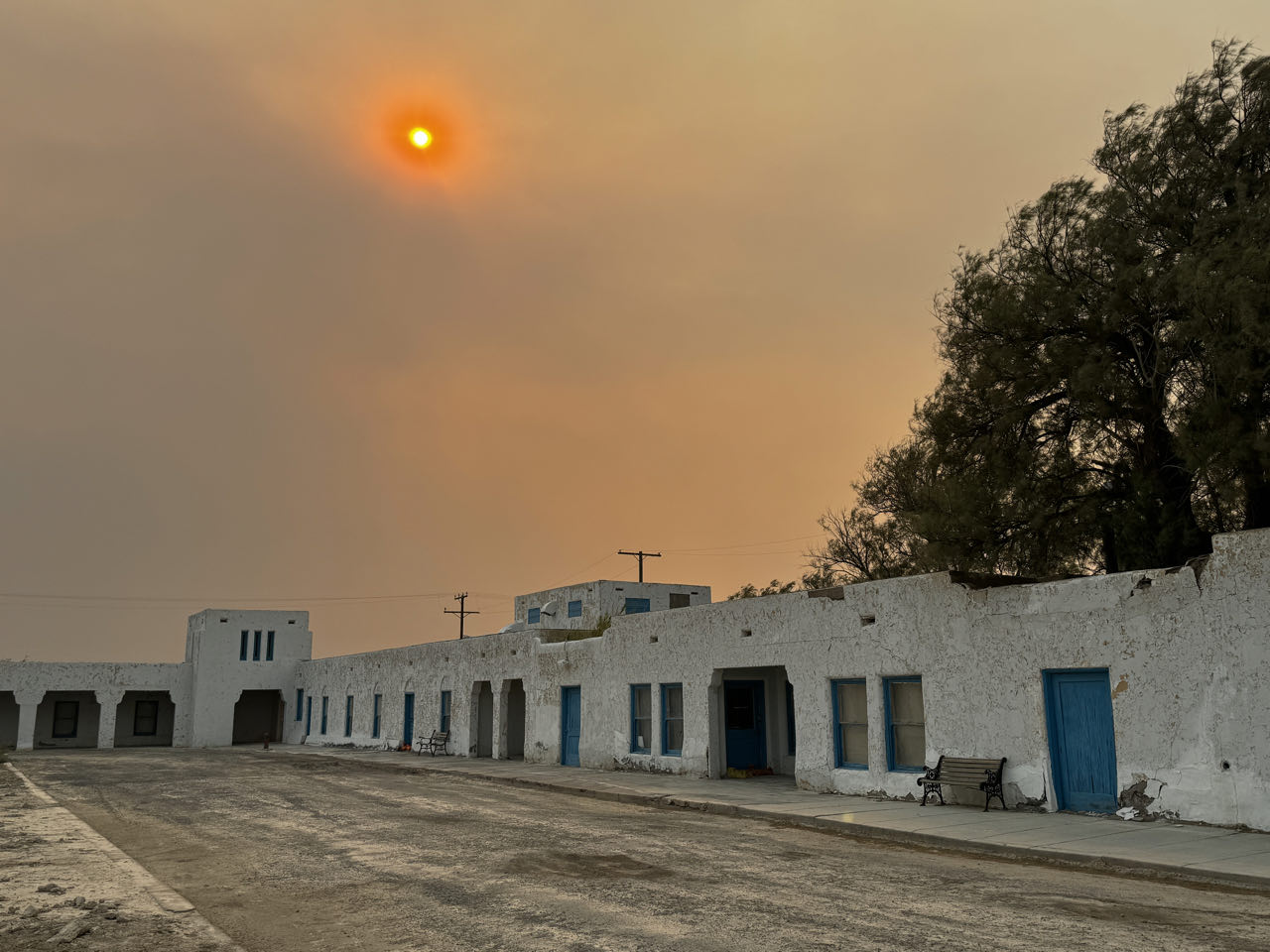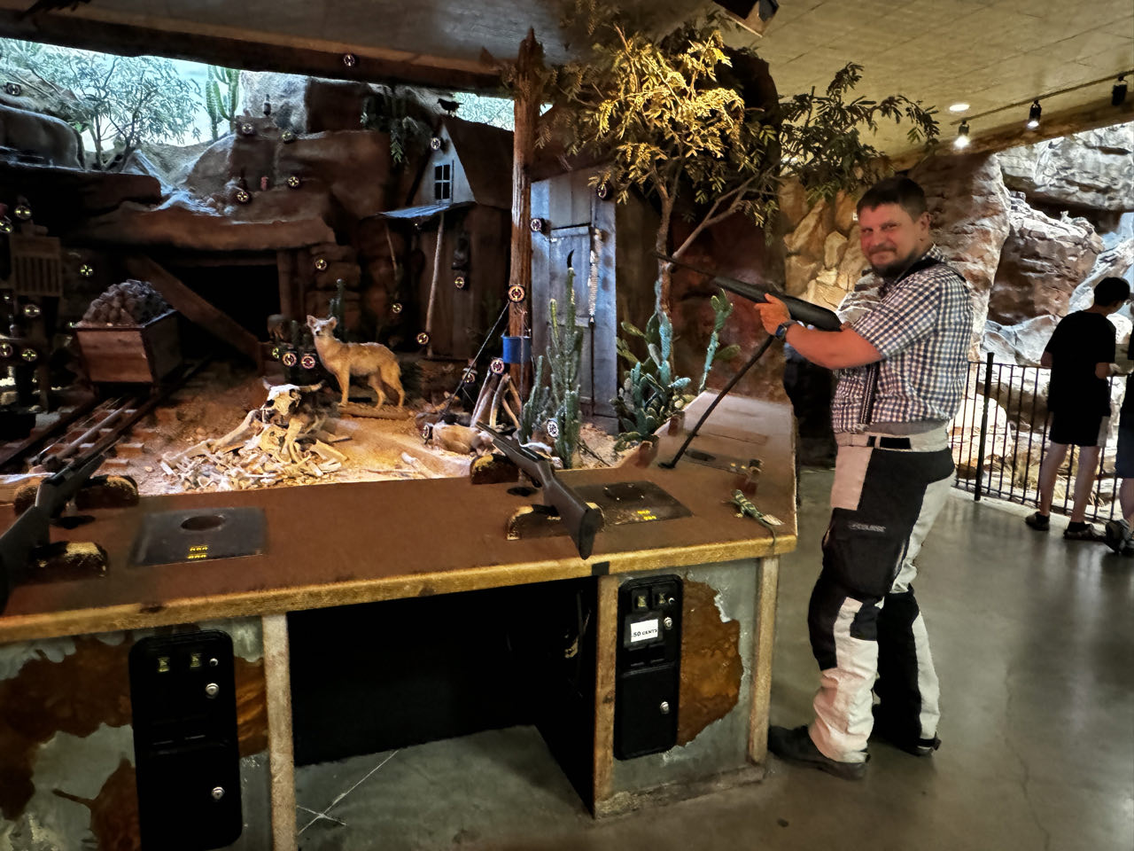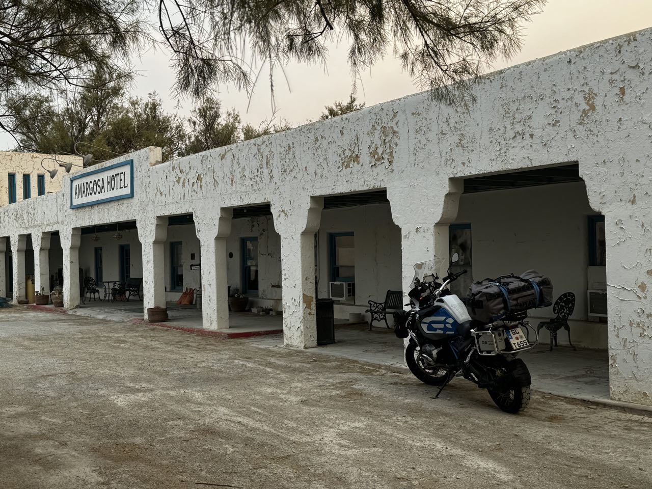 Wir verlassen die sündige Stadt Richtung Westen und machen Mittags einen Halt im Silverton Hotel zum „abkühlen“. Dort drin ist ein großes Aquarium und der größte Jagd- und Angelshop in Nevada. Auf der Fläche eines Fußballstadions schlendert man zwischen Szenen ausgestopftem Großwilds und einem Waffenarsenal hindurch, das die Bundeswehr ihrer Materialsorgen entledigen würde. Auf dem Weg zum Death Valley kämpfen wir uns durch einen Sandsturm bei 44‘C bis Death Valley Junction. Hier in the Middle of Nowhere steht seit 1924 einsam an der Kreuzung (Junction) das Armargosa Hotel. Es soll in den 1950er Jahren wohl mal renoviert worden sein, sieht von außen aber aus wie eine Ruine. Wir wollen hier dennoch übernachten, da wir morgens um 4 Uhr von hier das Death Valley bei Nacht (und hoffentlich nur 35‘C) durchfahren wollen. Erstaunlicherweise ist es innen mit einem morbiden Charme ganz nett und die Dusche und die Klimaanlage funktionieren - was will man mehr 😁