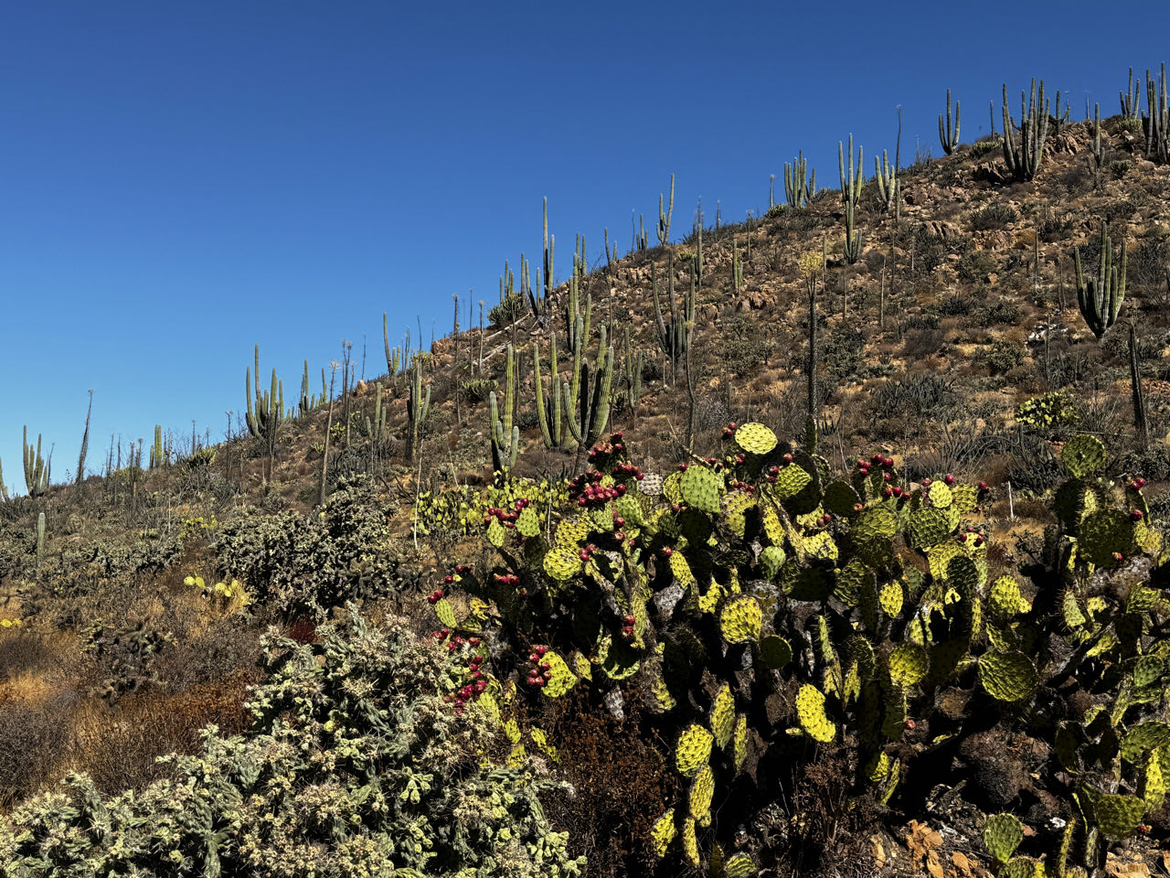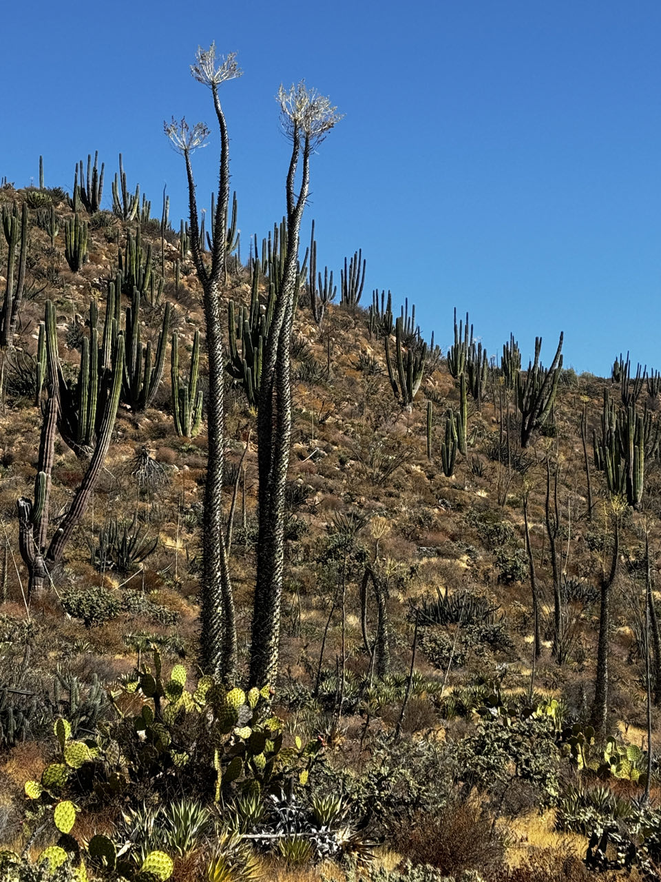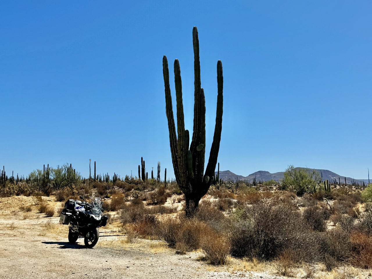 Wir fahren heute durch die Kakteen-Wüste im zentralen Hochland der Baja California. Im Valle de los Cirios ist die Hochebene soweit das Auge reicht von Yucca-Palmen, riesigen Saguaru-Kakteen und dem endemischen Boojum-Baum (eine Mischung aus Palme und Kaktus) bewachsen. Die Panamericana führt mit dem mexikanischen Hwy #1 ohne Tankstelle 360 km über die Wüstenhochebene bis nach Guerrero Negro. Hier können wir etwas zu Essen kaufen (die Süßigkeiten zum gestrigen mexikanischen Nationalfeiertag sind spitze 😋) und unsere Airbnb-Unterkunft beziehen.