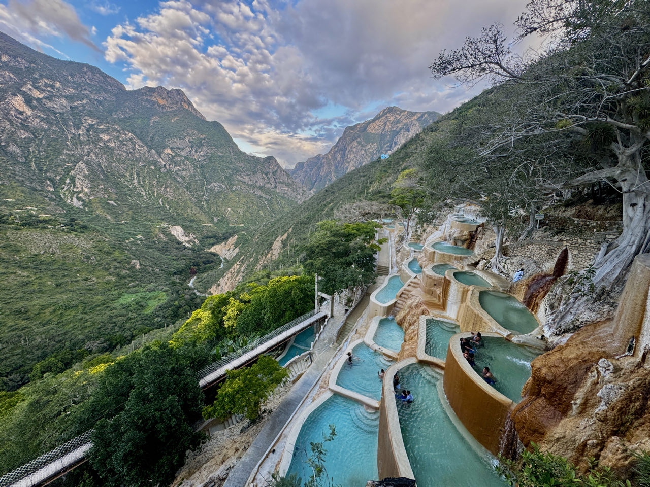 In der Region Hidalgo in Zentral-México liegen die Grutas Tolantongo. Mitten in den Bergen in 1.760m Höhe entspringen heiße Thermalquellen aus den Felsen und ergießen sich in zahlreiche Sinterterrassen, bevor sie als heißer Fluss ins Tal strömen. In der Sprache der Azteken „ agua caliente en movimiento“. Im Kalkgestein gibt es zudem große Grotten, in denen das heiße Wasser aus der Decke fließt und überall kommen heiße Wasserfälle aus dem Berg.