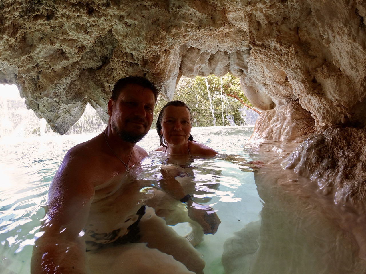 Das Areal ist vergleichbar mit Pamukkale in der Türkei - nur viel größer und mitten im Dschungel. Wir haben uns hier eine Hütte gemietet und genießen einen Wellness-Tag in der Natur.