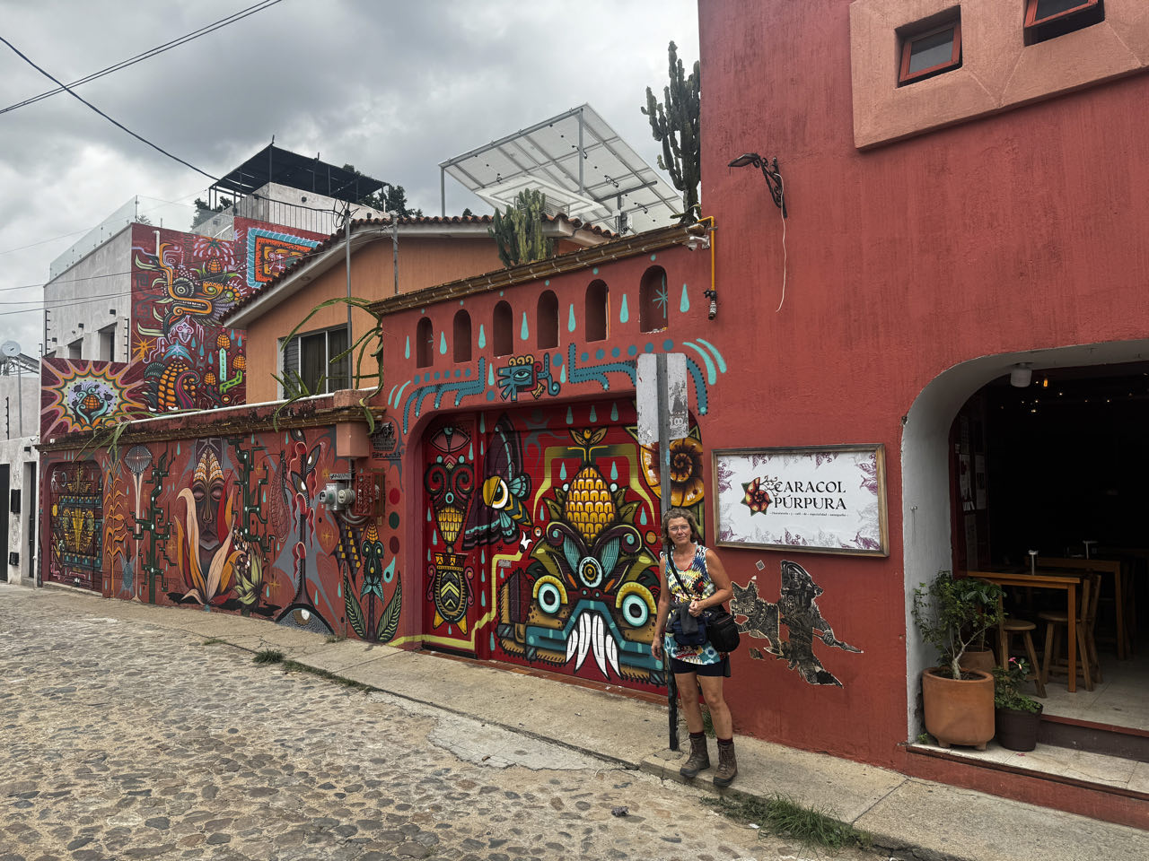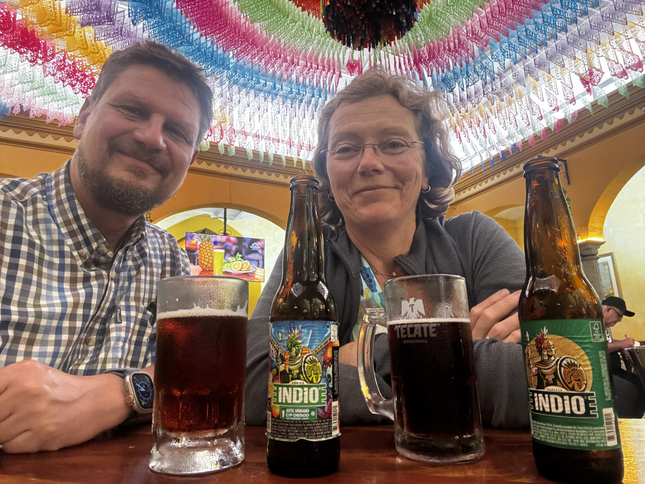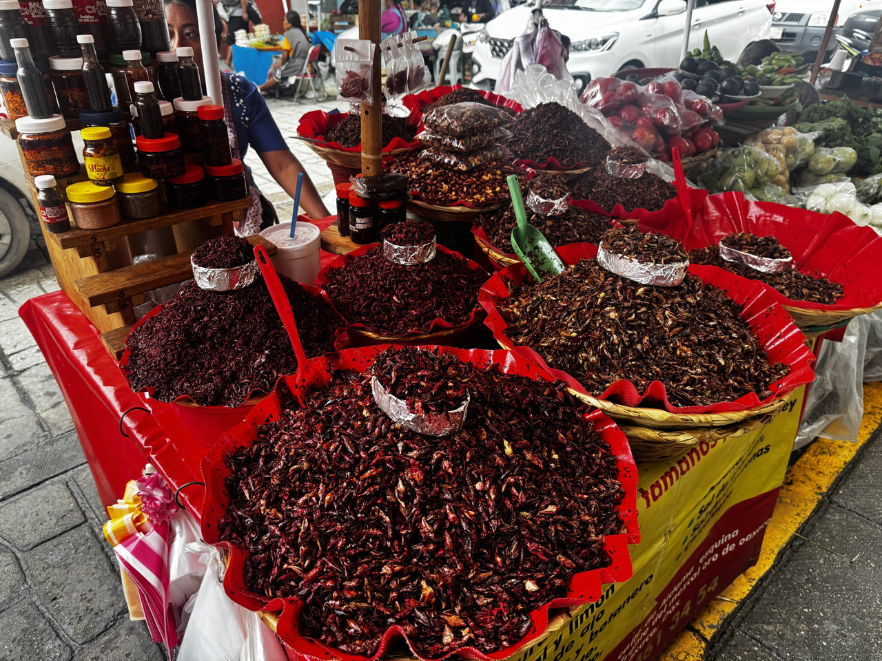 Oaxaca - das im spanischen Kolonialstil errichtete historische Zentrum der Stadt mit dem unaussprechlichen Namen gehört zum UNESCO-Weltkulturerbe. Auffällig sind hier vor allem die bunten Wandbilder, unzählige Kunstgalerien und schöne Innenhöfe. Über die bunt geschmückte Promenade Andador Turístico kommen wir zur Kathedrale von Santo Domingo de Guzmán. Vor einem Regenschauer flüchten wir in die Casa Mayordomo auf zwei Indio-Bierchen 🍻. Wieder im Trockenen schlendern wir am Zócalo vorbei zum Mercado. In fußballfeldgroßen Hallen gibt es von Kleidung über Obst und Gemüse bis hin zu Getränke- und Essensständen alles zu kaufen, was es in México gibt. Wir probieren Oaxacas Spezialität „Mole Negro“ (eingedickte scharfe Soße) und die Mezcals (Agavenschnaps, der hier nicht Tequila heißen darf). Bei den Chapolines (geröstete Heuschrecken) beschränkten wir uns auf ein Foto 🤪 Wir essen dann doch lieber „Carne Asada“ frisch von Holzkohlegrill 😋