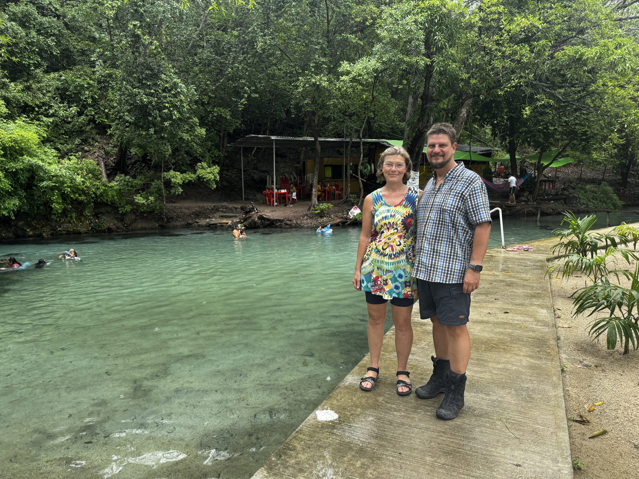 Die Airbnb-Unterkunft liegt in einem Örtchen mitten im Dschungel und ist sehr rustikal. Die Gastgeberin begleitet uns dafür zu einer Familie, die extra für uns etwas zu essen grillt (Restaurant kann man dazu wirklich nicht sagen) und führt uns anschließend noch zu einer Badestelle an einer großen Quelle im Ort. Wir ziehen dann aber doch die Hängematten im Innenhof der Unterkunft einem Bad vor. Die lange Fahrt durch hunderte Kurven in den Bergen teils im Regen war doch ziemlich anstrengend 😏