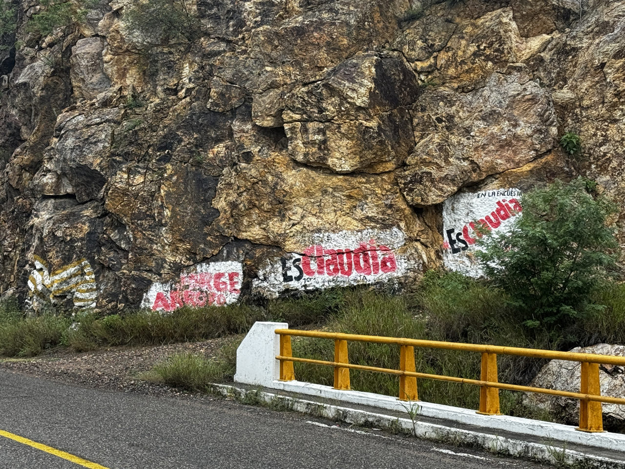 Heute ist ein Fahrtag ohne große Besichtigungen. Die 300 km von Oaxaca bis zu unserer Übernachtung in Santiago Laollaga führen durch dschungelbewachsene Berge. Durch den vielen Regen sind die Bäche in den Schluchten zu reißenden Flüssen angeschwollen. Statt Plakaten sind die Felsen überall mit Wahlwerbung für die (seit heute) amtierende neue Präsidentin Méxicos (Claudia Sheinbaum) angemalt.