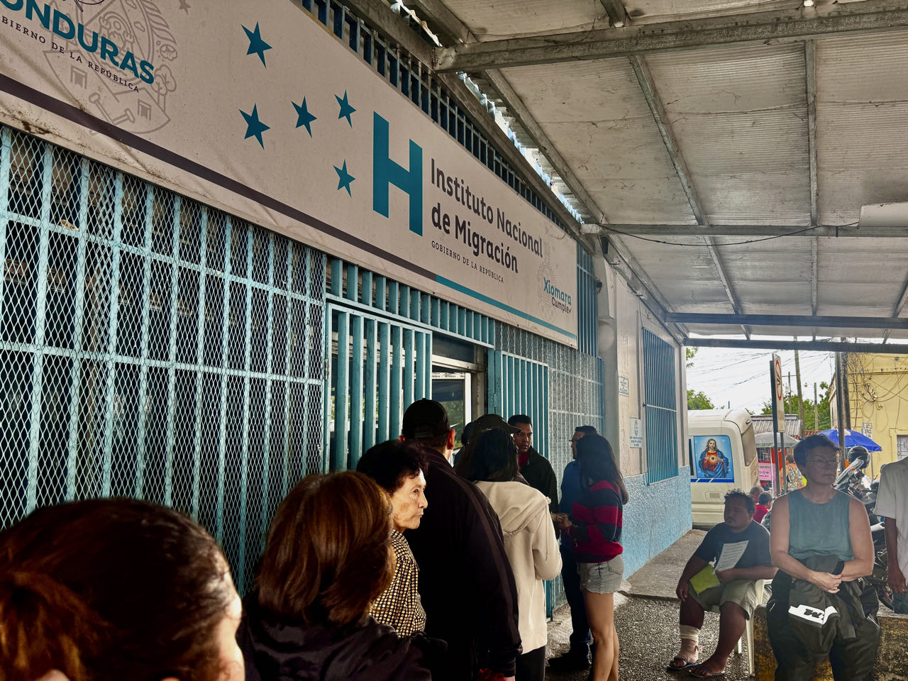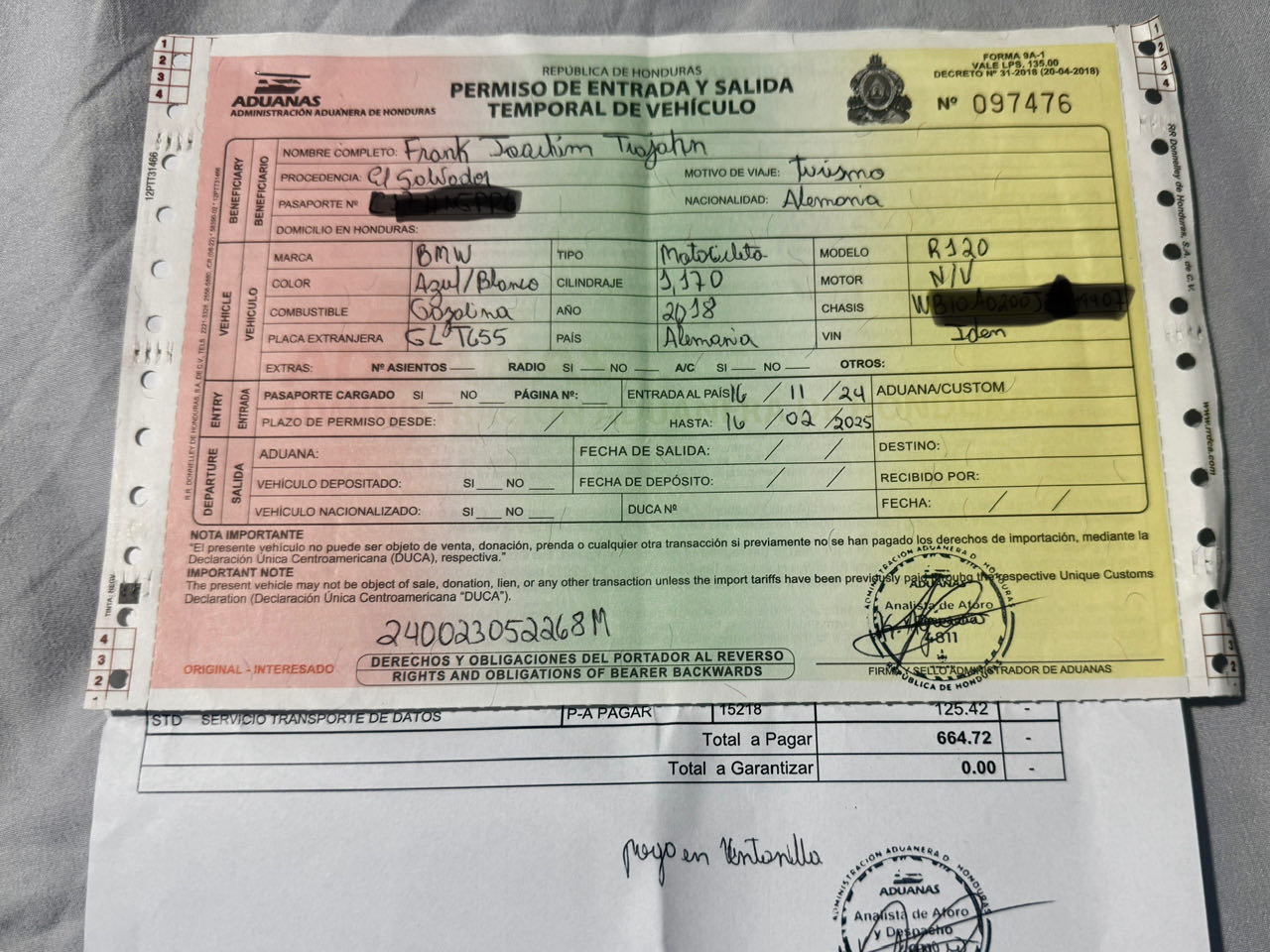 Zuerst das TIP aus El Salvador (Temporäre Importgenehmigung für unser Motorrad) für die Ausreise austragen lassen, dann zur Migration fahren, Kopien vom dem entwerteten TIP in einem Lebensmittelladen gegenüber machen und Ausreisestempel (auf einen Zettel, nicht in den Pass) am Schalter besorgen. Die Zettel werden von einem Beamten vor dem Überqueren der Grenzbrücke eingesammelt. Auf der honduranischen Seite 3 US$ pP bezahlen und 15 min. für den Einreisestempel in der Schlange warten. Danach Kopien vom Einreistempel im Gemischtwarenladen gegenüber machen, bevor es auf der anderen Straßenseite zum Zoll für das Honduras-TIP geht. Wir übergeben dem Beamten Pass, Führerschein, Fahrzeugschein und Kopien von alledem plus Kopie vom Einreisestempel im Pass plus Kopie vom entwerteten TIP aus El Salvador. Er könnte für das gleichlautende TIP für Honduras einfach daraus alles abschreiben, aber das wäre ja für 35 US$ Gebühr zu einfach. Stattdessen versucht er abwechselnd aus allen Kopien, dem deutschen Führerschein und Fahrzeugschein die erforderlichen Daten zu finden und fragt uns im Abständen von jeweils 10 Minuten wo das Kennzeichen, die Fahrgestellnummer, das Baujahr usw. zu finden ist. Leider lässt er sich von uns aber auch nicht helfen … Egal - nach zwei Stunden (kein Witz !!!) hat er das TIP-Formular ausgefüllt. Wir haben uns in der Zwischenzeit sehr nett mit einem Pärchen aus Brasilien, welches auch mit einer GS auf Weltreise sind, unterhalten.