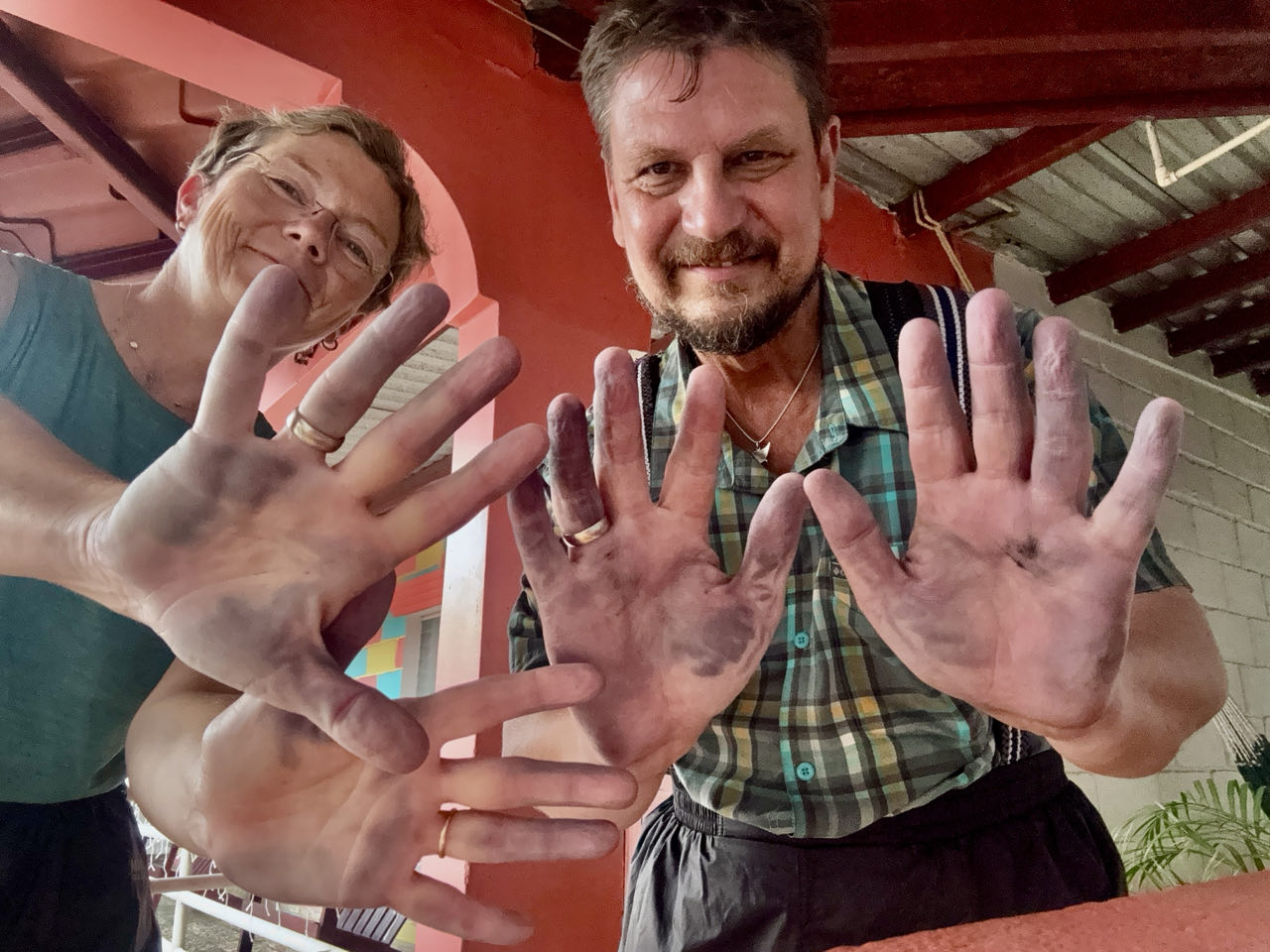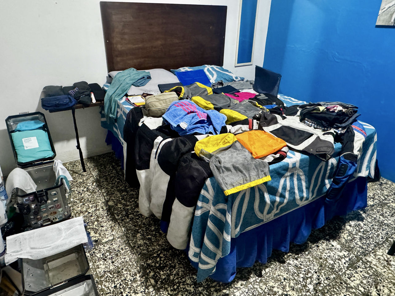 Nach insgesamt etwas über drei Stunden können wir somit nach Honduras einreisen und es fängt pünktlich an zu schütten wie aus Kübeln. Irgendwie scheinen unsere Alukisten trotz Abdichten mit Klebeband nicht dicht zu sein - nach zwei Stunden Regenfahrt (ok - es war fast ein Weltuntergang) ist jedenfalls wieder alles nass und muss zum trocknen ausgelegt werden. Unsere Motorradhandschuhe scheinen auch nicht ganz farbecht zu sein 😅