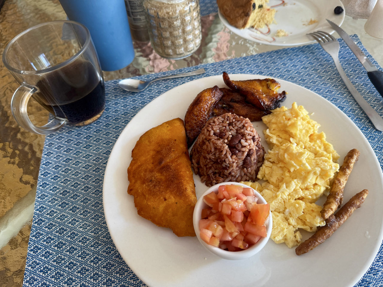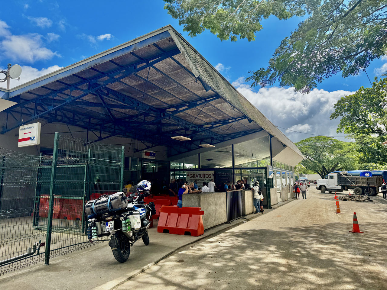Wir fahren 500 m weiter und parken direkt vor der Migración in Costa Rica. Am gebührenfreien Geldautomat links vor dem Gebäude versorgen wir uns mit costa-ricanischen Colons. Danach stellen wir uns in die leider sehr lange Schlange für den Einreisestempel (ca. 1,5 Stunden Wartezeit). Während wir unter dem Hallendach warten, gibt es einen Wolkenbruch - ist somit gar nicht schlimm, warten zu müssen 😄. Danach am Büdchen gegenüber ein Formular für das Motorrad ausfüllen und stempeln lassen. 300 m weiter gibt’s auf der rechten Seite ein graues Gebäude (Schild „Aduana“). Hier müssen wir für 45 US$ eine Versicherung abschließen und wir bekommen am Schalter nebenan das TIP und einen Zettel im Tausch gehen das gestempelte Formular vom Büdchen ausgehändigt. Nach weiteren 200 m wird das TIP und unser Kennzeichen nochmal überprüft und der Zettel wird einbehalten. Danach sind wir fertig und in Costa Rica eingereist 😀. Wartezeit insgesamt 2,5 Stunden.