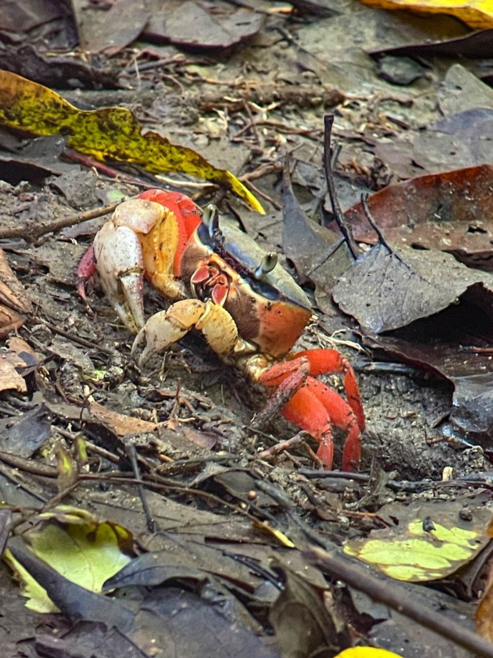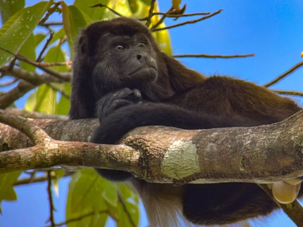 Es hat geholfen - der Morgen begrüßt uns mit blauem Himmel und Sonne ☀️😀. Um 7:30 Uhr brechen wir zu unserer geführten Tour in den Nationalpark auf. Vor der Abfahrt sehen wir bereits zwei quietschbunte Aras und ein Blau-Tanager (der blaue Spatz heißt so) hat unserer Motorrad besetzt. Das fängt schon mal gut an … Die Tierwelt im Park ist dann tatsächlich überwältigend. Alle paar Minuten zeigt uns unser Guide Fabio auf der rund zweieinhalbstündigen Wanderung Krabben, eklige Giftspinnen, Howler Monkeys, Weisskopf-Kapuzineräffchen, Basilisk-Leguane uvm. Nach der Wanderung können wir uns am traumhaften Sandstrand im Park entspannen. Nach einer kurzen Bierpause 🍻 geht es dann nachmittags mit einem Boot durch die Mangrovensümpfe des Rio Cotos. Auch hier ist die Artenvielfalt umwerfend. Neben vielen Vögeln (u.a. ein seltener Fischbussard) fahren wir an vielen Leguanen 🦎, wieder Kapuzineräffchen, einem großen Kaiman 🐊, winzigen Nasenfledermäusen 🦇und Schlangen 🐍 (giftige Lanzenotter, Baum-Python) vorbei. Abends auf unserer Terasse können wir in der Ferne noch zwei Tukane beobachten. Faszinierend (würde wohl Mr. Spock sagen 🖖).
