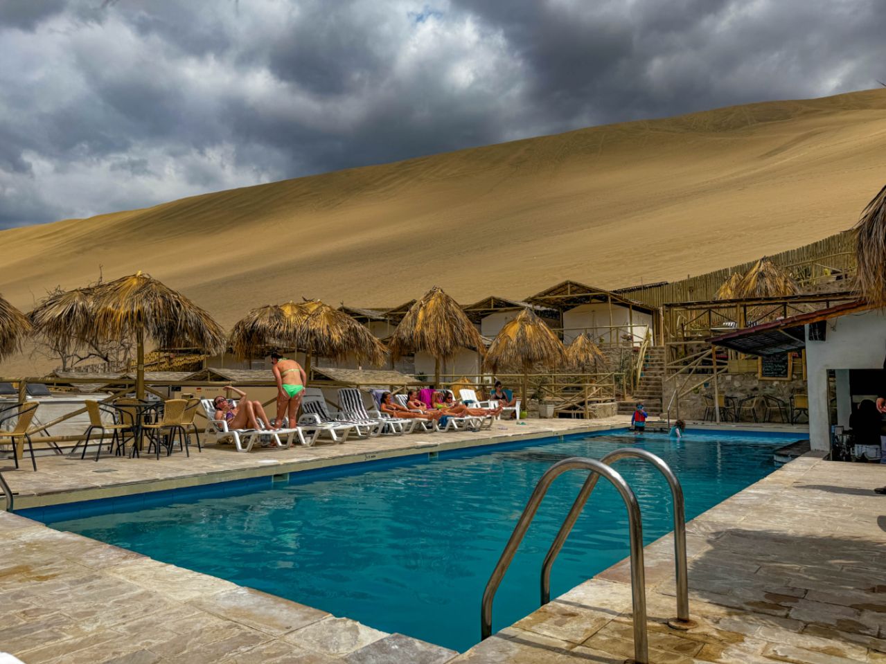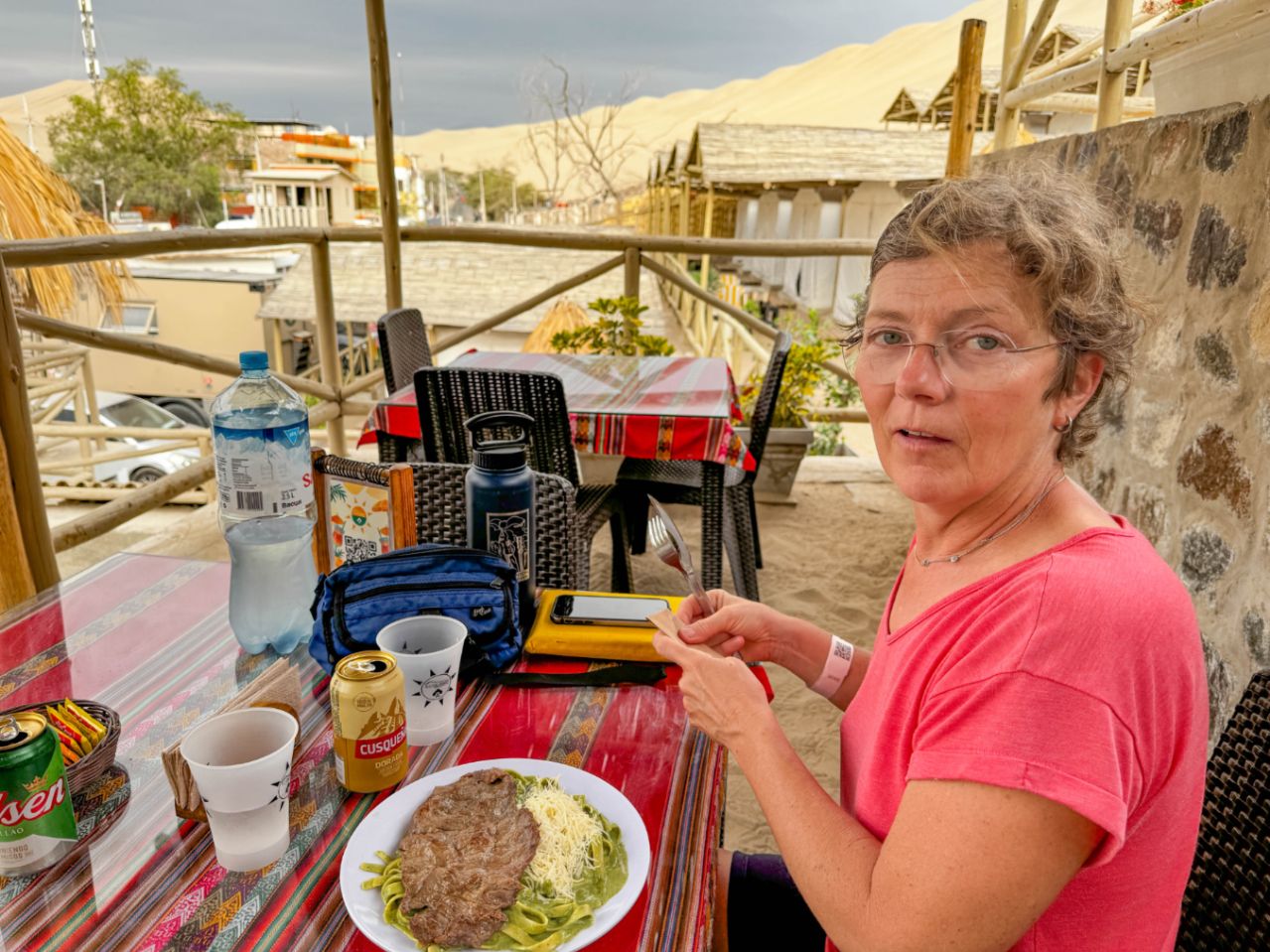 Die Panamericana von Lima gleicht einer Autobahn, so kommen wir gut voran. Mittlerweile ist es mit 37'C in der Wüste wieder ziemlich heiß, daher freuen wir uns über die Abkühlung im Pool der Anlage. Wir übernachten in komfortablen Zelten im Ecocamp direkt an den grüßen Dünen. Ilona unternimmt nachmittags noch eine Dünenbesteigung, um die Oase von oben zu fotografieren. Abendessen gibt's im guten Poolrestaurant, nur 20 m von unserem Zelt entfernt.