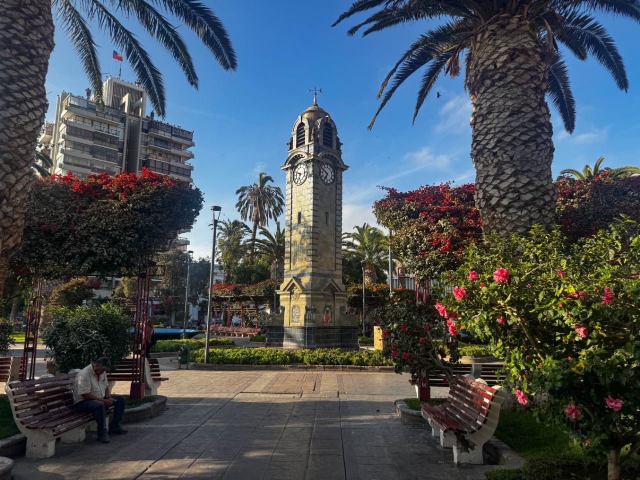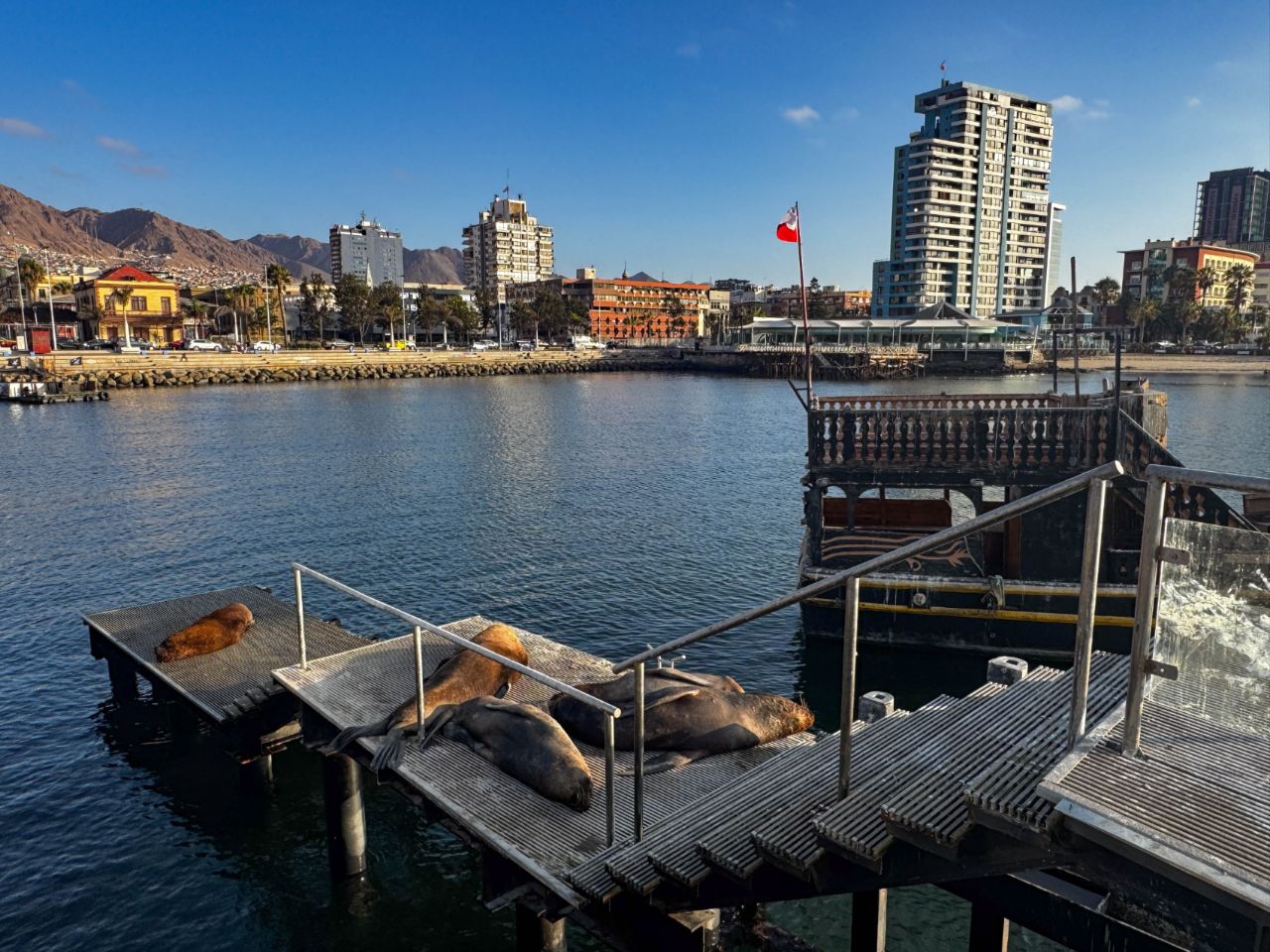 Die Küstenmetropole Antofagasta überrascht uns positiv. Wir hatten eine hässliche Hafenstadt erwartet. Statt dessen gibt es im Zentrum grüne Parks, schön restaurierte Kolonialvillen und eine schöne Hafenpromenade (Malecón). Von hier aus können wir Seelöwen am Pier beobachten.