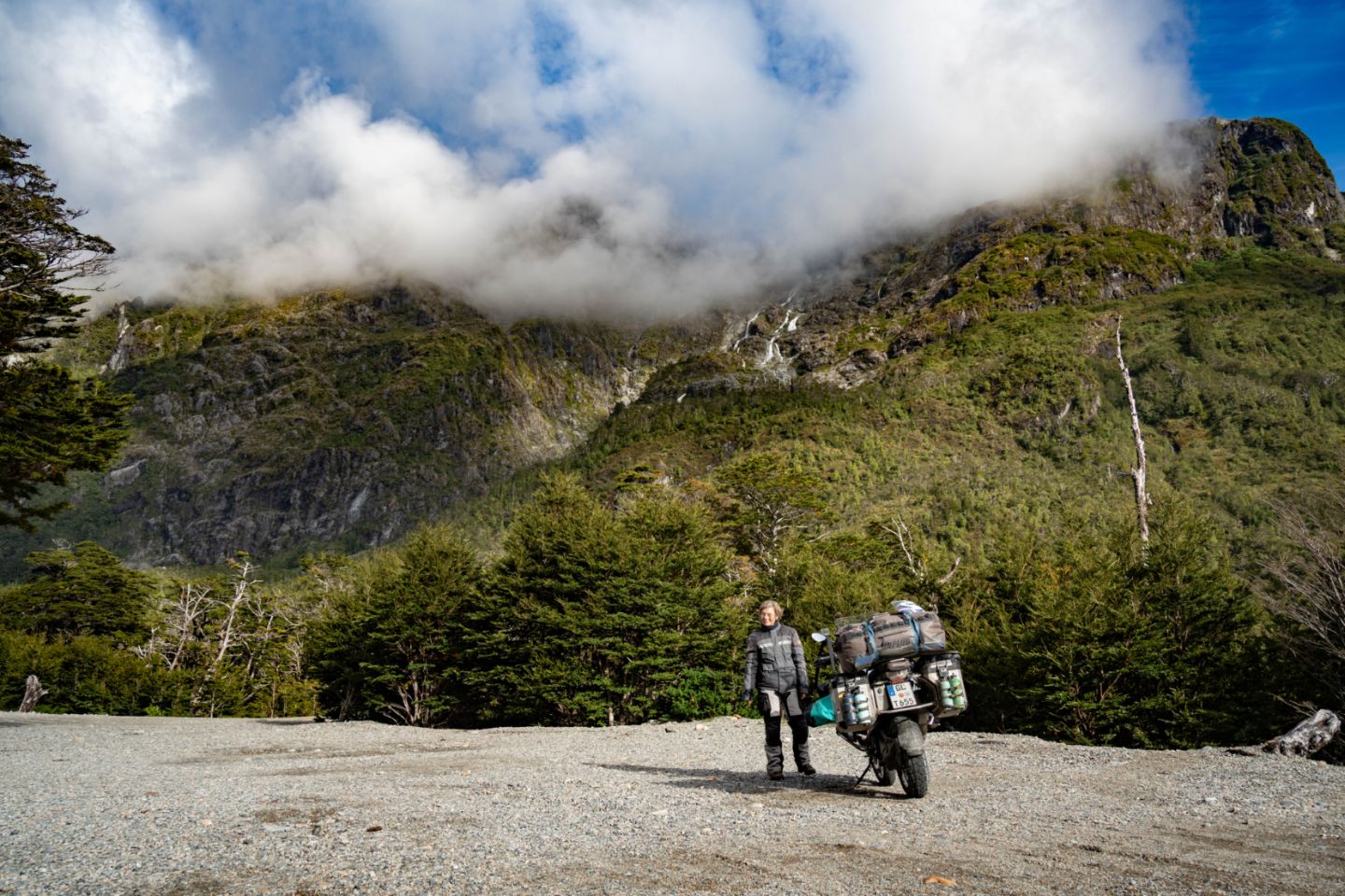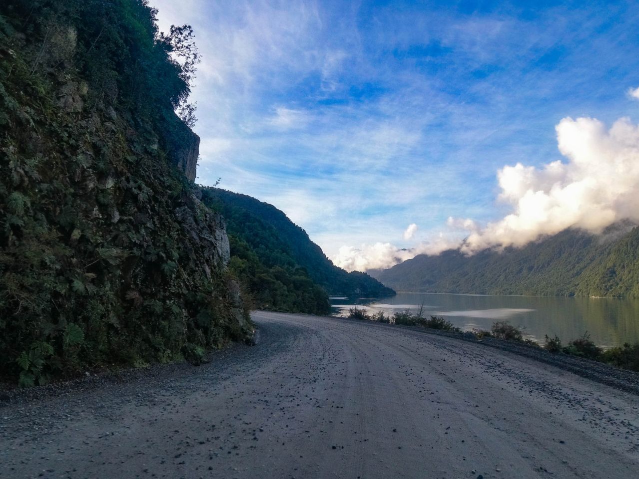 Der Morgennebel wabert noch über den Fjord, als wir gegen 9 Uhr in Puyahuapi bei 6°C, aber blauem Himmel in Richtung Süden aufbrechen. Was uns gestern erspart blieb, erwartet uns heute früh am Morgen: nasse Schotterpiste, rd. 30 km entlang des Fjords und später die Serpentinen hinauf zu einem Gebirgspass im Nationalpark Queulat. Angesichts des guten Wetters und im Wissen, dass die restlichen 300 km bis Puerto Ibanez gut asphaltiert sind, können wir die Rüttelei aber gelassen hinnehmen. Unserer BMW scheinen die vielen Löcher und Steine eh nichts auszumachen - sie brummelt stoisch im "Enduro-Modus" vor sich hin, egal was kommt - ganz schön beruhigend 😊.