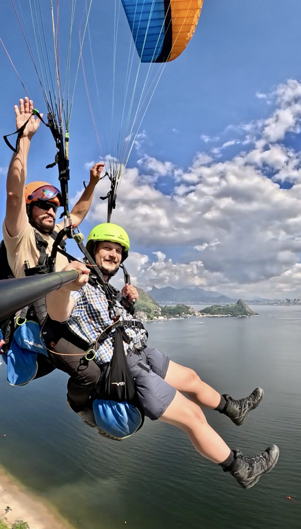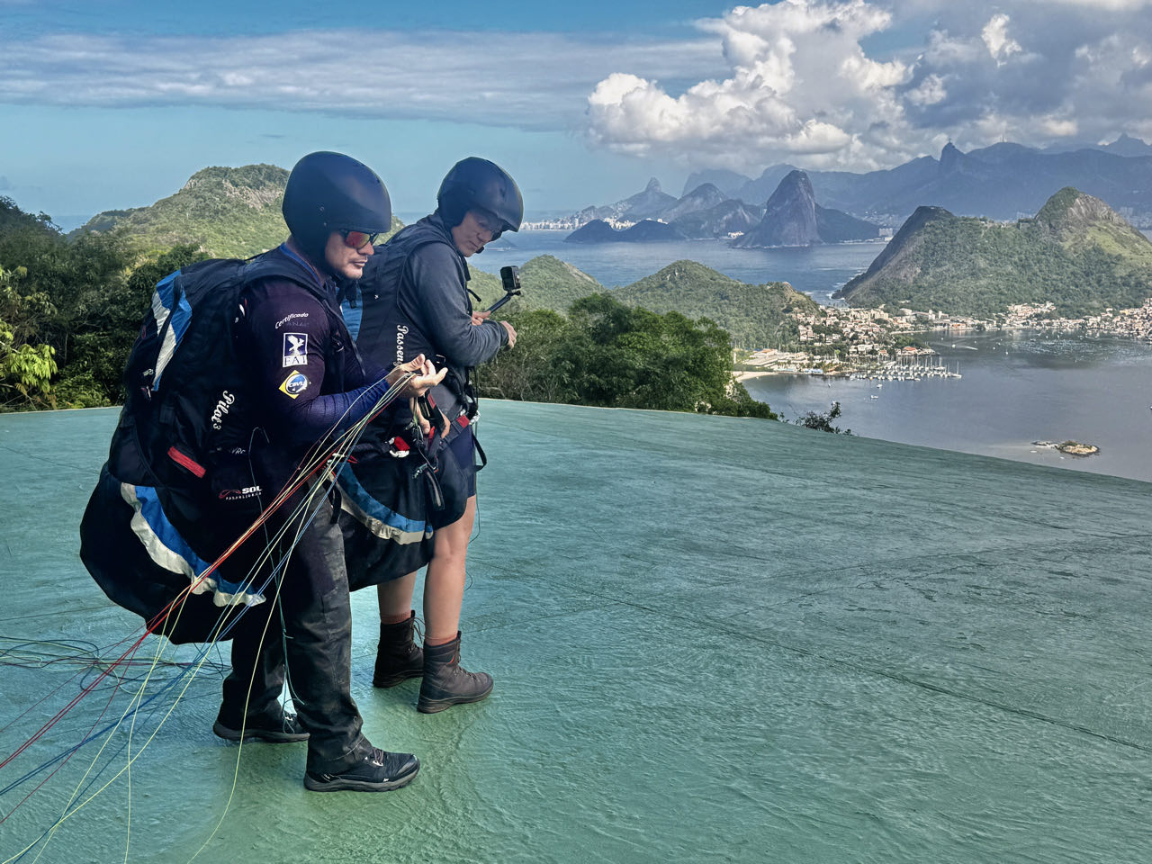Zum krönenden Abschluss unserer Rio-Woche machen wir jeder einen Gleitschirmflug vom Parque Niterói übers Meer mit Blick auf die Skyline von Rio - atemberaubend 😍
