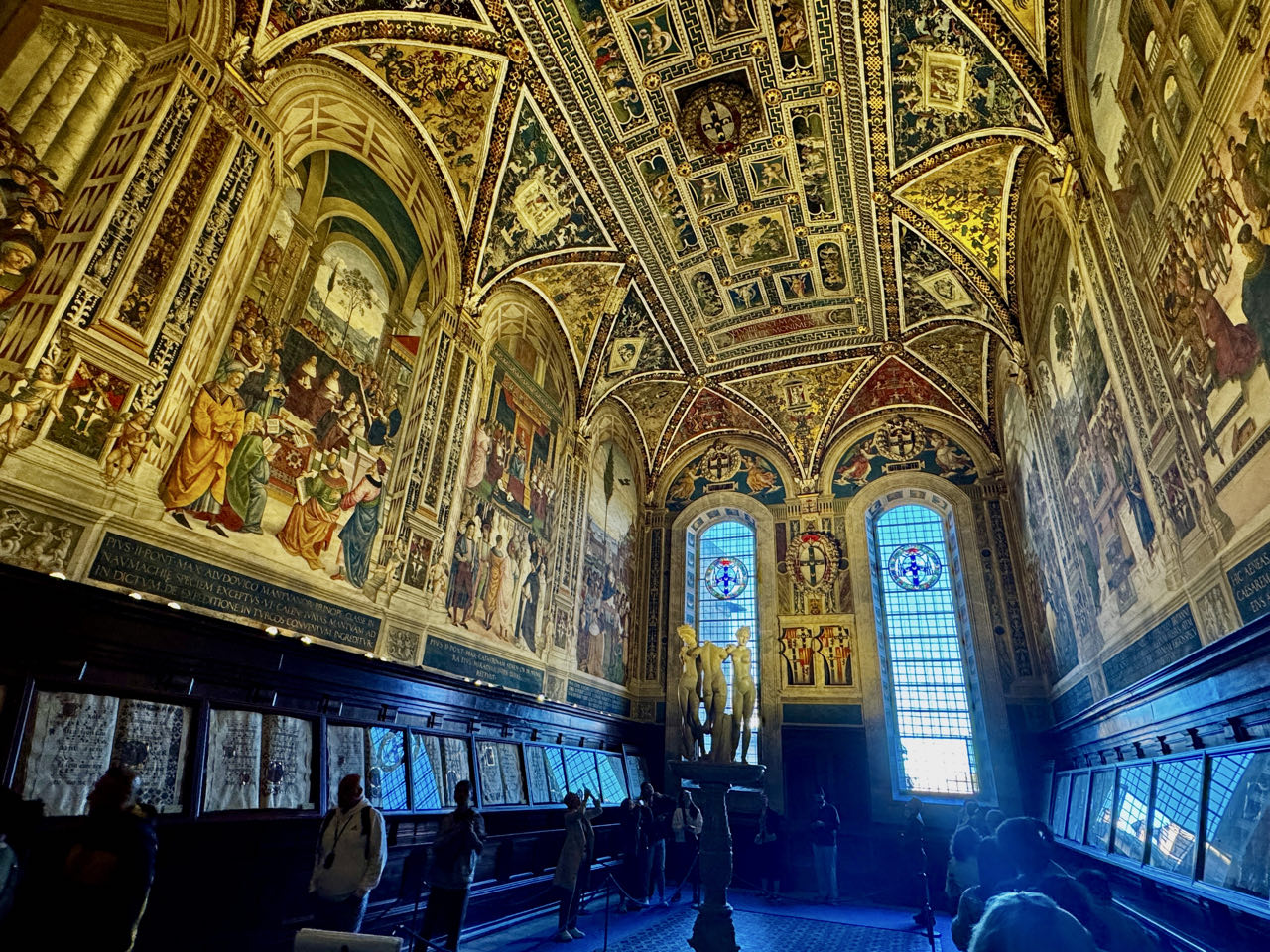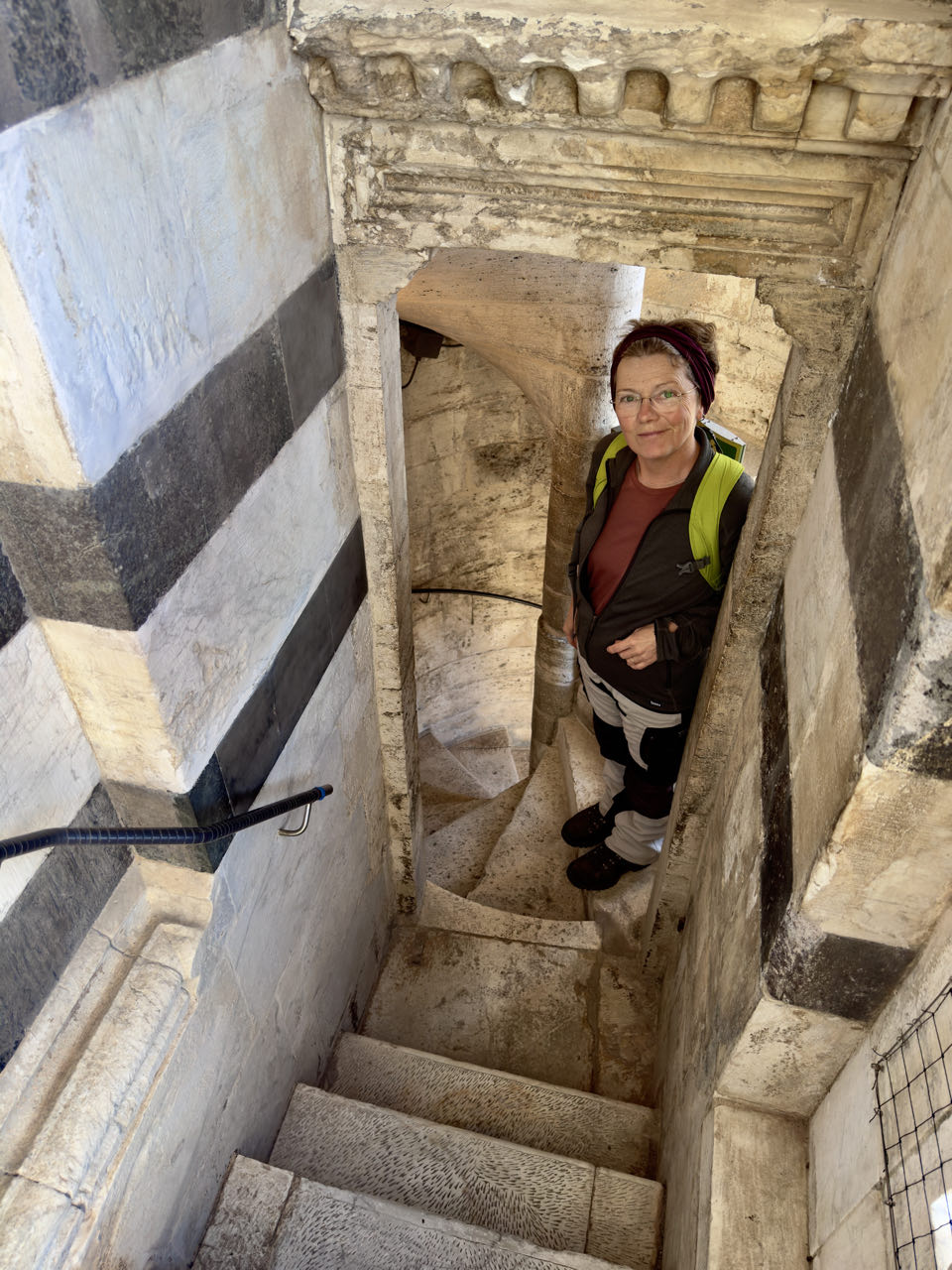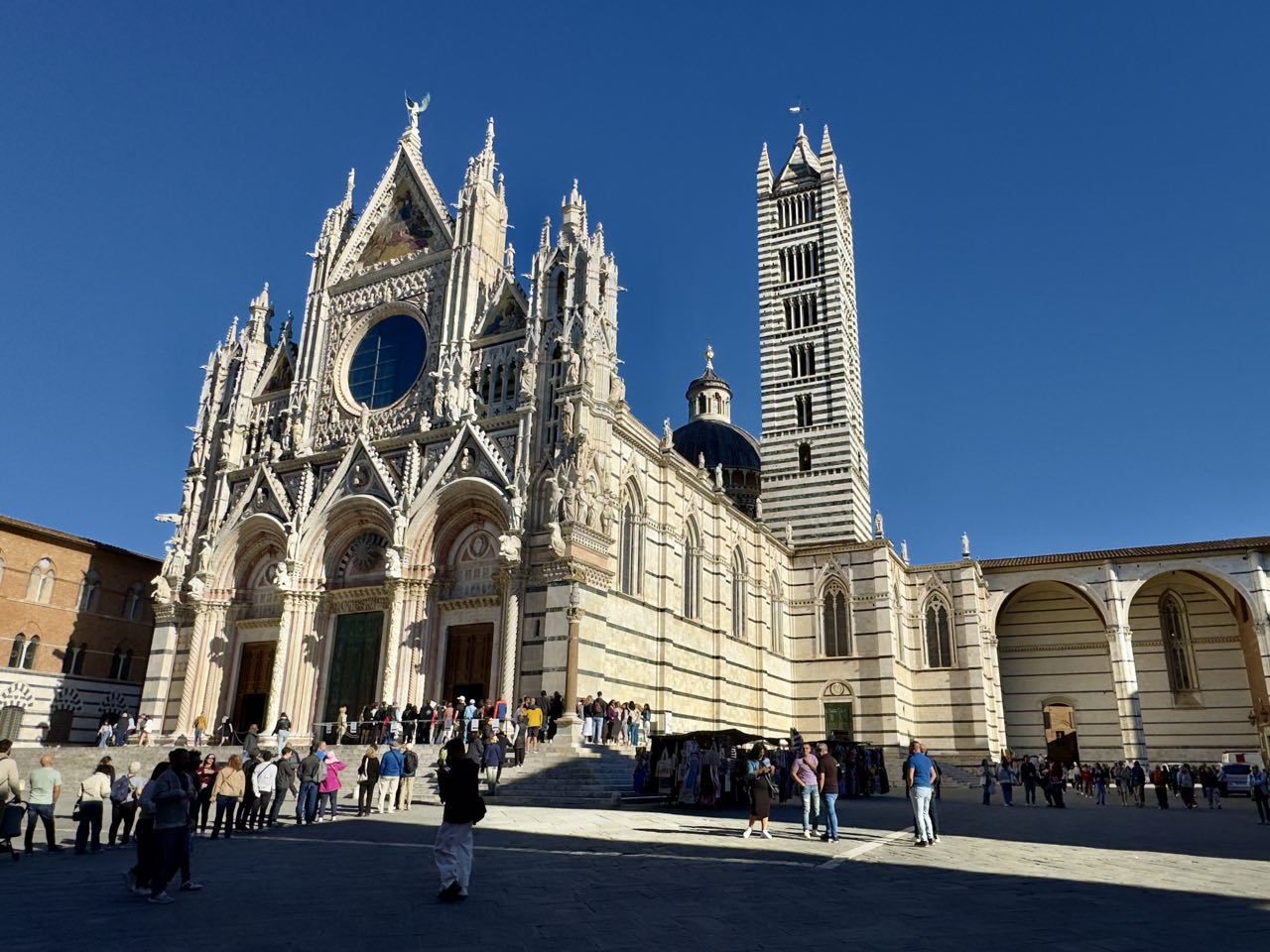 Die Kathedrale sollte einmal größer als der Petersdom werden, wurde aber nie vollendet. Dennoch ist sie mit ihren schwarz-weißen Marmorblöcken mehr als imposant. Wir haben Glück und können auf die normalerweise gesperrte Kuppel und zur Porta del Cielo „Himmelstor“ steigen. Nach dem Aufstieg durch enge Wendeltreppen eröffnet sich uns oben ein fantastischer Blick über Siena und die umliegenden lieblichen Chianti-Weinberge.