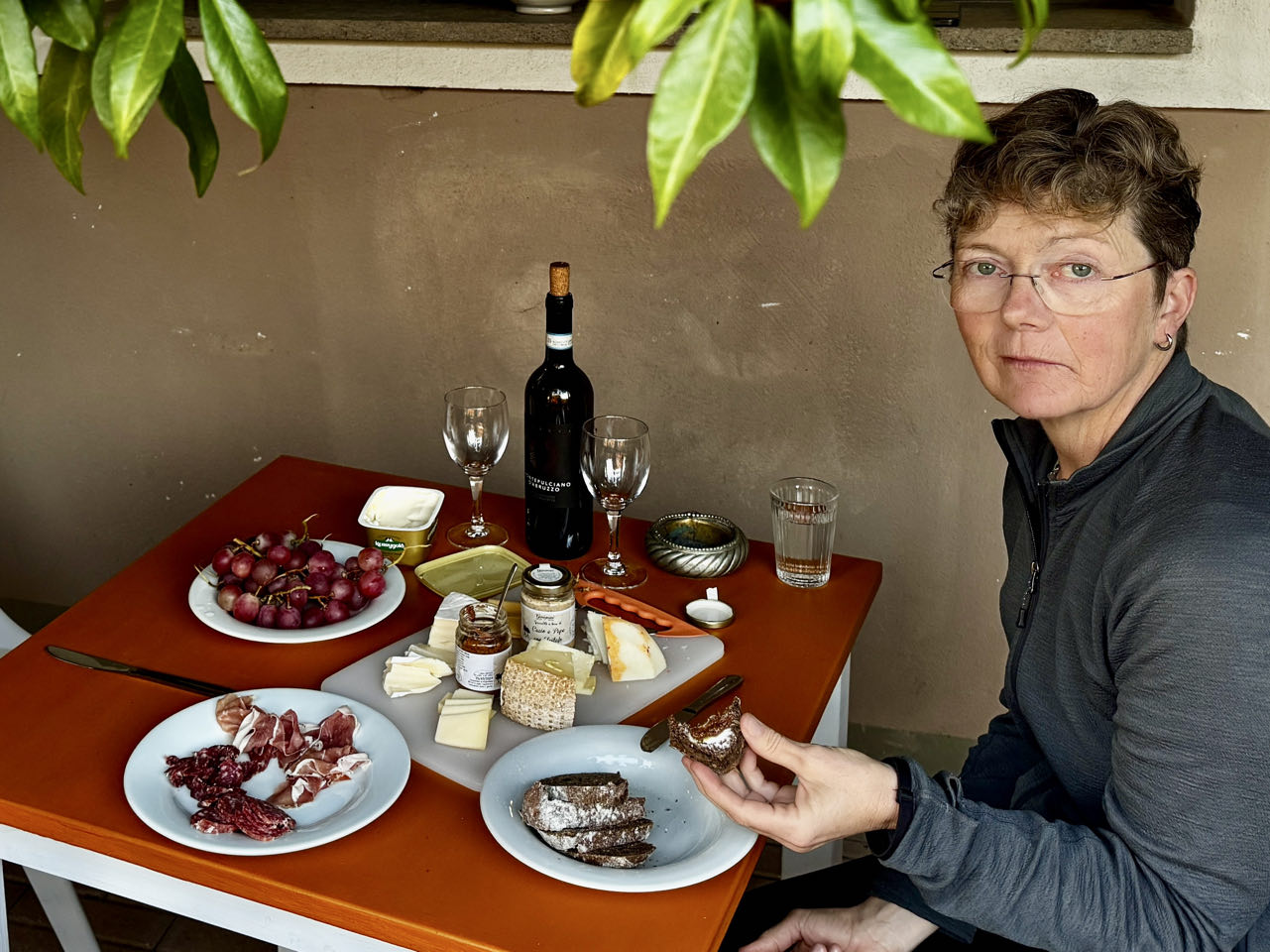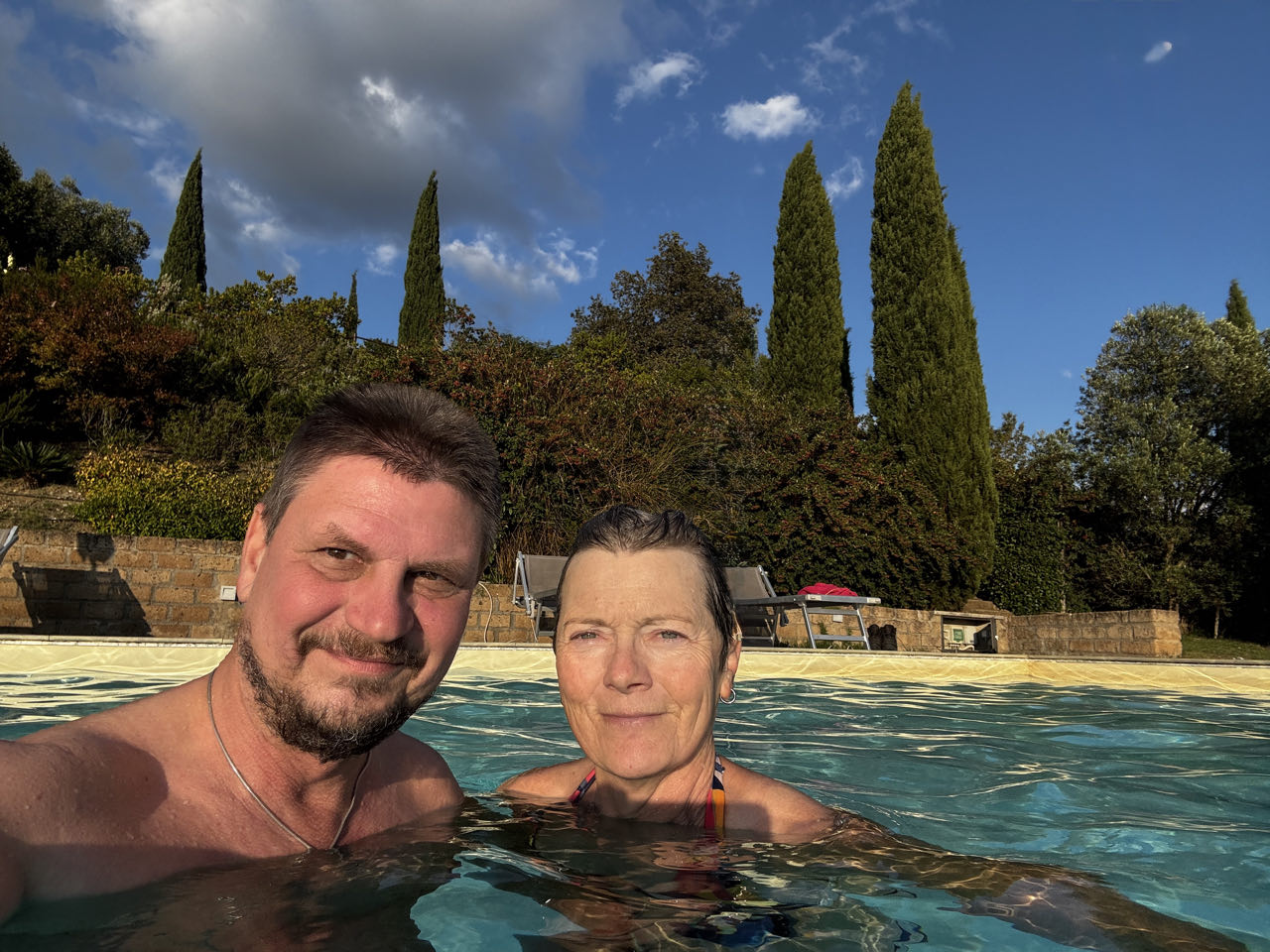 Wir kommen heute im Agriturismo Querica Rossa unter, einem idyllischen Landgut mitten in den Maremma-Bergen. Der Inhaber Paulo hat hier ein fantastisches Kleinod mit Pool (18°C 😅) und gemütlichen Bungalows geschaffen. Auf unserer Terrasse beschließen wir den Abend mit einer Antipasti-Auswahl und einem leckeren Montepulchiano Rosso 😋.