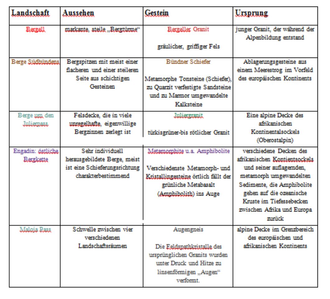 Die Gebirgsmassive haben jeweils einen sehr unterschiedlichen Charakter, aufgrund ihrer vorherrschenden Gesteine. Einen Überblick gibt die Tabelle (2. Abbildung)