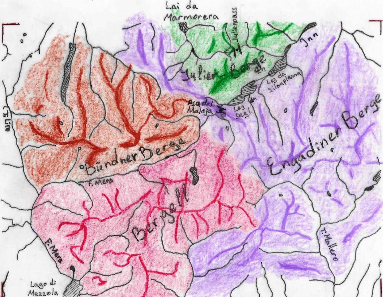 Über dem Malojapass liegt der Piz Lunghin. Hier befindet sich die einzige Dreifachwasserscheide der Alpen. Die Täler nach Norden führen über den Rhein in die Nordsee. Der junge Inn stürzt über einen schmucken Wasserfall in das breite, flache Tal des Oberengadins und entwässert über die Donau ins weit entfernte Schwarze Meer. Das Fornotal und das Val Maroz sind auf das Inntal hin ausgerichtet, wurden aber in der Erdgeschichte von der Mera angezapft und nach Süden abgelenkt. Durch die nahe Erosionsbasis des Mittelmeeres entstand ein steiler, tiefer Talverlauf. Auf der Karte der 3. Abbildung lassen sich die Talverläufe nachvollziehen.