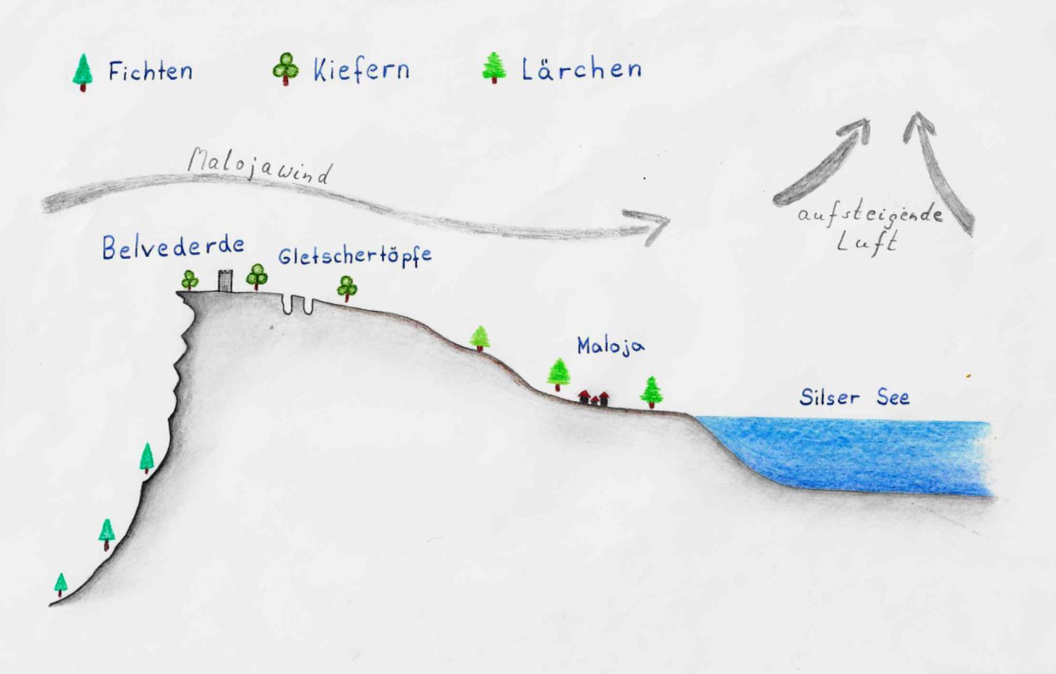 Im Sommer weht stets ein frisches Lüftchen über den Malojapass. Da die Landschaft beidseits des Passes sehr unterschiedlich ist, bauen sich hier lokale Druckgegensätze auf. Es gibt einen Höhenunterschied von 1000m auf kurzer Stecke. Die Luft an den hoch gelegenen, dunklen Felswänden im Engadin erwärmt sich schneller, sodass dort tagsüber ein Hitzetief entsteht. Die in gleicher Höhenlage kältere Luft über dem Bergell strömt zum Druckausgleich nach, sodass der eher frische Malojawind entsteht, wie auf der 4. Graphik veranschaulicht.