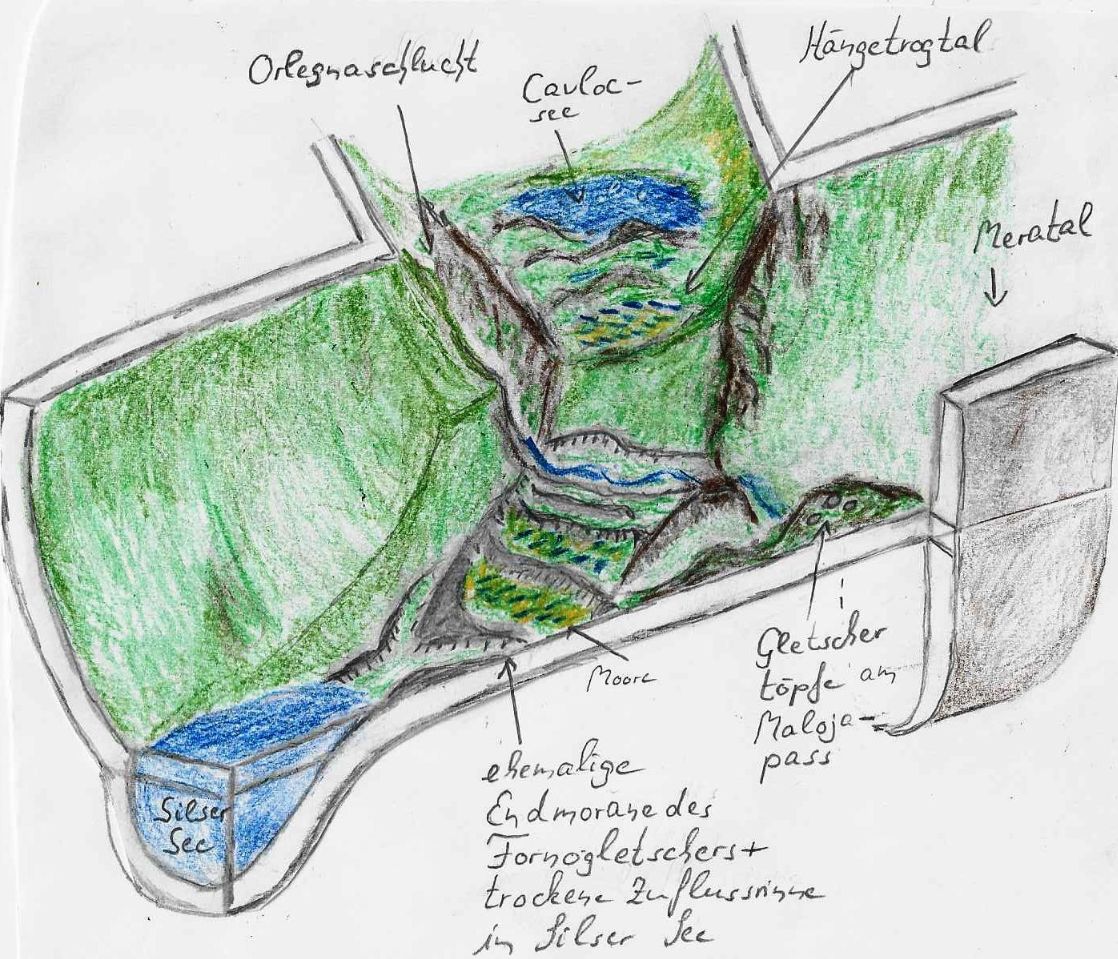 In den Alpen kann man insbesondere beobachten, dass viele Täler mit einer Schlucht beginnen. So beginnt auch das Fornotal mit der Orlegnaschlucht. Diese konnte sich durch das große Gefälle zwischen Cavlocsee und Malojapass tief eingraben. Hier sieht man deutlich, dass der höhere Talboden des Fornotals förmlich über der Passhöhe des Malojapasses hängt. Man spricht von einem Hängetrogtal. Es entstand, da der Inngletscher am Malojapass größer und stärker war und dementsprechend auch sein Tal tiefer ausschleifen konnte als der dazu relativ kürzere Fornogletscher. Durch das abrupt steilere Gefälle zwischen den unterschiedlich hohen Talböden entstand schließlich die Orlegnaschlucht. Südwestlich der Orlegna liegt der Cavlocsee, ein sogenannter Gletscherwannensee, der durch den Fornogletscher entstand. Am Widerstand eines harten Felsriegels kam es in der Eiszeit zur Druckschmelze des Eises. Ein Wasserfilm entstand, so dass das Eis über den Felsriegel glitt, ohne ihn völlig abzutragen. Im Vorfeld des Felsriegels schliff der Fornogletscher eine Mulde aus. Als der Gletscher sich nach der Eiszeit zurückzog, blieb dort der Cavlocsee übrig.