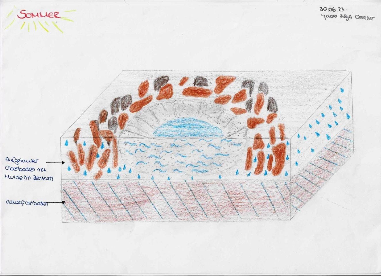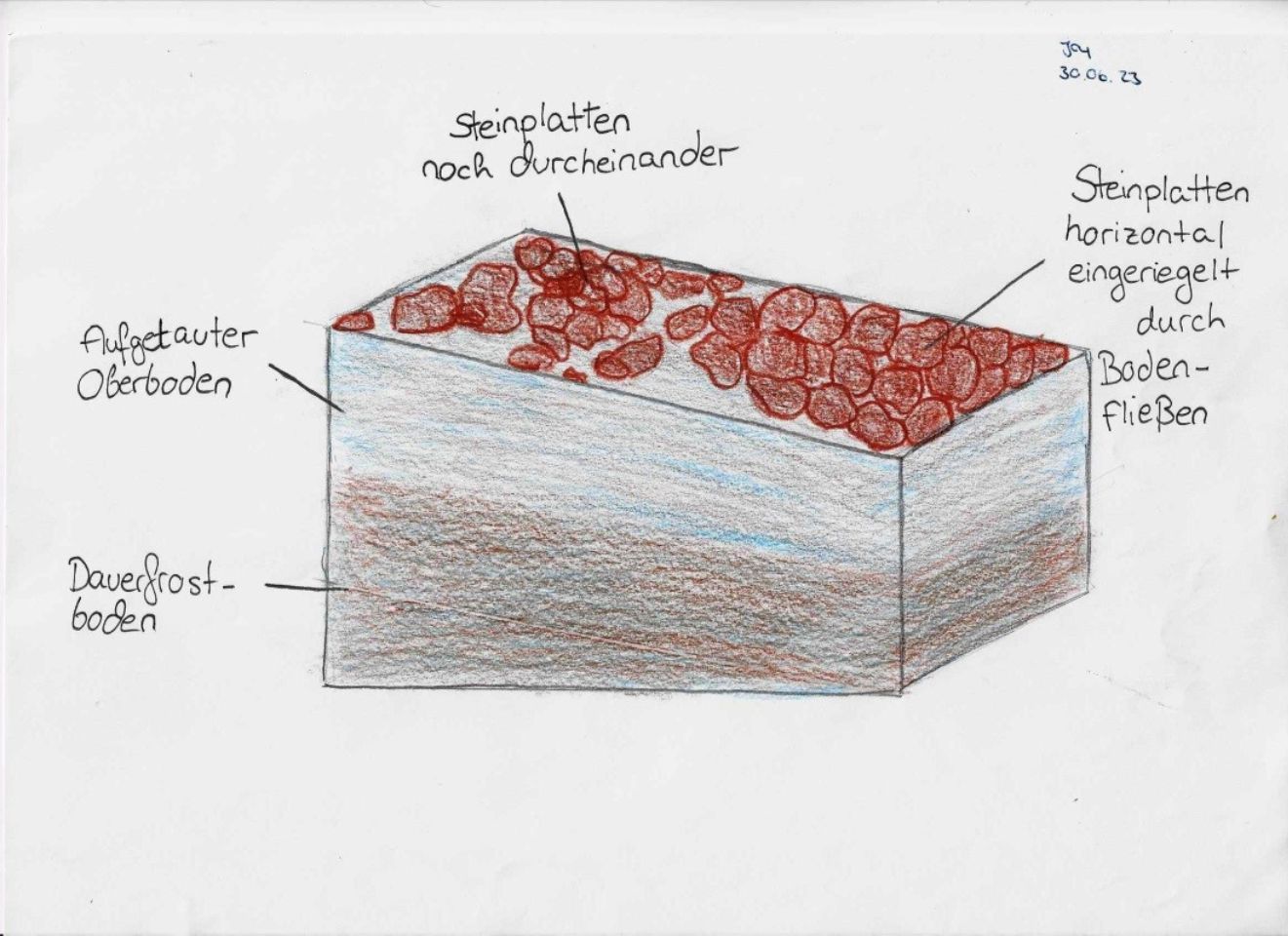 Viel deutlicher treten die Spuren des Bodenfließens ins Auge. In leichten Hanglangen gerät der Boden durch das sommerliche Auftauen der oberen Bodenschicht auf dem darunterliegenden Dauerforstboden in eine langsame, kriechende Bewegung und fängt an zu fließen. Die Steine fließen mit und lagern sich wie „gepflastert" ab, sodass man gut darauf gehen kann.