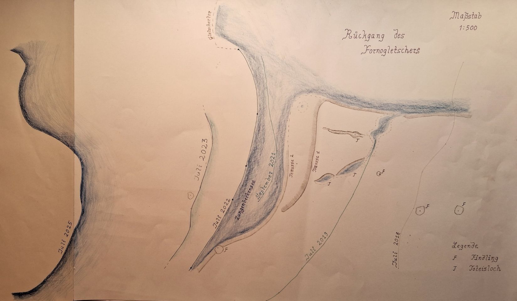 Das Gletschervorfeld ändert von Jahr zu Jahr sein Gesicht, auch wenn der Formenschatz ähnlich bleibt. So finden sich meist Zungenbecken, die den Gletscherstand der Vorjahre markieren; Toteislöcher, - kleine kreisrunde Seen, die sich bilden, wenn eine mit Gestein verschüttete Eisscholle schmilzt (siehe erste Zeichnung) und Terrassenstufen. Sie entstehen durch die unterschiedliche Wasserführung des Gletscherbaches im Winter und im Sommer: Während er im Winter bei geringer Wasserführung aufschottert, gräbt er sich im Sommer bei hohem Schmelzwasseraufkommen in seine eigenen Schotter unter Bildung einer Terassenstufe wieder ein.
