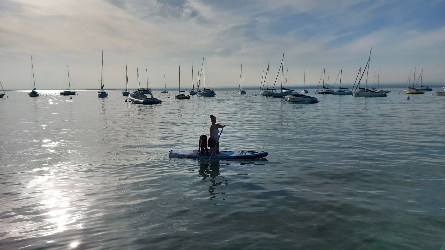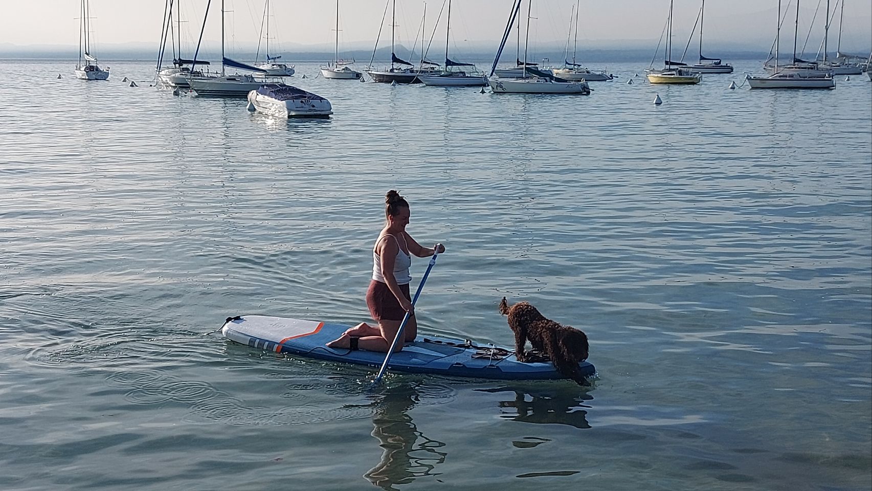 Am See schwingt sich Fini auf's Board und dreht souverän die ersten Runden. Flips und ich waten hinterher. Als er nicht mehr stehen kann schwimmt er Fini hinterher und versucht auf's Board zu kommen. Allein schafft er's (noch) nicht, also helfe ich ihm hoch. Er steht zunächst etwas wackelig, später sitzt und liegt er aber auch. Ganz geheuer ist ihm die Sache aber nicht. Wir drehen zu dritt eine Runde und ich paddel auch allein zwischen den kleinen Segelbooten herum, die hier vor Anker liegen.