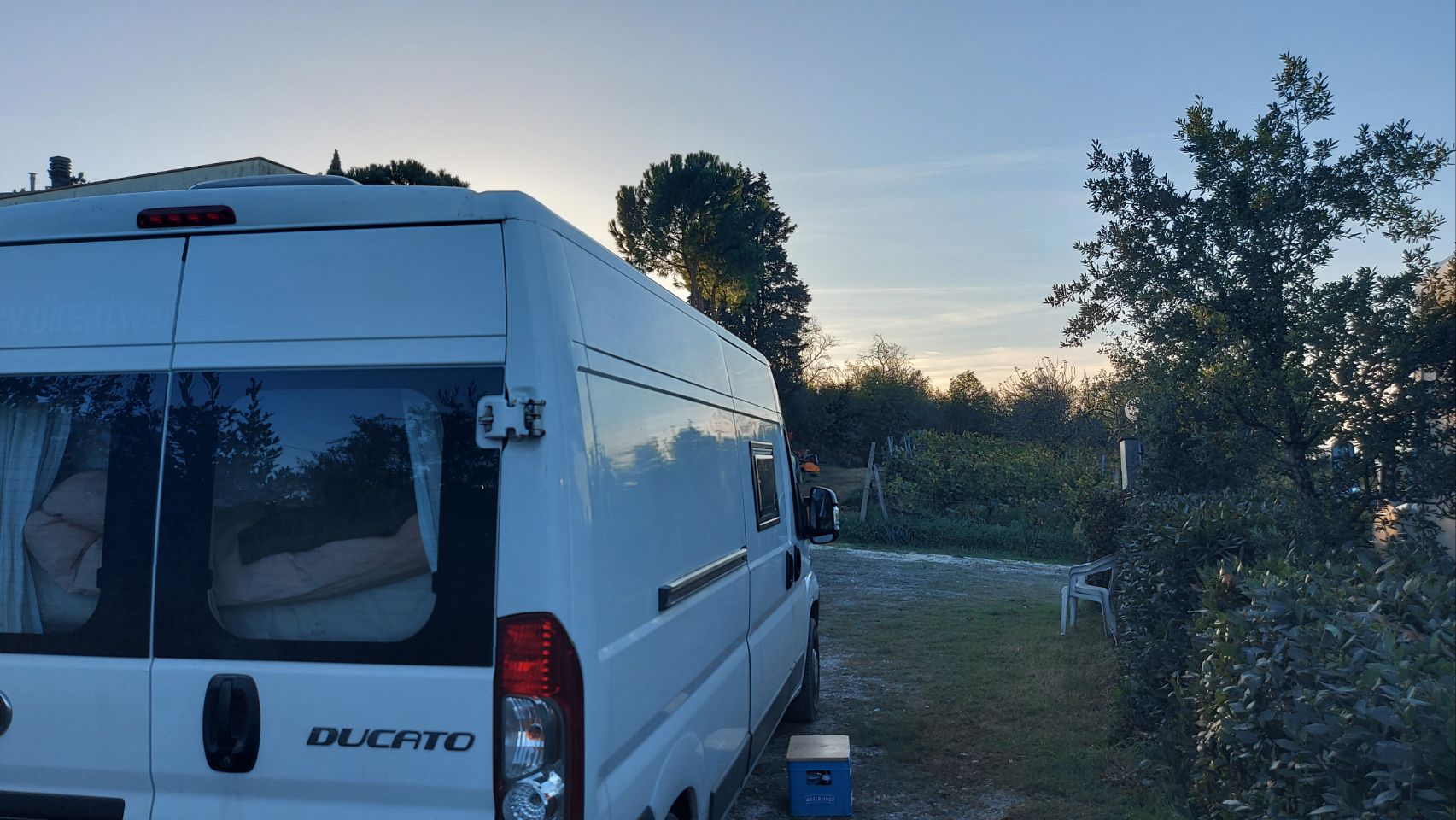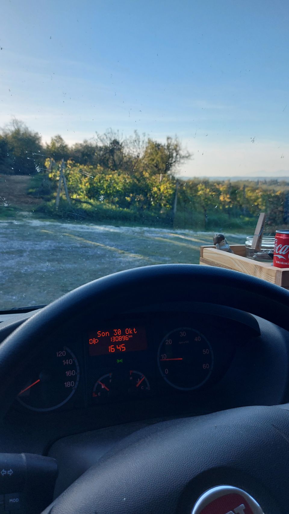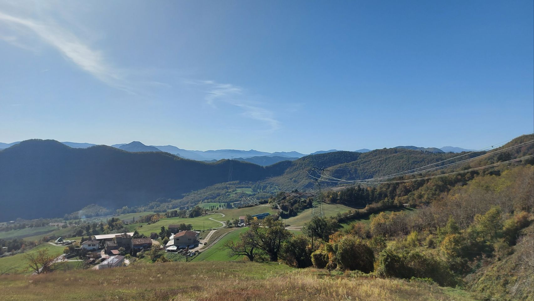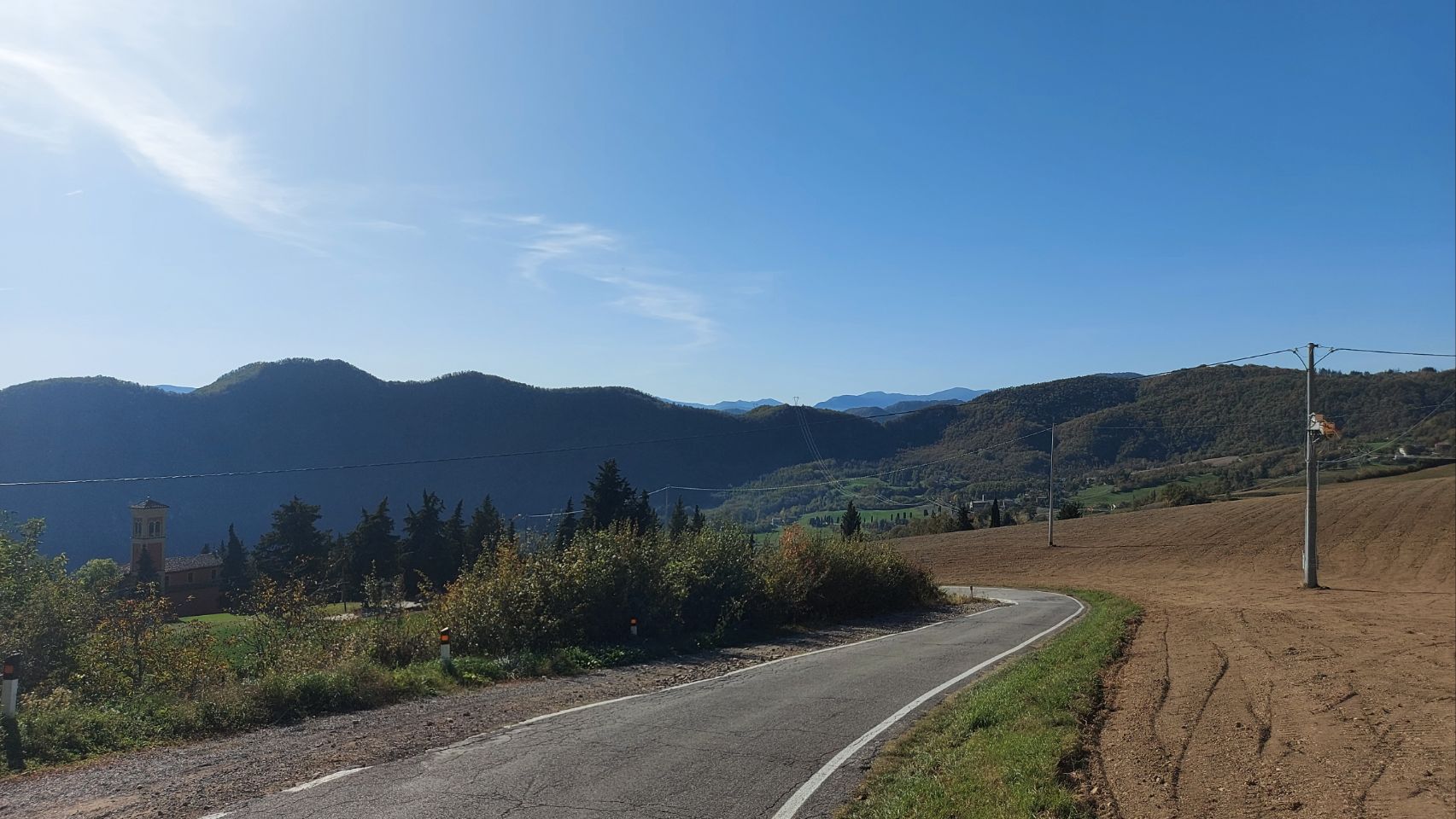 Nach einem herzhaften Sonntags-Frühstück mit Rührei, Speck und Baked Beans fahren wir gegen zehn Uhr vom Platz (die Uhr am Autodisplay ist noch nicht umgestellt). Wir lassen es darauf ankommen und wählen die zeitlich längere Strecke. Wir gehen davon aus dadurch mehr von der Landschaft zu sehen und sparen die Mautgebühr für die Autobahn. Unser Ziel ist ein kleiner Weinbauernhof in der Nähe von Florenz. Die Strecke dahin hat es in sich, es geht in scharfen Kurven steil bergauf und bergab, Fini steuert Frido sicher über die Piste und wir haben immer wieder tolle Ausblicke über die waldreichen Hügel und Täler. Bei Gegenverkehr wird es auf den schmalen Straßen zum Teil sehr knapp. Gut, dass nicht so viel los ist. Auf die zahlreichen Radfahrer müssen wir dafür umso mehr achten.